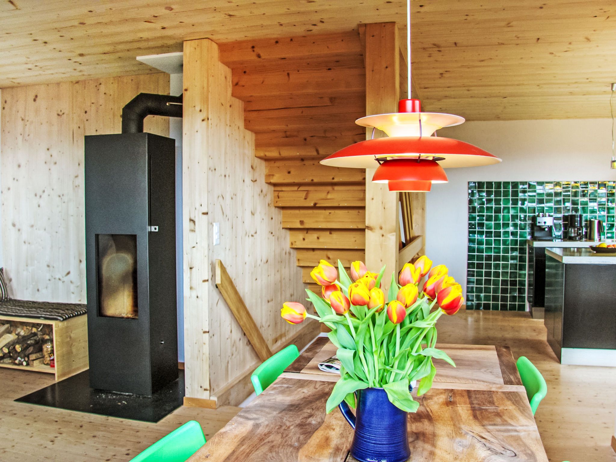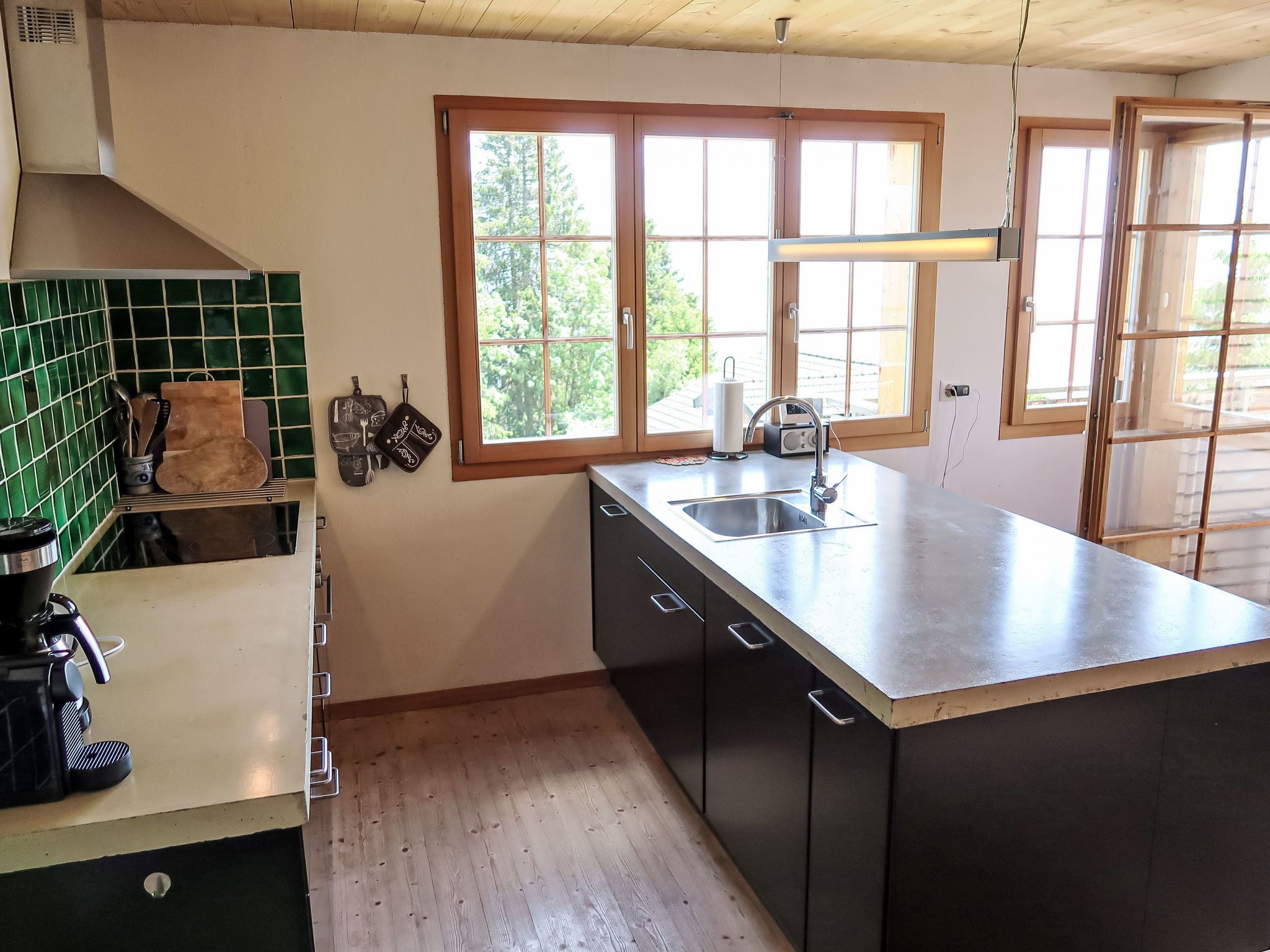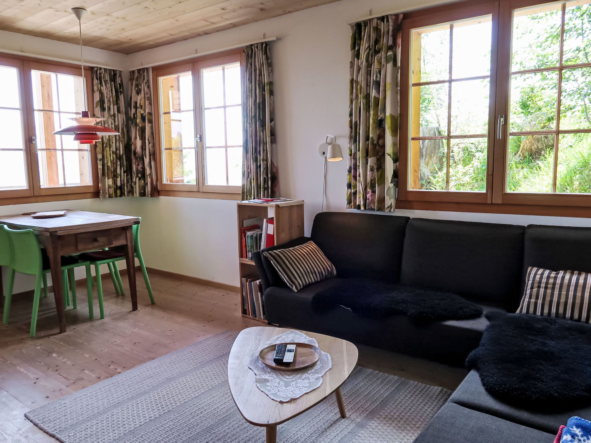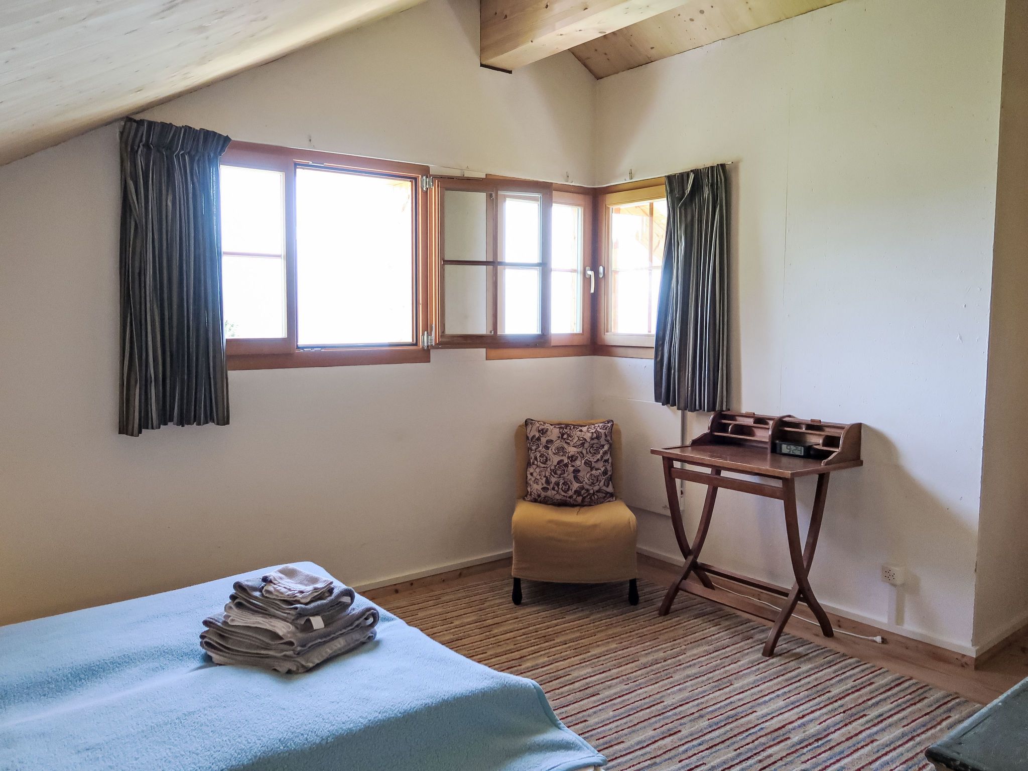 3-Zimmer-Chalet 92 m2 auf 2 Stockwerken. Hell, teilweise abgeschrägt, komfortabel und mit viel Holz eingerichtet: offenes Wohn-/Esszimmer mit Schwedenofen, Esstisch, Kabel-TV, Flachbildschirm und Radio. Ausgang zur Terrasse. Offene Küche (Backofen, Geschirrspüler, 4 Glaskeramikplatten, Tiefkühler, elektrische Kaffeemaschine, Fondue Set (Käse)). Bad/Dusche/WC. E-Heizung, Holzheizung, Boiler (300 Liter). Obergeschoss: 1 Doppelzimmer mit 1 Doppelbett (180 cm, Länge 200 cm). 1 Zimmer mit 2 Betten (90 cm, Länge 200 cm), 1 Schlafmöglichkeit (80 cm, Länge 180 cm). Holzdielenboden. Terrasse 12 m2. Terrassenmöbel, Liegestühle (2). Sehr schöne Panoramasicht auf die Berge, das Tal und die Landschaft. Zur Verfügung: Kinderhochstuhl, Babybett, Wickelkommode. Internet (WLAN, gratis). Garage in 100 m. Bitte beachten: geeignet für Familien. Nichtraucher-Unterkunft.