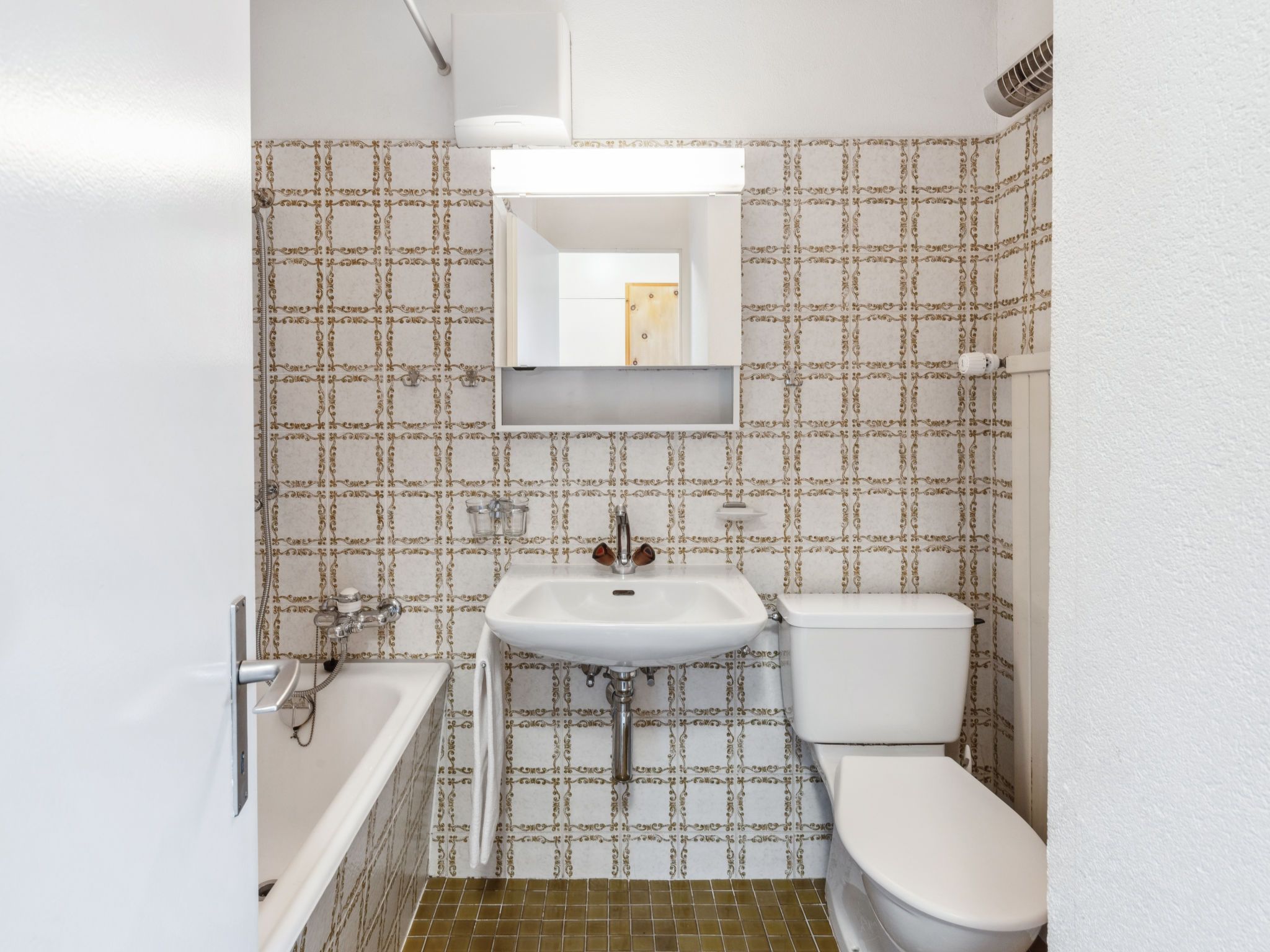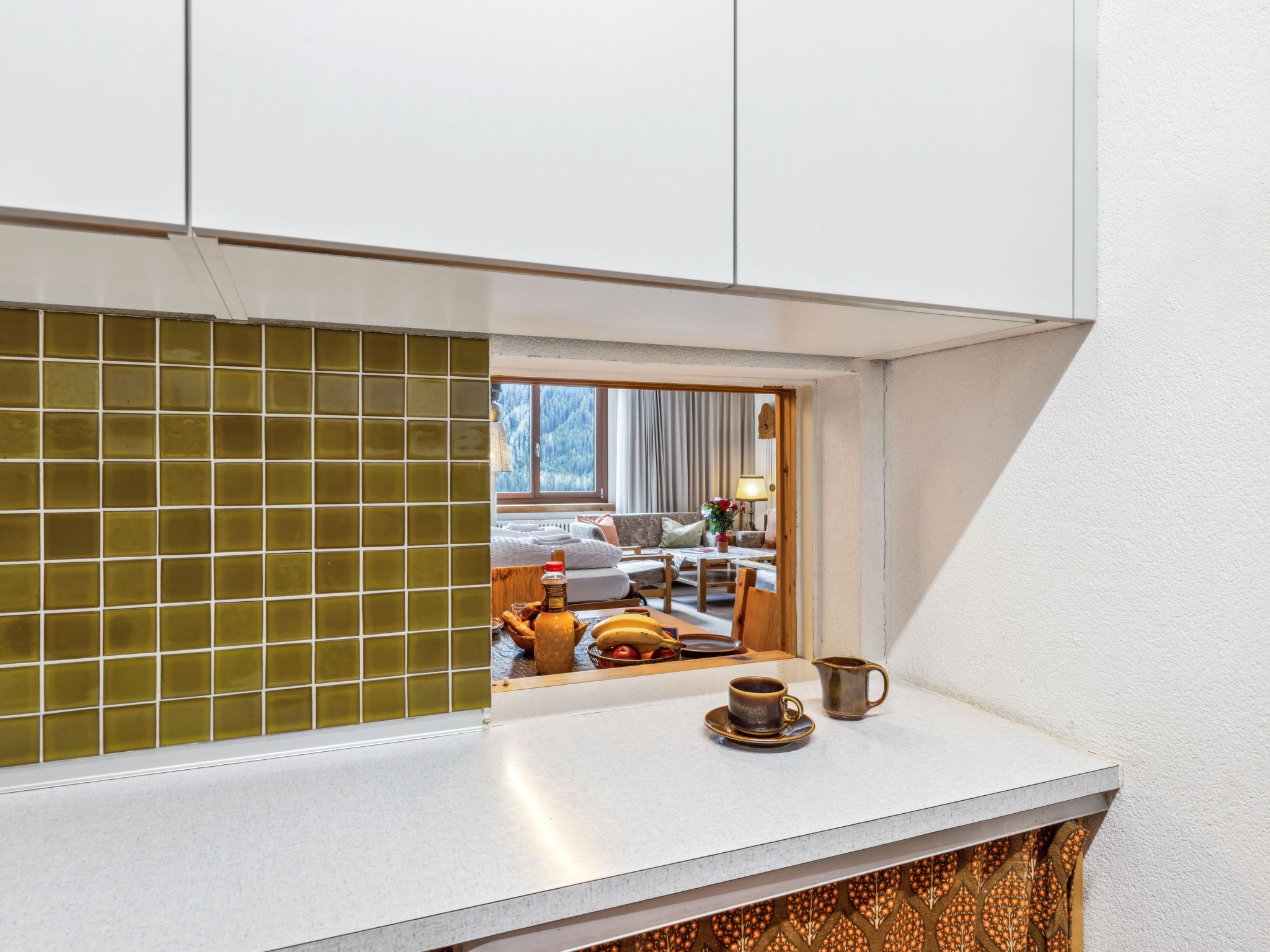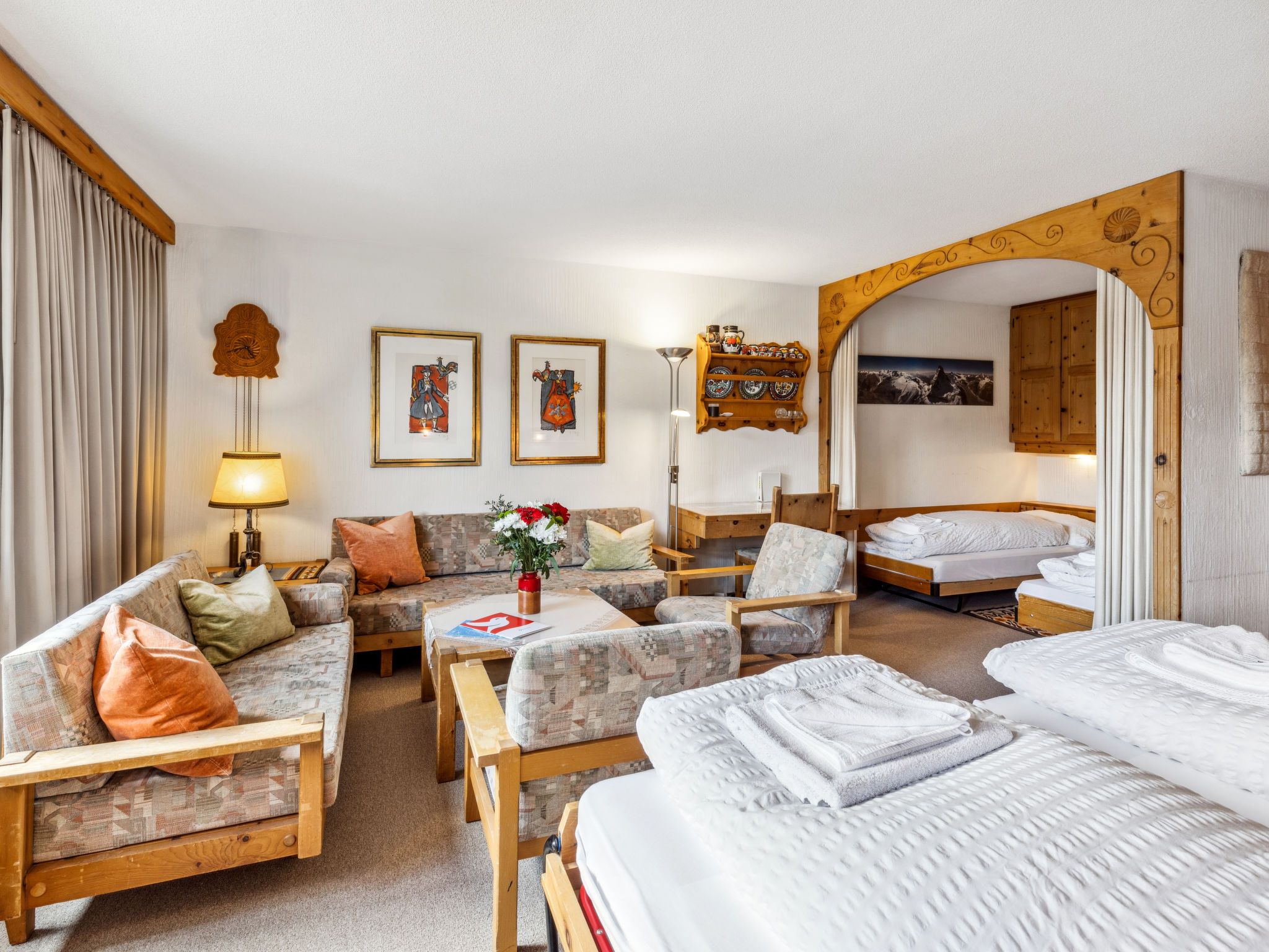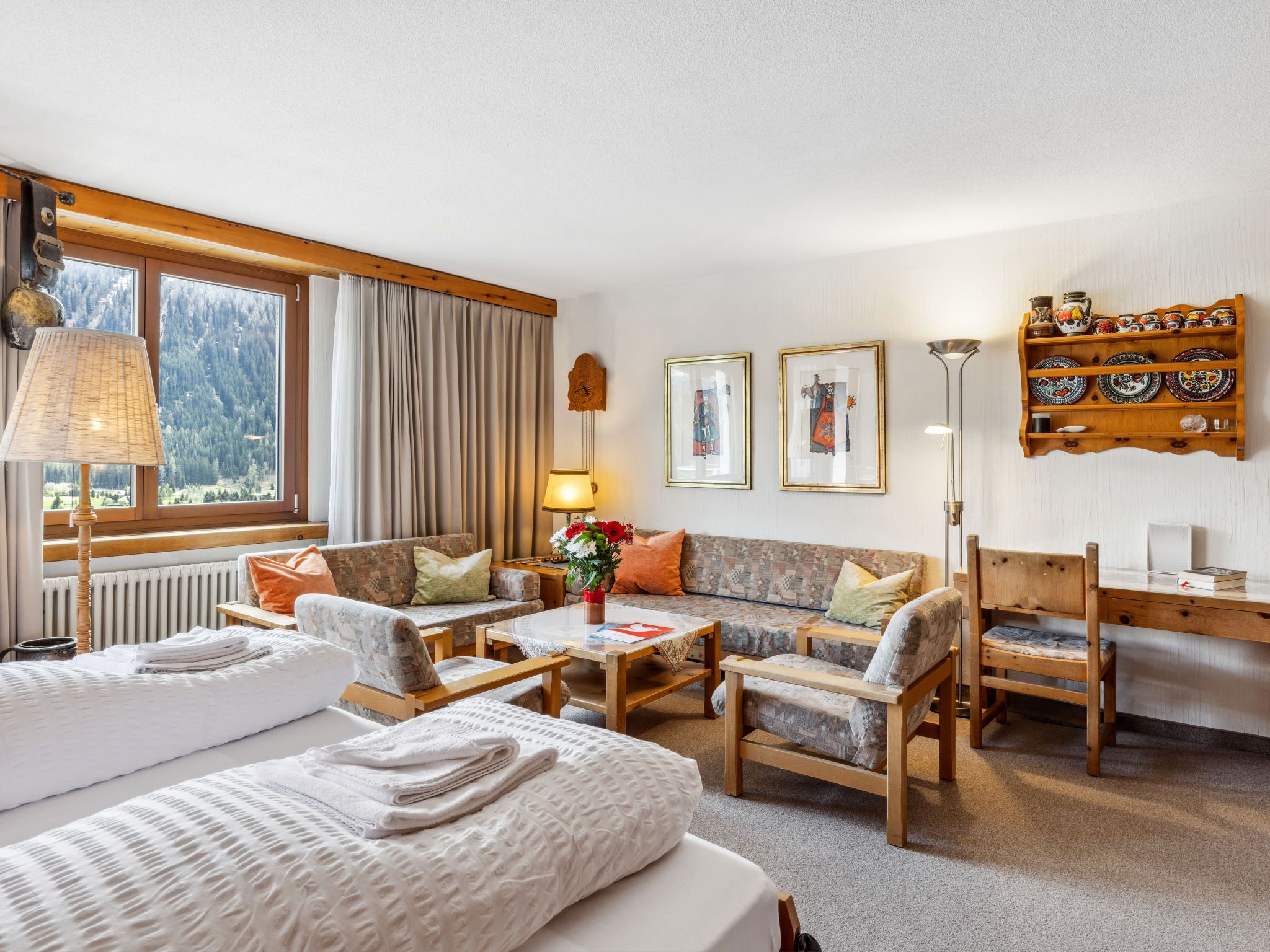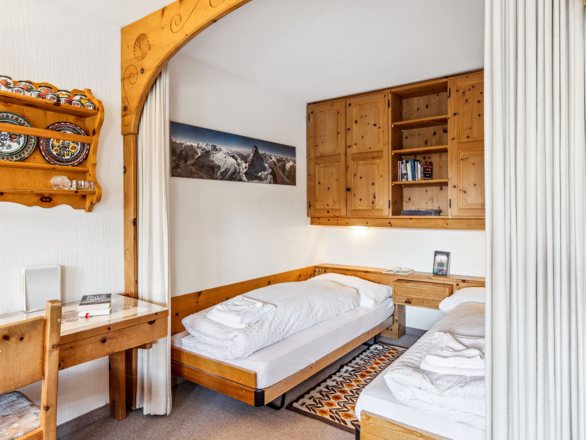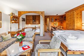 1-Zimmer-Wohnung 50 m2 im 5. Stock. Komfortabel und rustikal eingerichtet: Wohn-/Esszimmer mit 2 Wandschrankbetten und Kabel-TV (Flachbildschirm), Radio. Ausgang zum Balkon. Schlafnische mit Vorhang mit 2 Betten. Küche (Backofen, Geschirrspüler, 4 Glaskeramikplatten). Bad/WC. Balkon 7 m2, Südlage. Schöne Sicht auf die Berge, die Landschaft und die Ortschaft. Zur Verfügung: Internet (WLAN, gratis). Parkplatz. Bitte beachten: Nichtraucher-Unterkunft. Anstelle eines abgeschlossenen Schlafzimmers befinden sich manche Schlafplätze in einem offenen Bereich (Galerie, Nische etc.). 11195
