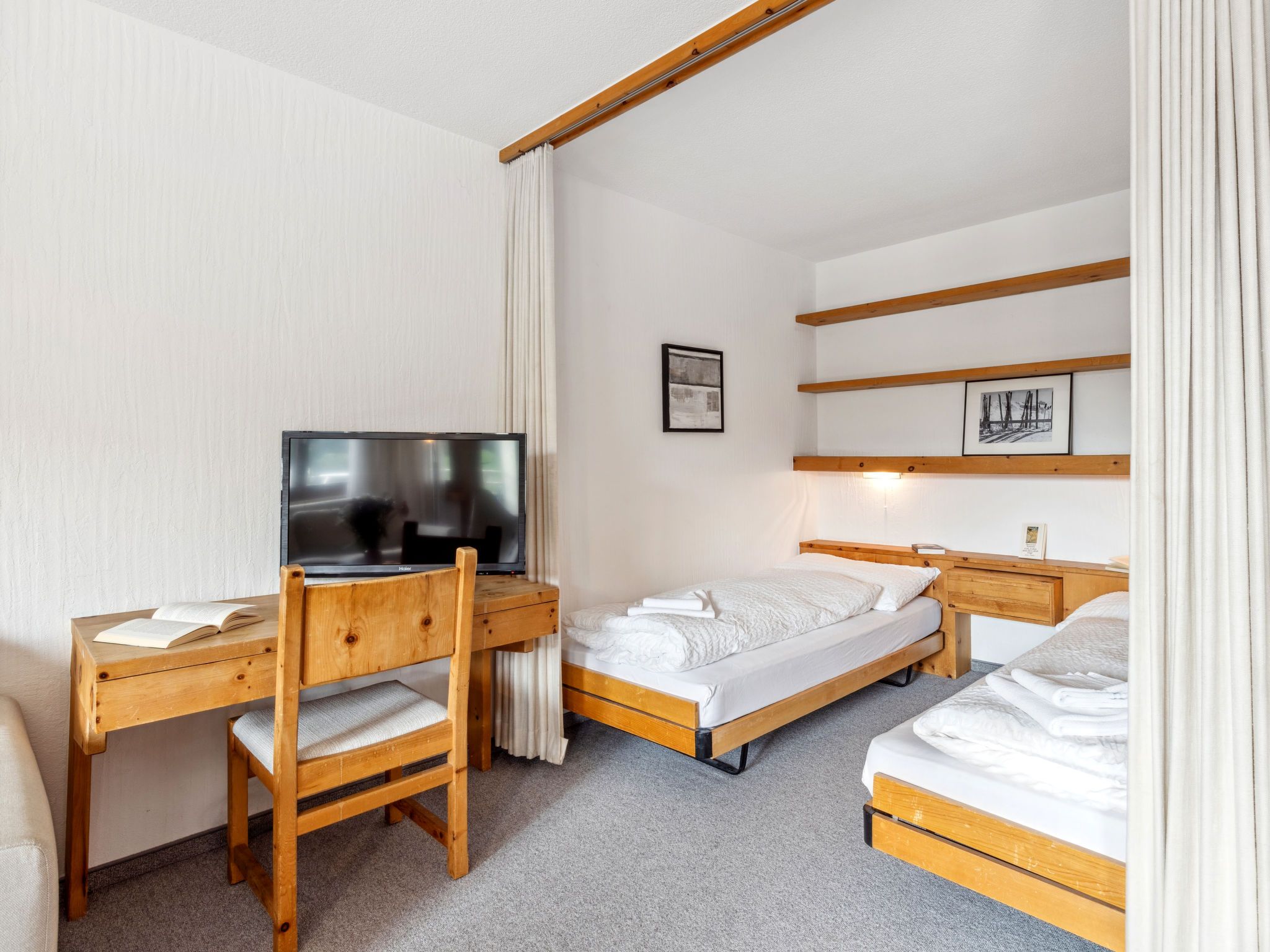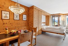 1-Zimmer-Wohnung 50 m2 im 1. Stock. Komfortabel und rustikal eingerichtet: Wohn-/Esszimmer mit 2 Wandschrankbetten und Kabel-TV (Flachbildschirm), Radio. Ausgang zum Balkon. Schlafnische mit Vorhang mit 2 Betten. Küche (4 Kochplatten, Backofen). Bad/WC. Balkon 7 m2, Südlage. Schöne Sicht auf die Berge, die Landschaft und die Ortschaft. Zur Verfügung: Internet (WLAN, gratis). Parkplatz. Bitte beachten: Nichtraucher-Unterkunft. Anstelle eines abgeschlossenen Schlafzimmers befinden sich manche Schlafplätze in einem offenen Bereich (Galerie, Nische etc.). 12610