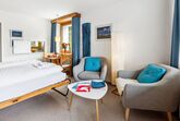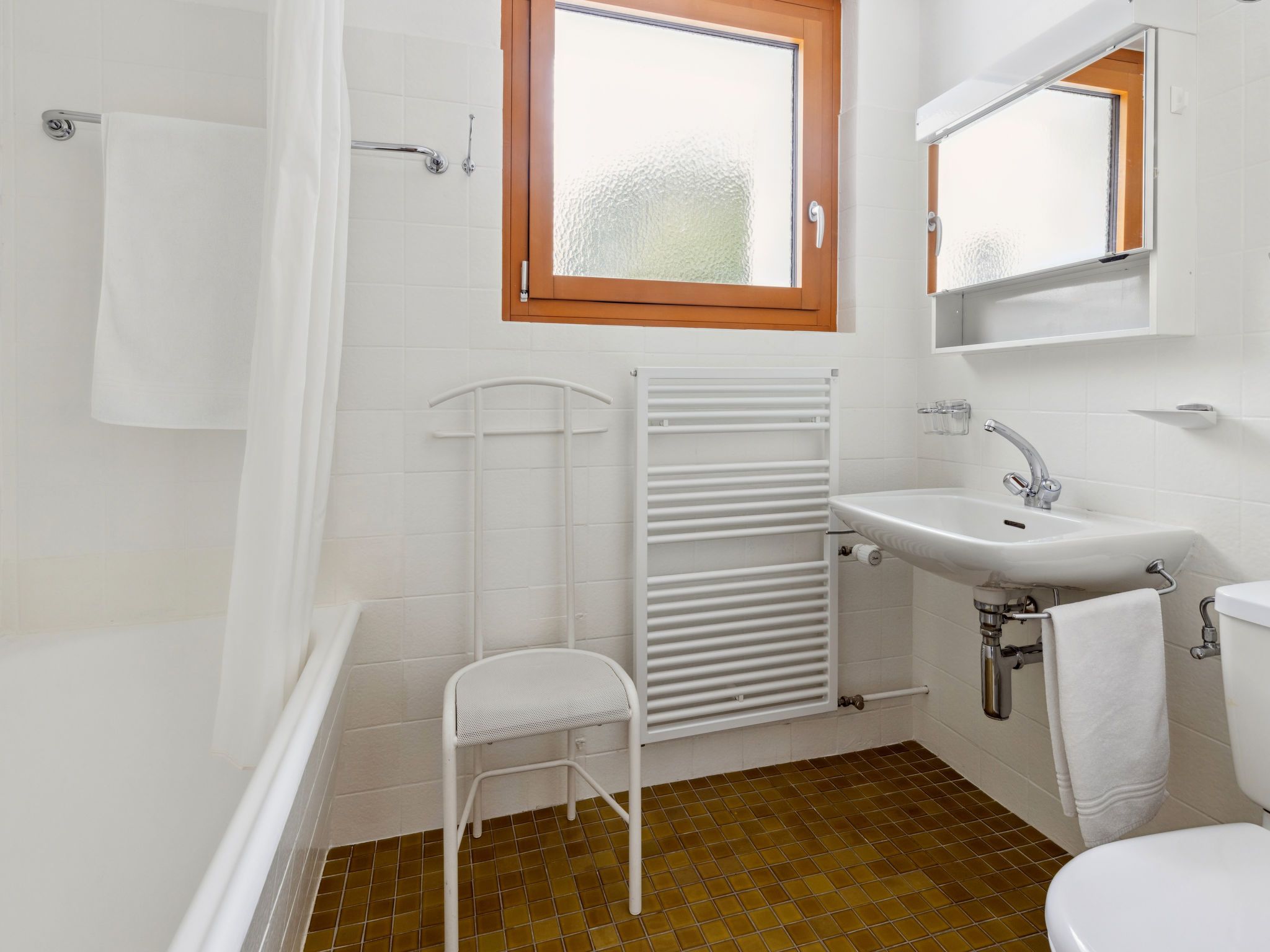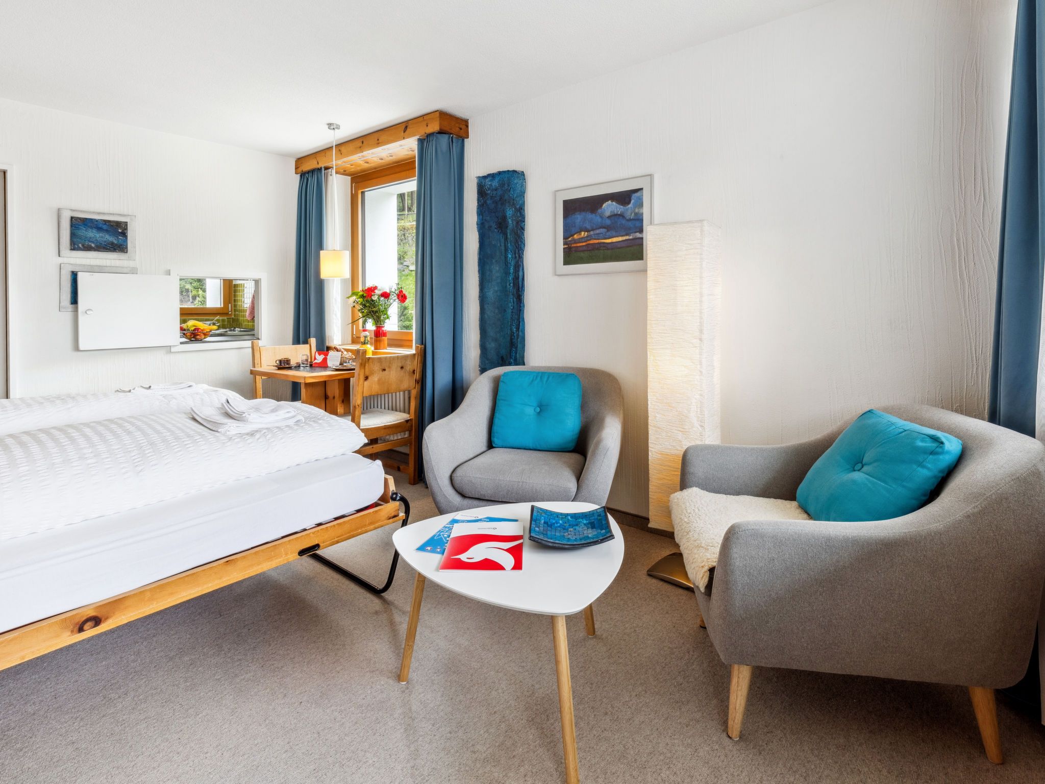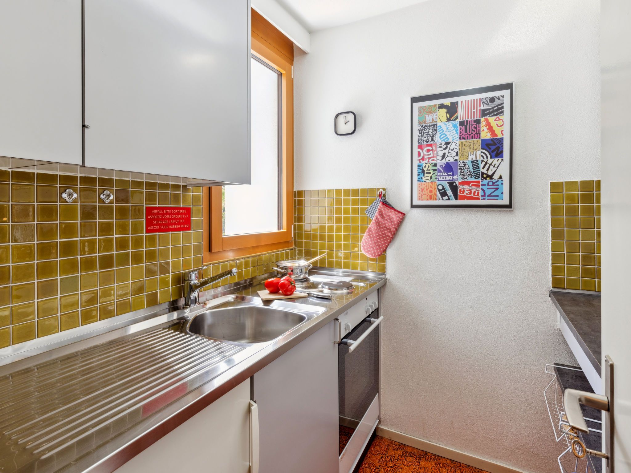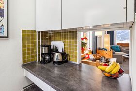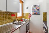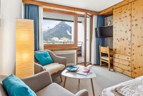 1-Zimmer-Wohnung 30 m2 im 5. Stock. Rustikal und gemütlich eingerichtet: Wohn-/Esszimmer mit 2 Wandschrankbetten und Kabel-TV (Flachbildschirm), Radio. Ausgang zum Balkon. Küche (2 Kochplatten, Backofen). Bad/WC. Balkon 7 m2, Ostlage. Schöne Sicht auf die Berge, die Landschaft und die Ortschaft. Zur Verfügung: Internet (WLAN, gratis). Parkplatz. Bitte beachten: Nichtraucher-Unterkunft. 40105
