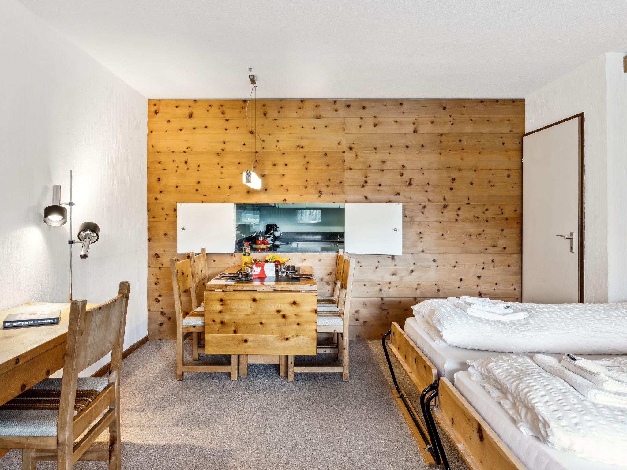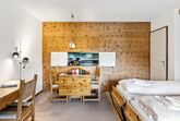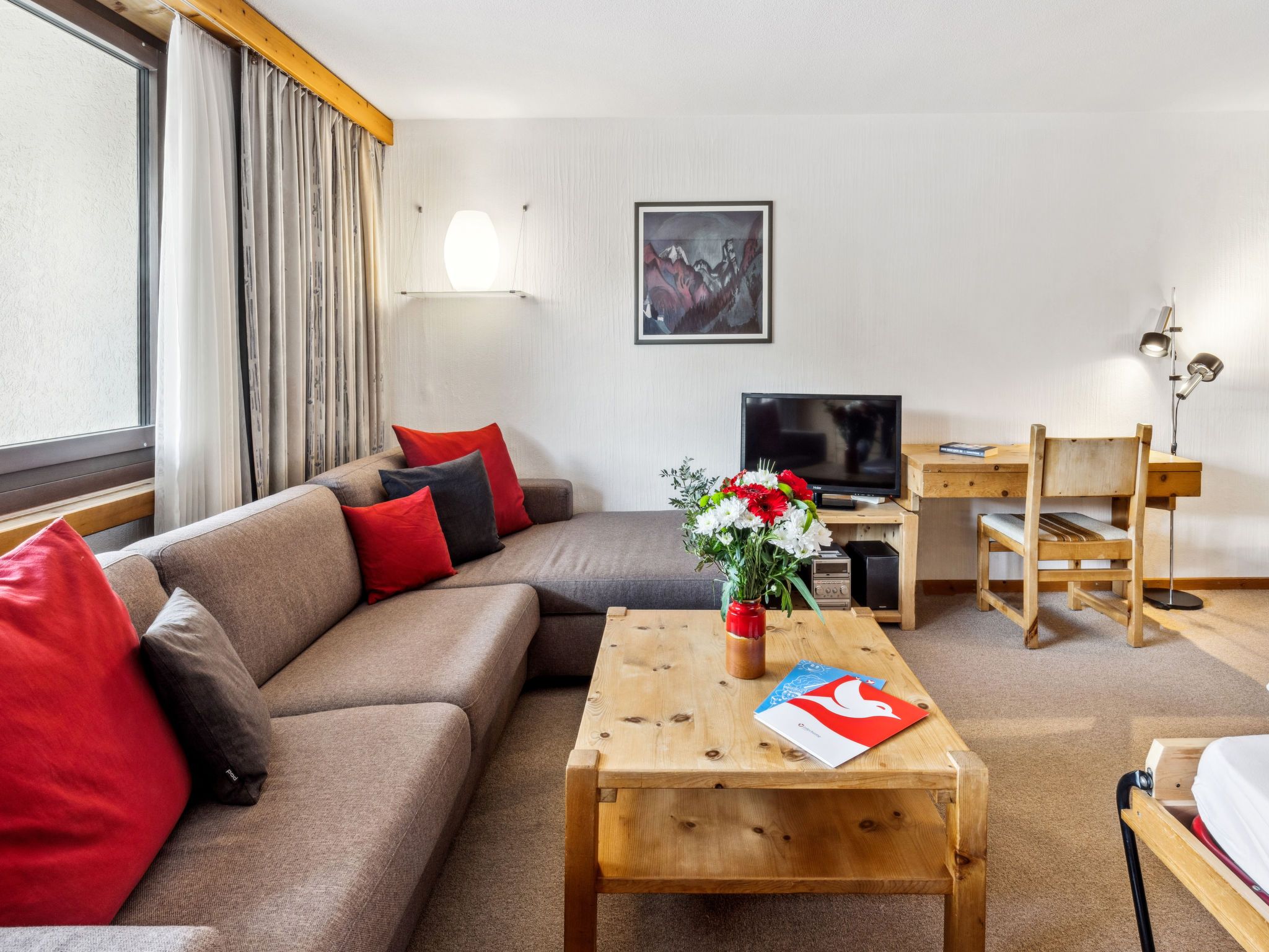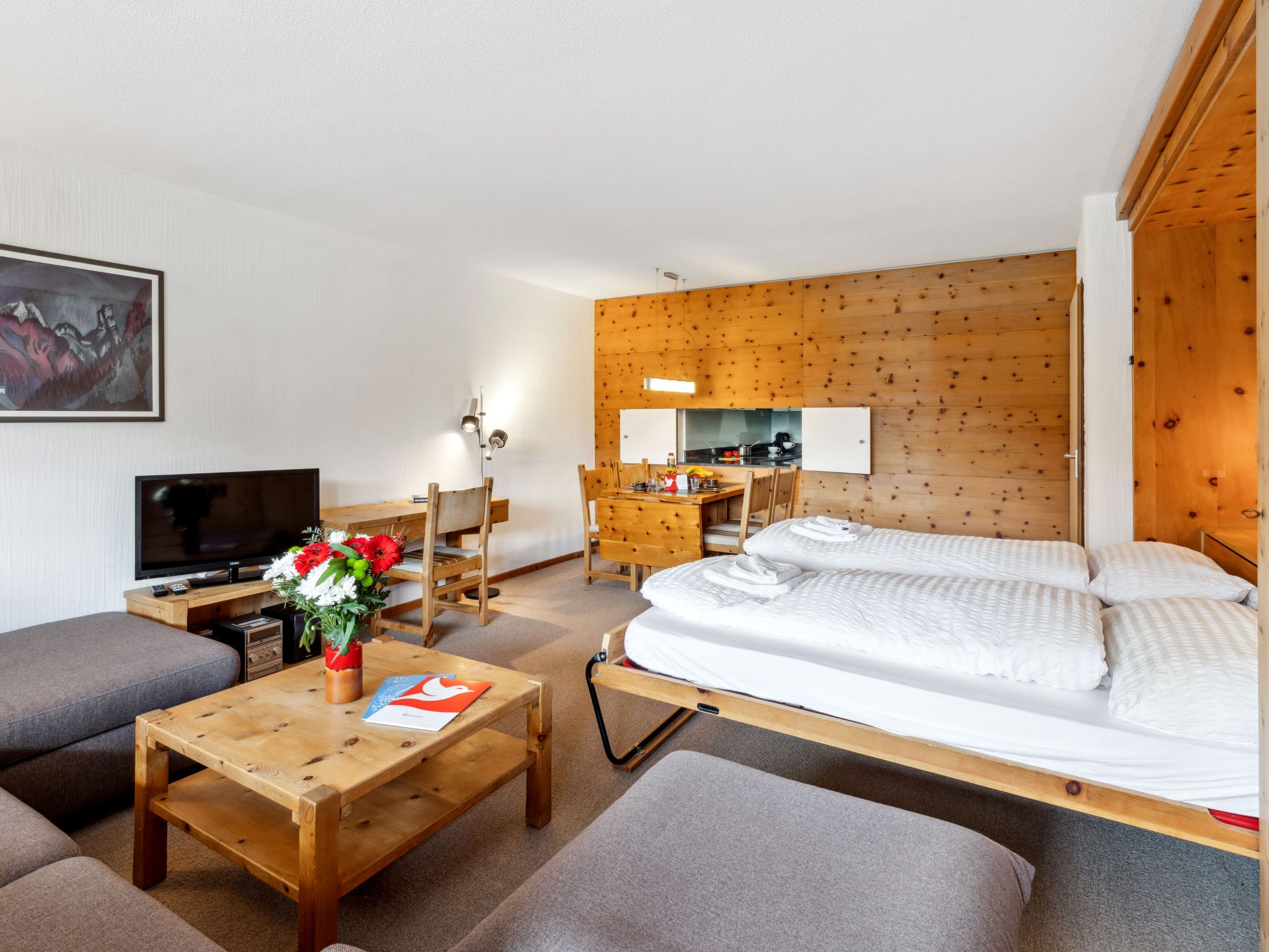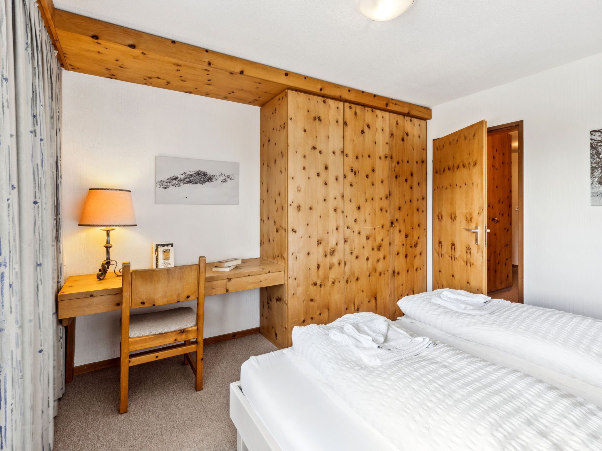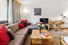 Guardaval Apt 503, 2-Zimmer-Wohnung 65 m2 im 5. Stock, Südostlage. Komfortabel und rustikal eingerichtet: Wohn-/Esszimmer mit 2 Wandschrankbetten und Kabel-TV (Flachbildschirm), Radio. Ausgang zum Balkon. 1 Zimmer mit 2 Betten. Küche (Backofen, Geschirrspüler, 4 Glaskeramikplatten). Bad/WC, sep. WC. Balkon 7 m2. Schöne Sicht auf die Berge, die Landschaft und die Ortschaft. Zur Verfügung: Internet (WLAN, gratis). Parkplatz. Bitte beachten: Nichtraucher-Unterkunft. 12047