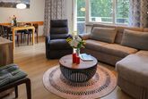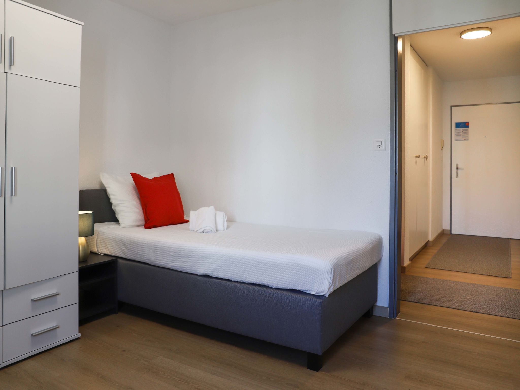 Allod Park Haus C 301, 3-Zimmer-Wohnung 80 m2 im 3. Stock, Südostlage. Geräumig und hell, vollständig renoviert im Jahre 2022, schön und geschmackvoll eingerichtet: Wohn-/Esszimmer mit Kabel-TV und Flachbildschirm. Ausgang zum Balkon, Richtung Südosten. 1 Zimmer mit 1 franz. Bett (1 x 180 cm, Länge 200 cm), Waschbecken und sep. WC. 1 Zimmer mit 2 Betten (90 cm). Küche (Backofen, Geschirrspüler, 4 Glaskeramikplatten, Wasserkocher, elektrische Kaffeemaschine, Kapseln für die Kaffeemaschine (Nespresso) extra, Fondue Set (Käse)). Dusche/WC, Doppelwaschbecken. Heizung. Holzdielenboden. Balkon, Südostlage. Balkonmöbel. Schöne Panoramasicht auf die Berge und Park. Zur Verfügung: Waschmaschine (extra). Wäschetrockner (extra). Internet (WLAN, gratis). Parkplatz (extra, 1 Auto), Garage (extra) (1 Auto) beim Haus. Bitte beachten: Nichtraucher-Unterkunft. Apt Mit Rollstuhl max 70cm erreichbar. Badezimmer Türe 75cm. 12379