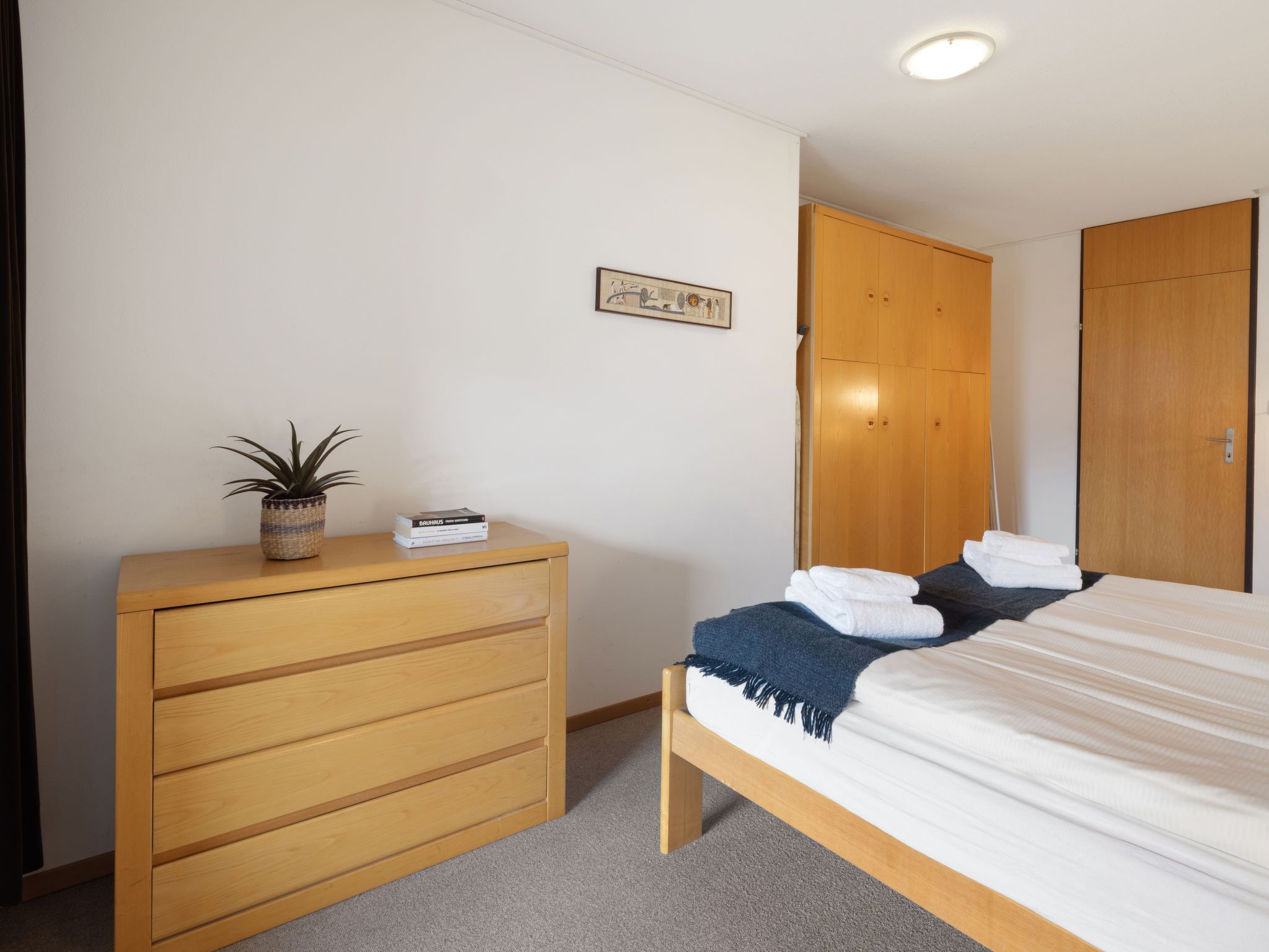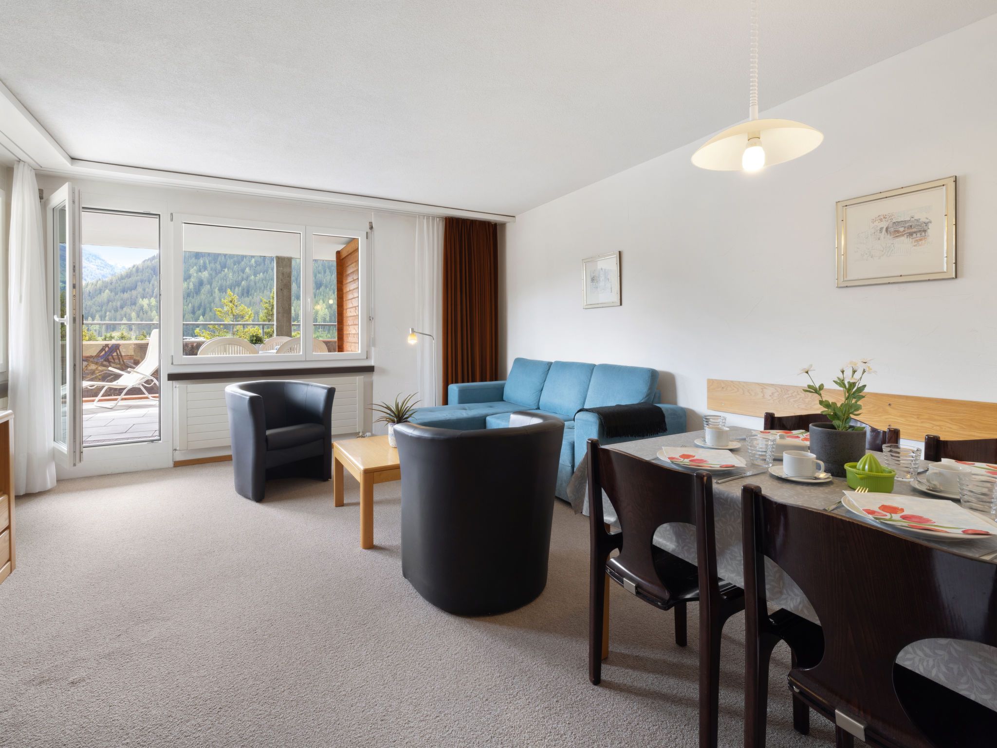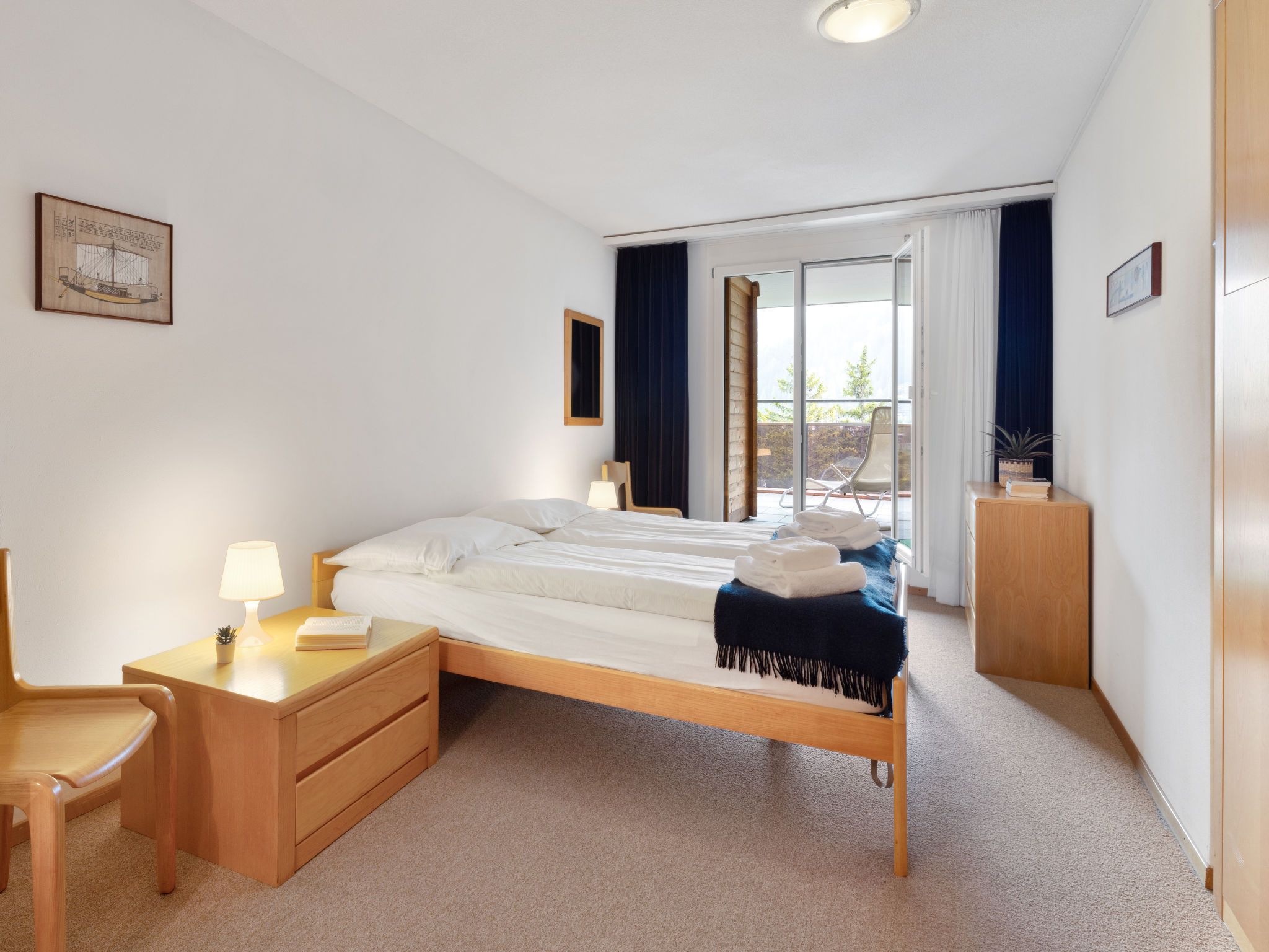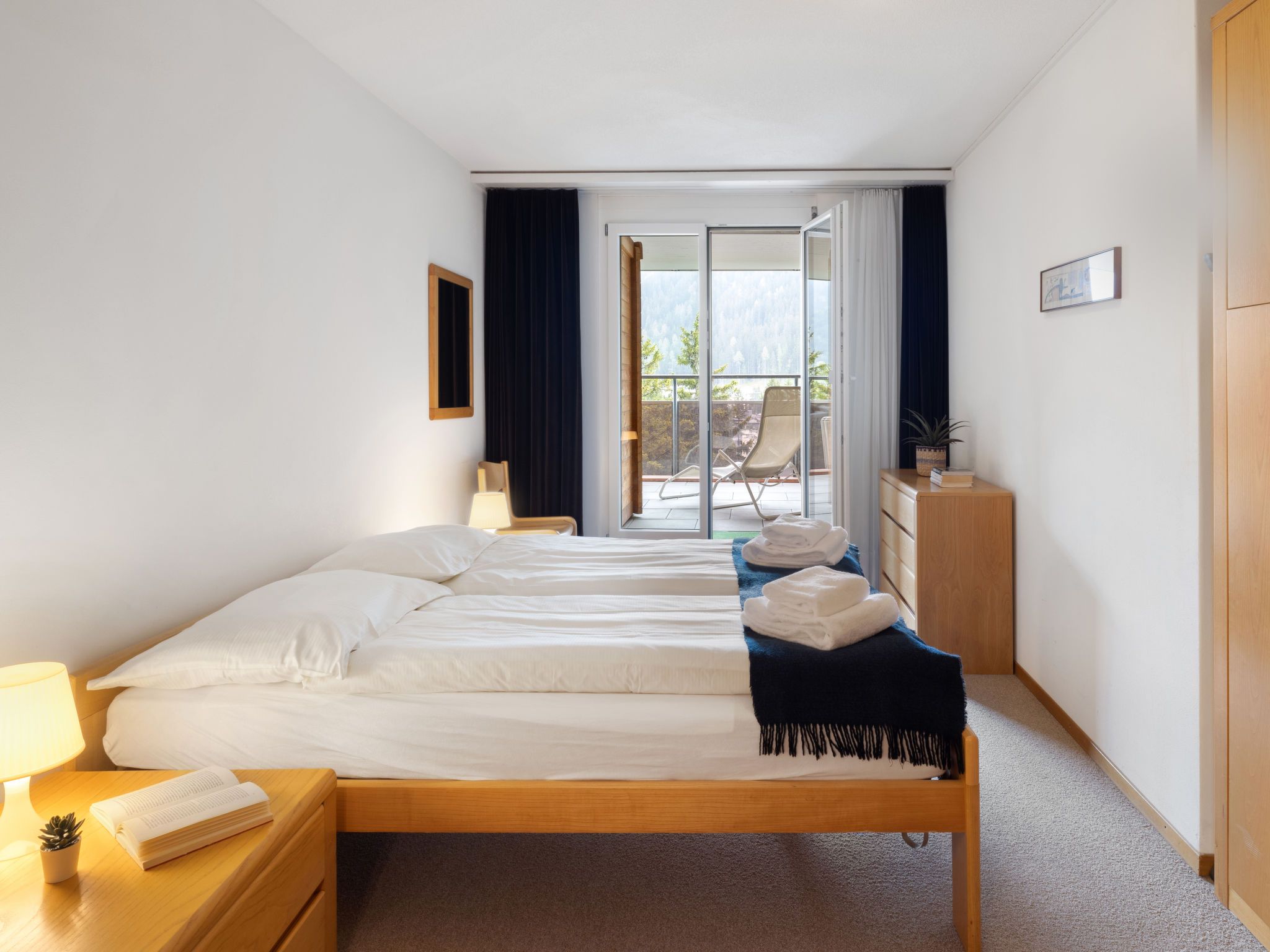 Allod Park Haus C 701, 3-Zimmer-Wohnung 75 m2 im 7. Stock, Nordostlage. Zweckmässig und komfortabel eingerichtet: Wohn-/Esszimmer mit 1 Diwanbett, Kabel-TV, Flachbildschirm und Radio. Ausgang zur Terrasse, Richtung Osten. 1 Zimmer mit 1 Doppelbett (2 x 90 cm). Ausgang zum Balkon, Richtung Osten. 1 Zimmer mit 2 Betten (90 cm). Küche (Backofen, Geschirrspüler, 4 Glaskeramikplatten, Wasserkocher, elektrische Kaffeemaschine, Kapseln für die Kaffeemaschine (Delizio) extra). Bad oder Dusche/WC, Doppelwaschbecken. Grosser Balkon, Ostlage. Schöne Panoramasicht auf die Berge, die Ortschaft und Park. Zur Verfügung: Sauna. Internet (WLAN, gratis). Parkplatz (extra) beim Haus. Bitte beachten: Nichtraucher-Unterkunft. `Keine Haustiere Apt Mit Rollstuhl max 70cm erreichbar. Badezimmer Türe 75cm. 12363