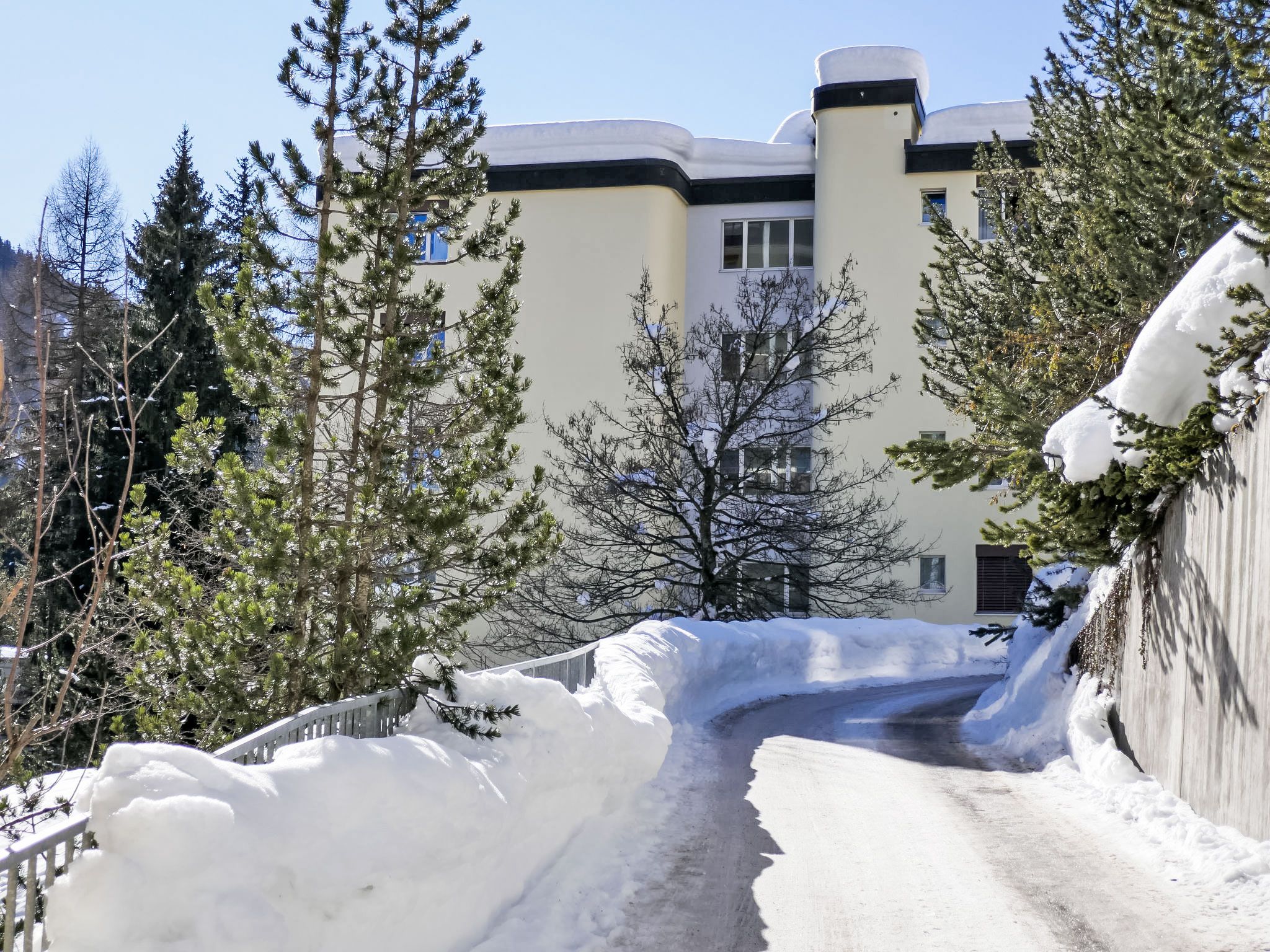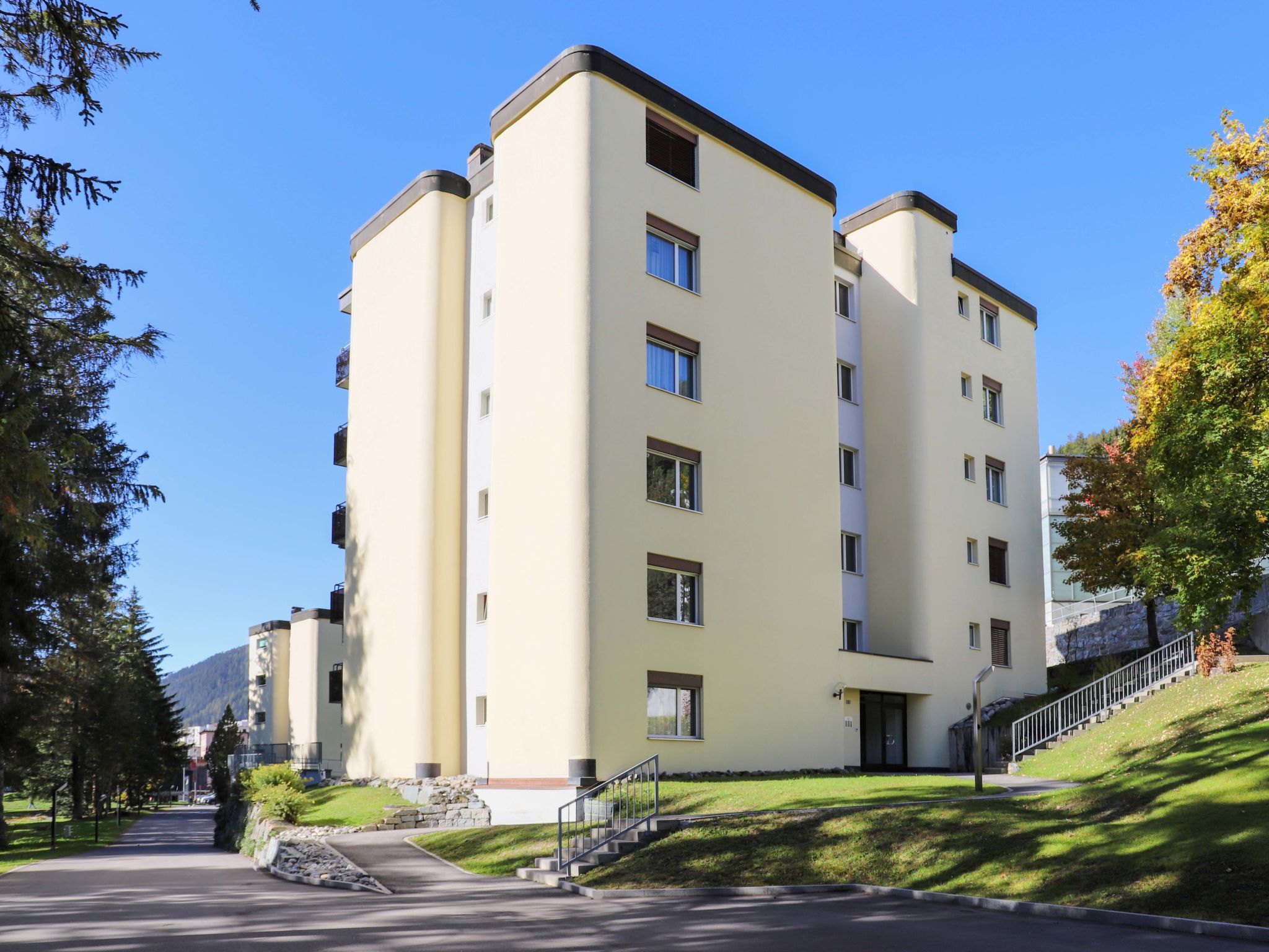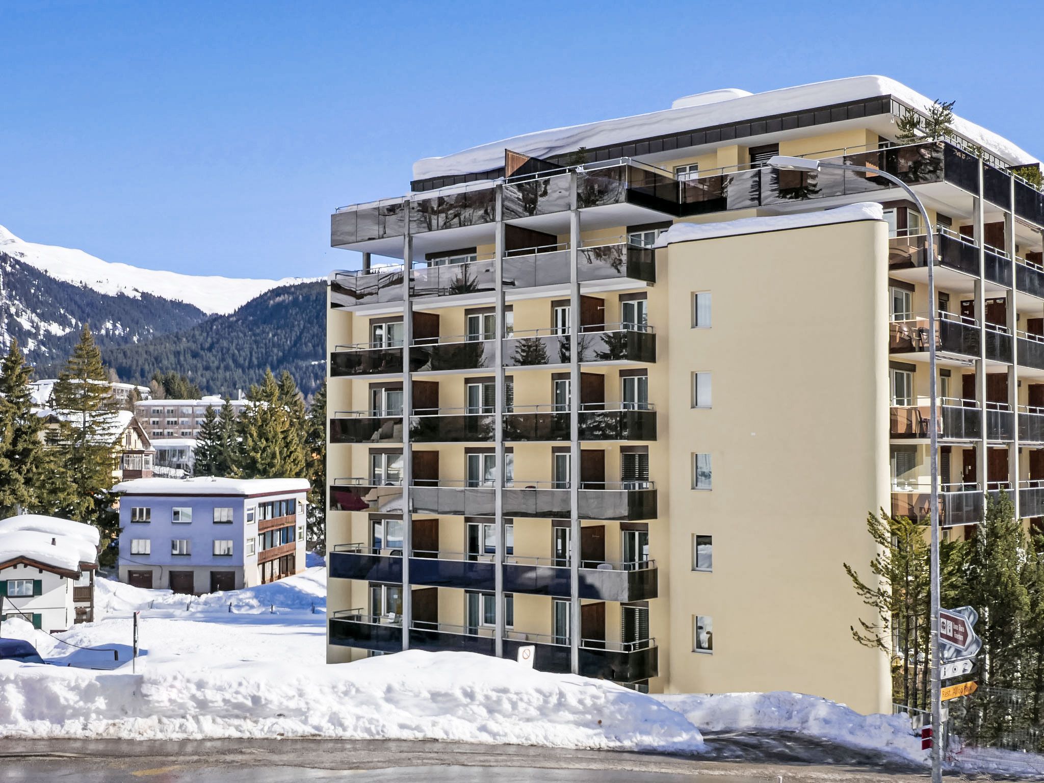 Davos-Platz: Komfortables Appartementhaus Allod-Park, 1'560 m.ü.M.. Im Ortszentrum, 700 m vom Zentrum von Davos Platz, zentrale, ruhige Lage. Zur Mitbenutzung: Park. Im Hause: Empfang, Restaurant, Bar, Wireless LAN, Fahrstuhl, Skiraum, Zentralheizung, Waschmaschine (extra), Wäschetrockner (zur Mitbenutzung, extra), Trockenraum, Skischuhtrockner. Wäschewechsel (zusätzlich extra). Handtuchwechsel (zusätzlich extra). Wohnungsreinigung möglich (extra). Zufahrt bis zum Haus. Parkplatz (extra), Gemeinschaftsgarage (extra). Maße: Höhe 200 cm. Supermarkt 800 m, Einkaufszentrum 400 m, Restaurant 10 m, Bäckerei 300 m, Bushaltestelle Kongresszentrum 100 m, Bahnstation Davos-Platz 1.2 km, Park Kurpark 50 m, Freibad, Hallenbad 200 m, Strandbad 3.1 km, Badesee 2.7 km, See Davoser See 2.7 km. Golfplatz (18 Loch) 2 km, Surfschule 3.1 km, Segelschule 3.1 km, Tennis 4 km, Tennishalle 4 km, Minigolf 400 m, Reitstall 5 km, Sportzentrum 200 m, Wanderwege ab Haus, Radweg 400 m, Luftseilbahn 1.5 km, Bergeisenbahn 600 m, Sessellift 1.8 km, Gondelbahn 1.7 km, Skipisten 1.7 km, Skiverleih 1.7 km, Skibushaltestelle 50 m, Skischule 1.5 km, Kinderskischule 1.5 km, Langlaufloipe 1 km, Eisfeld 200 m, Kinderspielplatz 50 m. Nahe gelegene Sehenswürdigkeiten: Kirchner Museum 50 m. Bekannte Skigebiete sind gut erreichbar: Parsenn 1.5 km, Jakobshorn 1.2 km, Rinerhorn 8 km. Bekannte Seen in der Umgebung sind gut erreichbar: Davosersee 2.7 km. Bitte beachten: Be- und Entladen am Ferienhaus möglich. Die Mietobjekte können sich in Lage, Größe und Beschaffenheit des Grundstücks unterscheiden. Die Mietobjekte können sich in Wohnfläche, Raumaufteilung, Ausstattung und Einrichtung unterscheiden. Rodelbahn Schatzalp-Davos. Garagenplätze auf Anfrage: CHF 10.00 pro Tag. WLAN an oder in der Nähe der Rezeption. Besonderheiten: wöchentlicher Raclette- und Fondue-Abend. Mahlzeiten können im Restaurant bestellt werden. Reservierung von Eintrittskarten für Veranstaltungen.