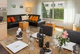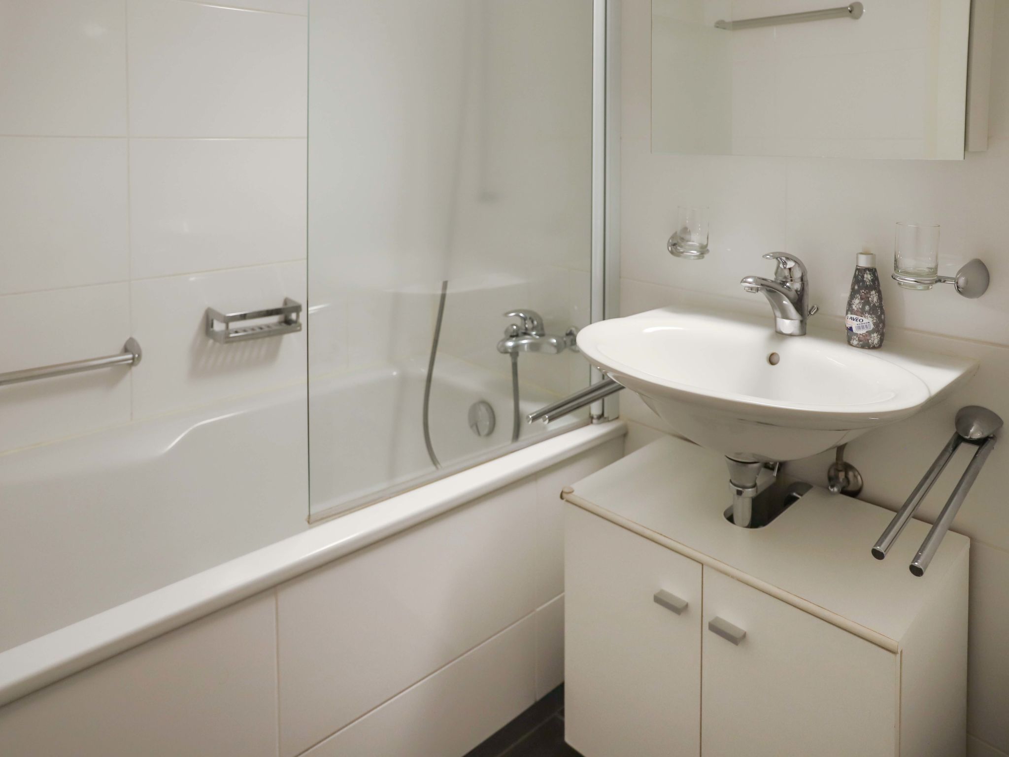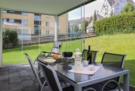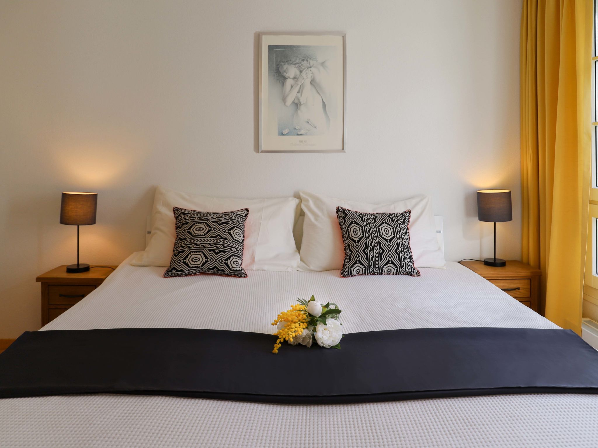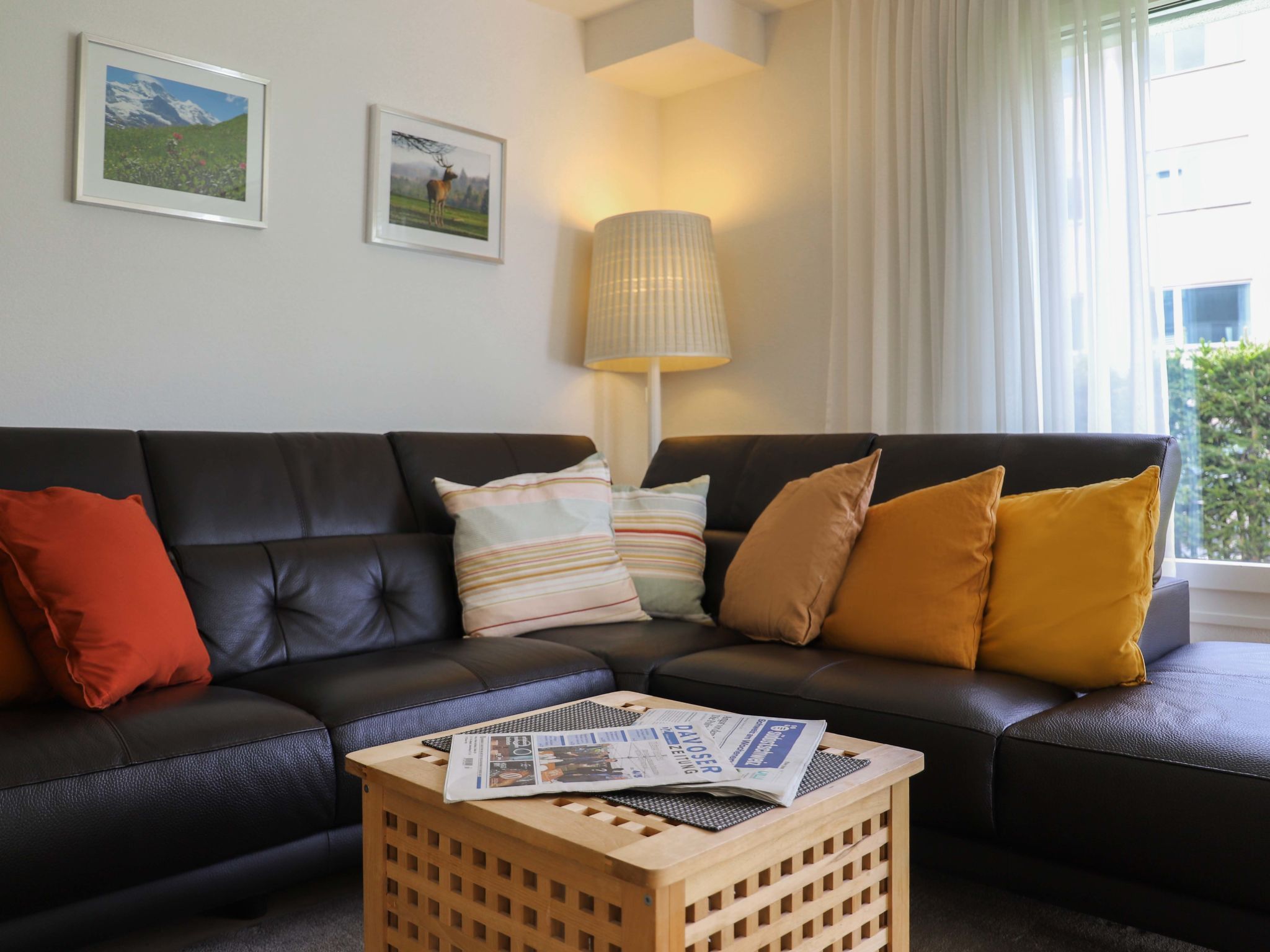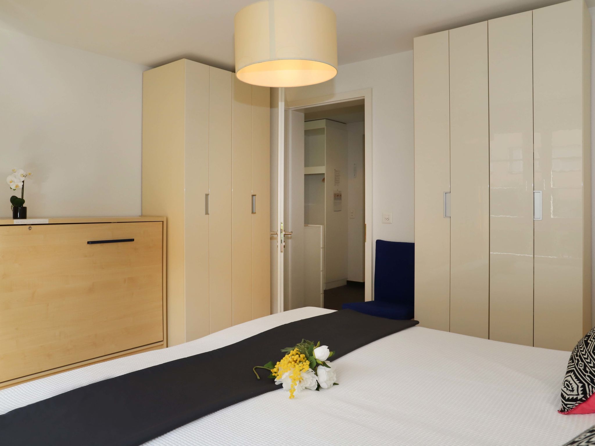 Mon Repos, 2-Zimmer-Wohnung 68 m2, im Erdgeschoss. Geräumig und hell, sehr modern und geschmackvoll eingerichtet: Wohn-/Esszimmer mit Kabel-TV und Flachbildschirm. Ausgang zum Garten, zum Gartensitzplatz. 1 Zimmer mit 2 Betten. Offene Küche (Backofen, Geschirrspüler, 4 Glaskeramikplatten, Mikrowelle, elektrische Kaffeemaschine, Kapseln für die Kaffeemaschine (Nespresso) extra) mit Esstisch. Bad/Dusche/WC. Fussbodenheizung. Parkettboden. Terrasse 10 m2, Südlage und Westlage. Terrassenmöbel, Liegestühle (2), Wintergarten. Sicht auf die Berge, das Tal und die Landschaft. Zur Verfügung: Internet (WLAN). Garage Nr. 29. 13341