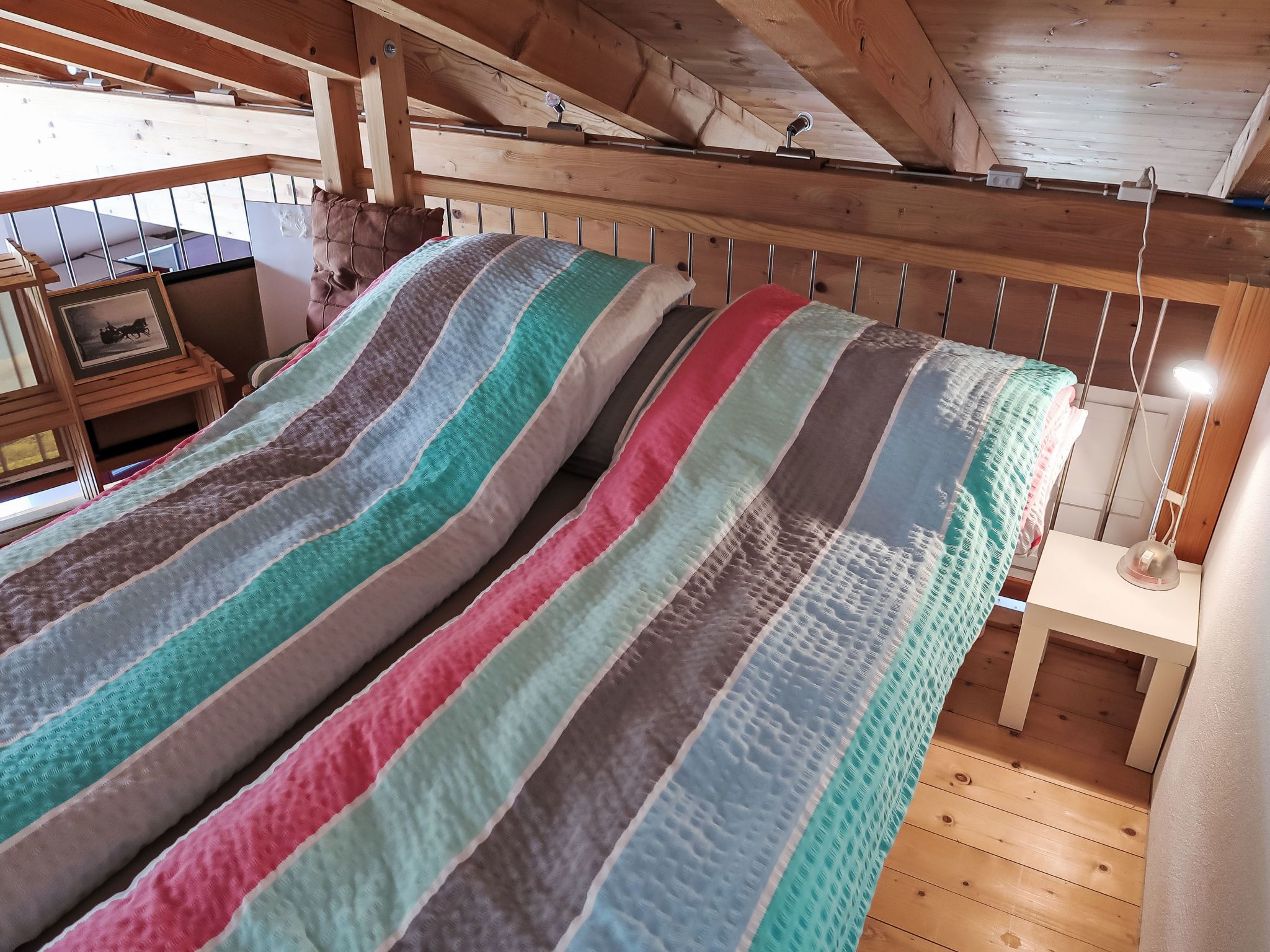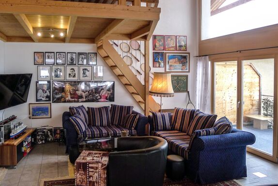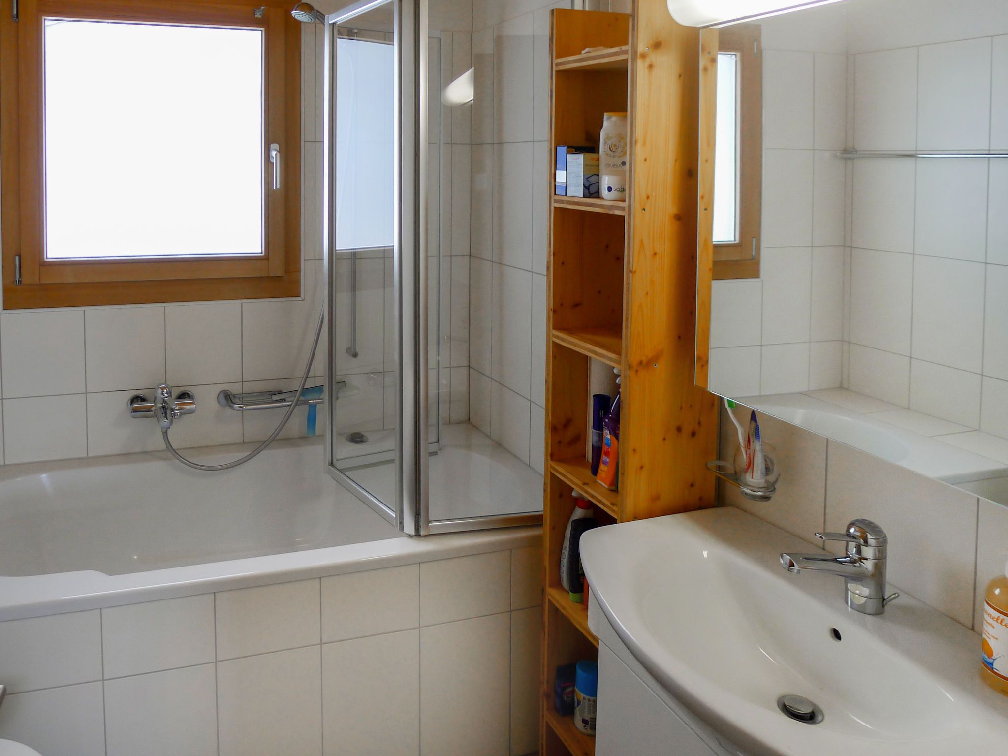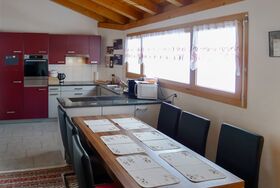 3-Zimmer-Wohnung 77 m2 auf 2 Stockwerken im 1. Stock. Komfortabel und gemütlich eingerichtet: Wohn-/Esszimmer mit 1 Schlafmöglichkeit und Sat-TV (Flachbildschirm). Ausgang zum Balkon. 2 Zimmer, jedes Zimmer mit 1 Doppelbett. Offene Küche (Backofen, Geschirrspüler, 4 Glaskeramikplatten, Wasserkocher, Mikrowelle, elektrische Kaffeemaschine, Fondue Set (Käse)). Bad/WC. Obergeschoss: (steile Treppe) abgeschrägte, offene Galerie mit 1 franz. Bett. Balkon 7 m2. Balkonmöbel, Abstellkammer. Schöne Sicht auf die Berge, die Landschaft und die Ortschaft. Zur Verfügung: Waschmaschine, Wäschetrockner. Internet (Wireless LAN, gratis). Parkplatz (1 Auto), Garage Nr. 2 (1 Auto) beim Haus. Bitte beachten: Nichtraucher-Unterkunft. Anstelle eines abgeschlossenen Schlafzimmers befinden sich manche Schlafplätze in einem offenen Bereich (Galerie, Nische etc.).