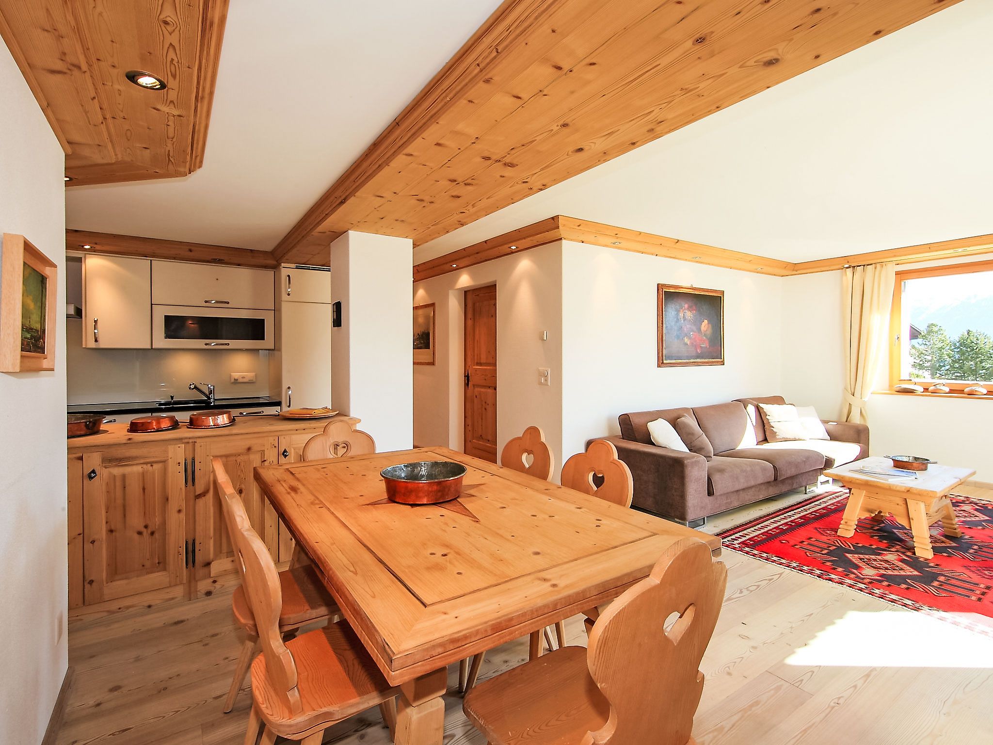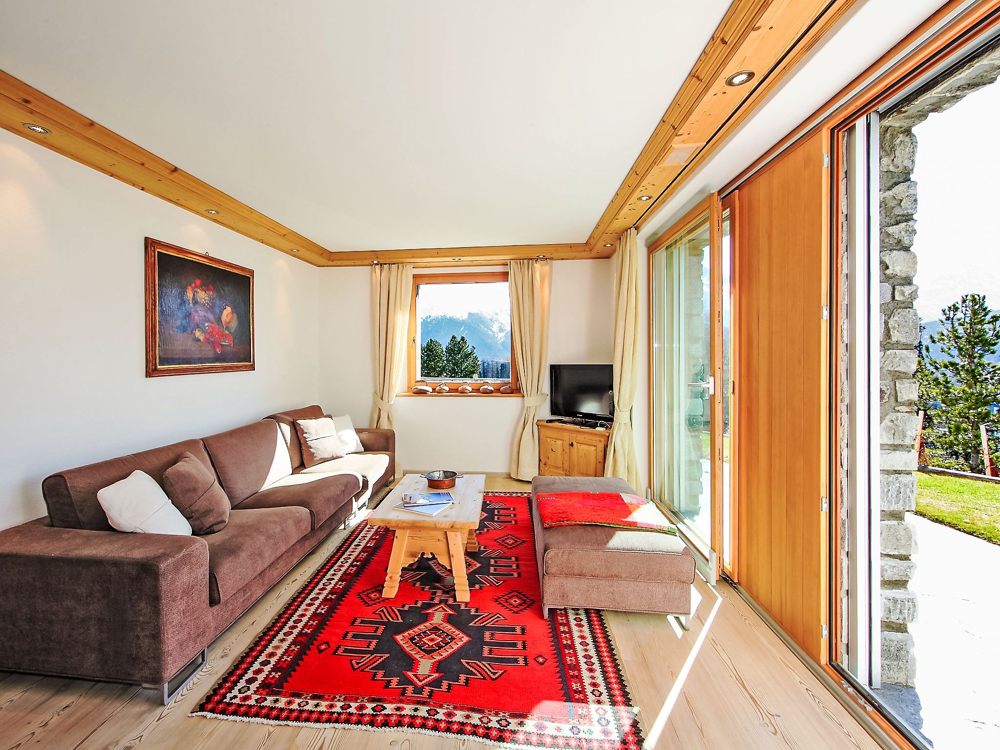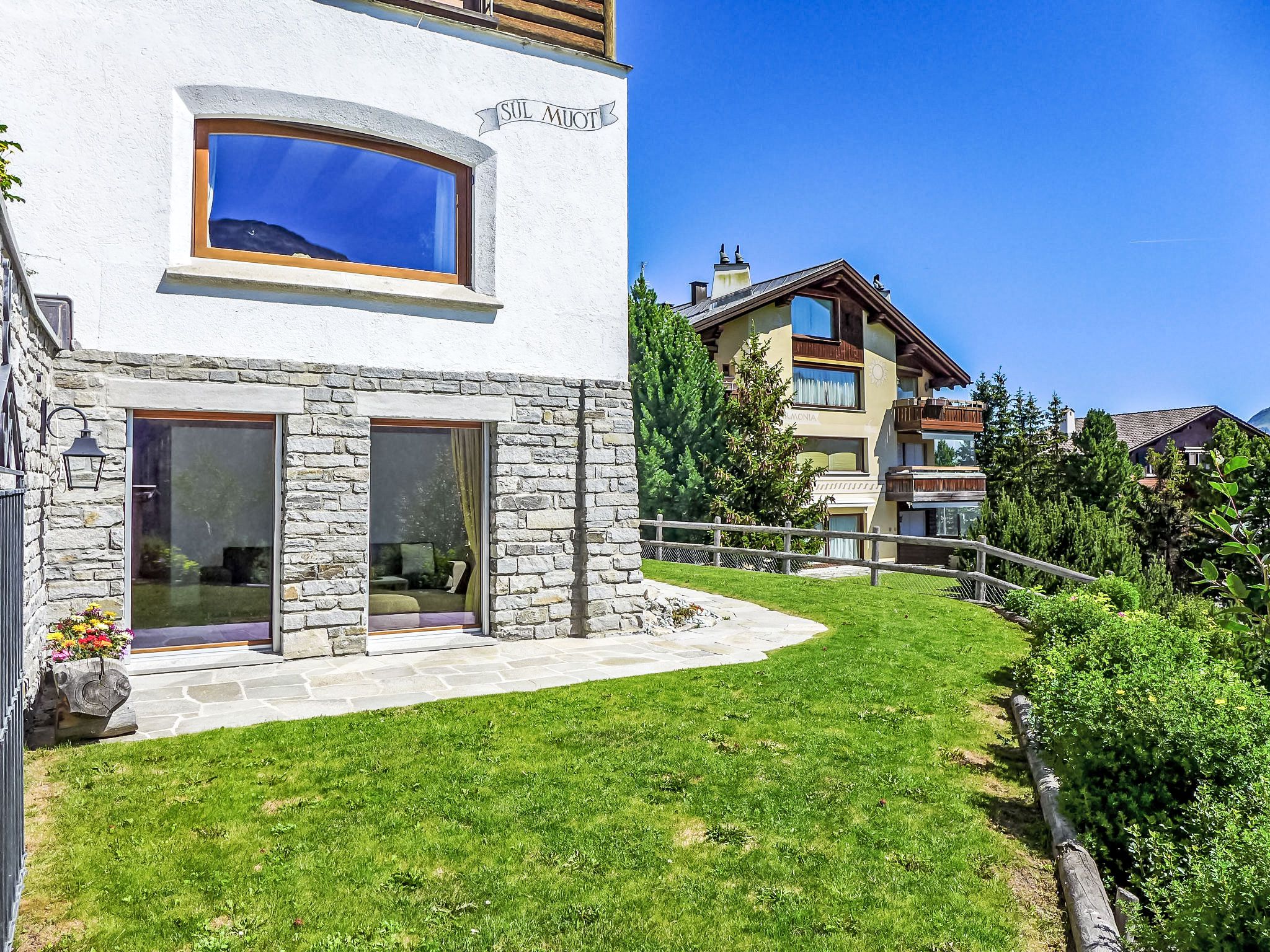 Chesa Sül Muot, 4-Zimmer-Wohnung 100 m2, im Erdgeschoss, Südlage. Sehr luxuriös und gemütlich eingerichtet: Wohn-/Esszimmer mit Kabel-TV (Flachbildschirm), Radio und DVD. Ausgang zum Garten, zur Terrasse, Richtung Süden. 2 Doppelzimmer, jedes Zimmer mit 1 franz. Bett (1 x 160 cm, Länge 190 cm). 1 Kinderzimmer mit 1 Bett (90 cm, Länge 195 cm), 1 x 2 Etagenbetten (90 cm, Länge 195 cm). Offene Küche (Backofen, Geschirrspüler, 4 Glaskeramikplatten, Toaster, Wasserkocher, elektrische Kaffeemaschine, Kapseln für die Kaffeemaschine (Nespresso) extra, Racletteofen, Fondue Set (Chinoise, Käse)). Bad/WC, Dusche/WC, Hydromassage-Dusche. Bodenheizung. Holzdielenboden. Gartensitzplatz, Südlage. Liegestühle (4). Schöne Sicht auf den See, die Berge, das Tal und die Ortschaft. Zur Verfügung: Bügeleisen, Haartrockner. Internet (Wireless LAN, gratis). Garage (1 Auto), Höhe 190 cm, Breite 220 cm. Bitte beachten: geeignet für Familien. Nichtraucher-Unterkunft, Nichtraucher-Haus. Eigener Eingang.