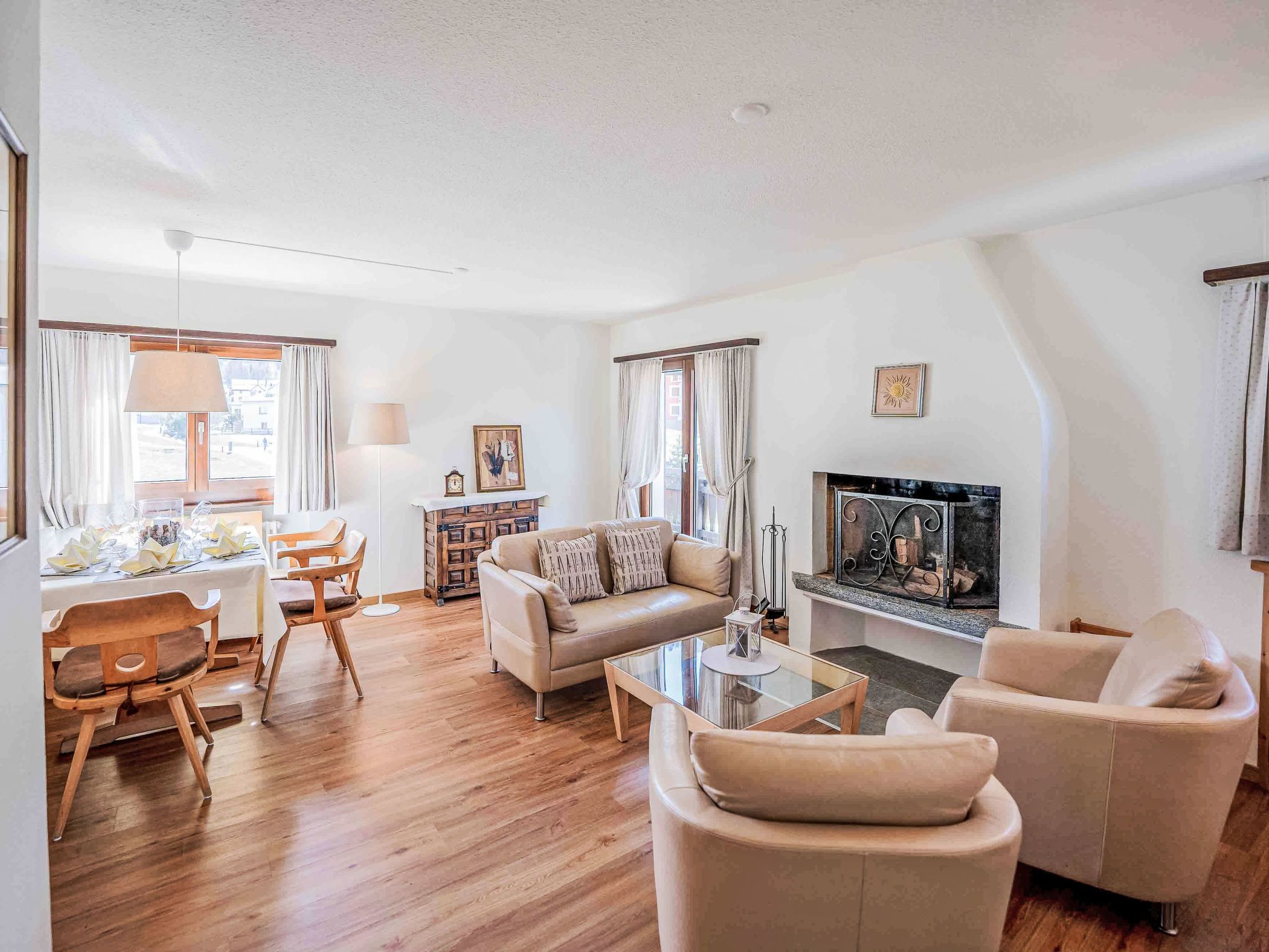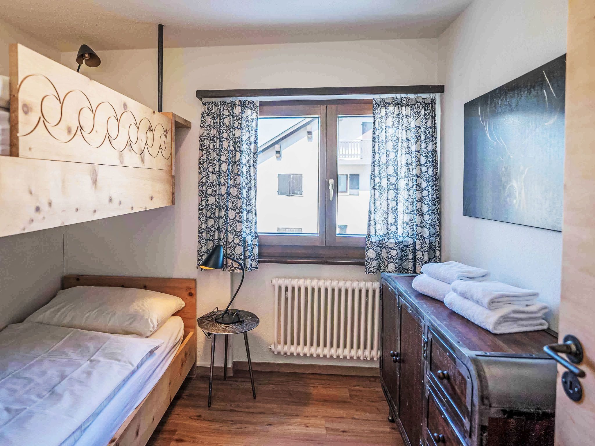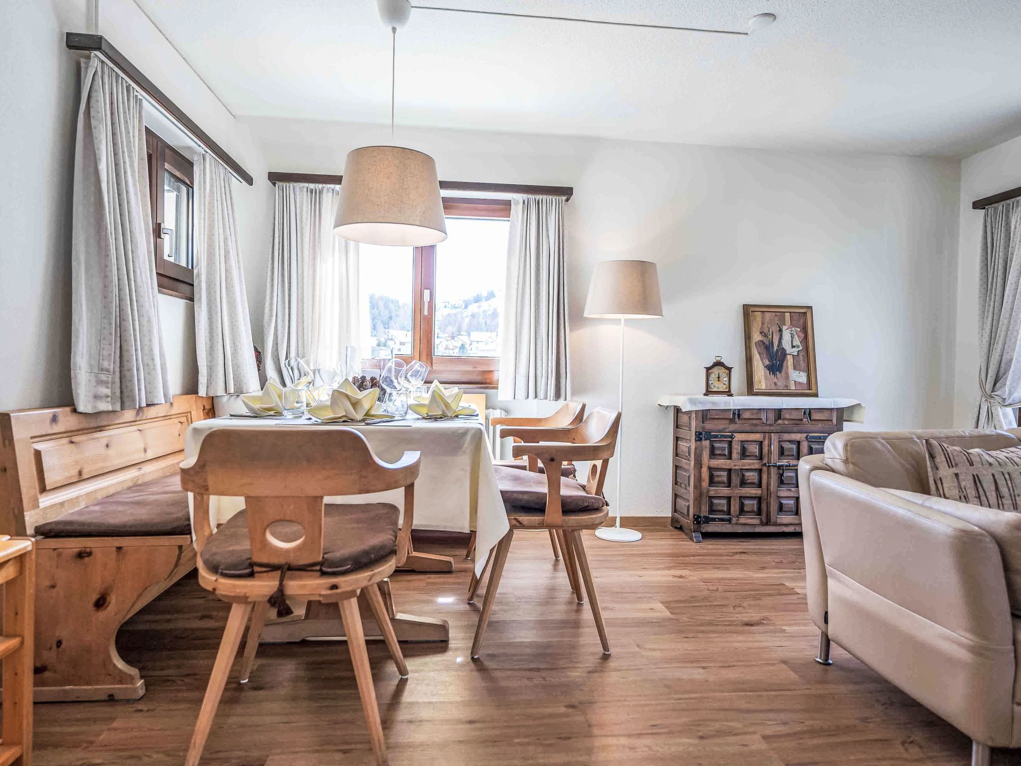 Chesa Mulin, 4-Zimmer-Wohnung 70 m2 im 1. Stock. Teilweise renoviert im Jahre 2018, komfortabel eingerichtet: Wohn-/Esszimmer mit offenem Kamin, TV und Radio. Ausgang zum Balkon, Richtung Nordwesten. 1 kleines Zimmer mit 1 x 2 Etagenbetten (90 cm, Länge 200 cm). 1 Zimmer mit 2 Betten (90 cm, Länge 190 cm). 1 kleines Zimmer mit 2 Betten (90 cm, Länge 190 cm). Küche (Backofen, Geschirrspüler, 4 Induktionskochplatten, Toaster, Wasserkocher, Mikrowelle, Tiefkühler, elektrische Kaffeemaschine, Kapseln für die Kaffeemaschine (Nespresso) extra, Racletteofen, Fondue Set (Käse)) mit Durchreiche. Bad/WC, Dusche/WC. Kleiner Balkon. Sicht auf die Berge und die Ortschaft. Zur Verfügung: Bügeleisen, Haartrockner. Internet (WLAN, gratis). Garage, Höhe 180 cm, Breite 220 cm. Bitte beachten: geeignet für Familien. Nichtraucher-Unterkunft. Maximal 2 Haustiere/Hunde erlaubt.