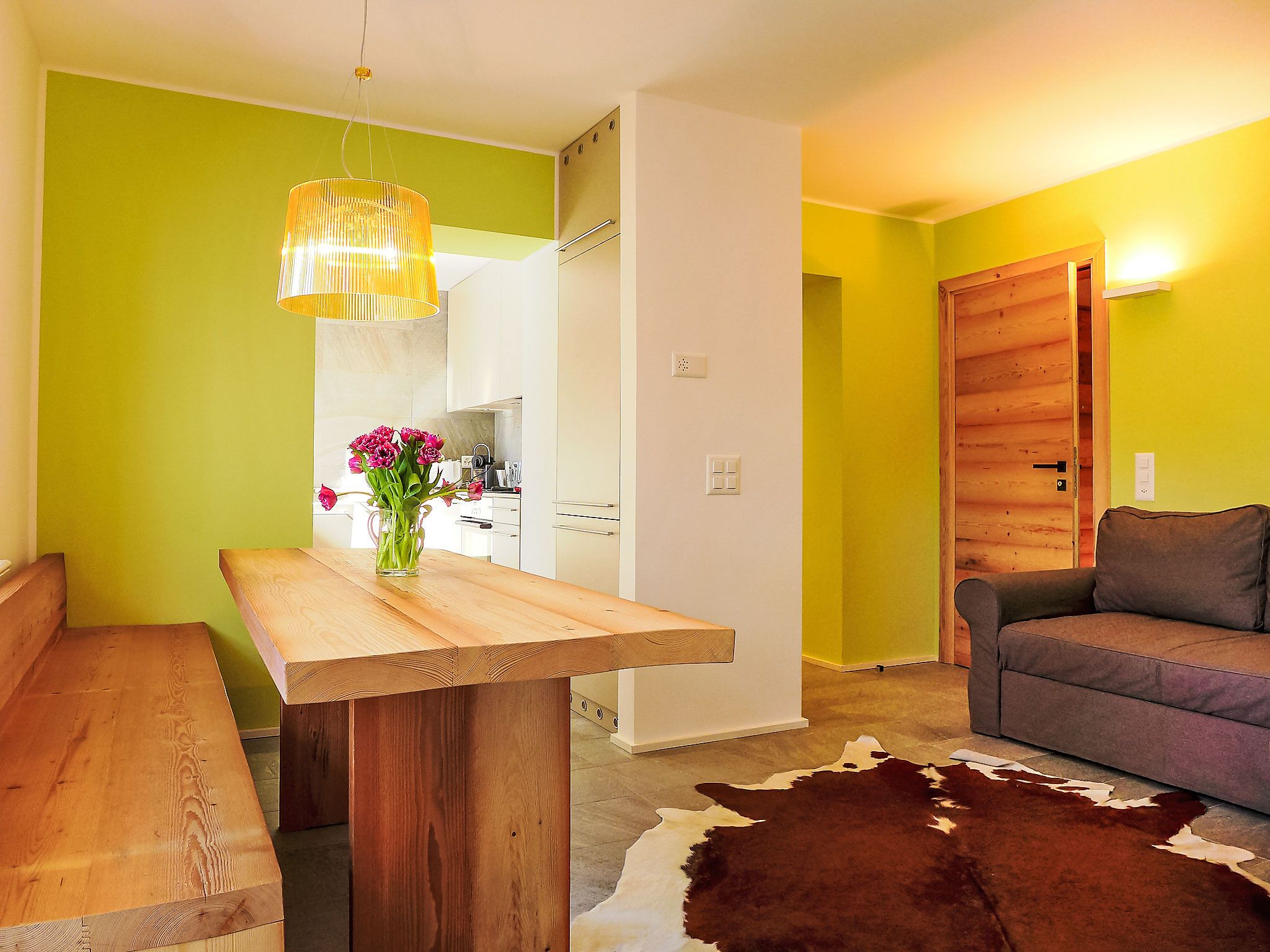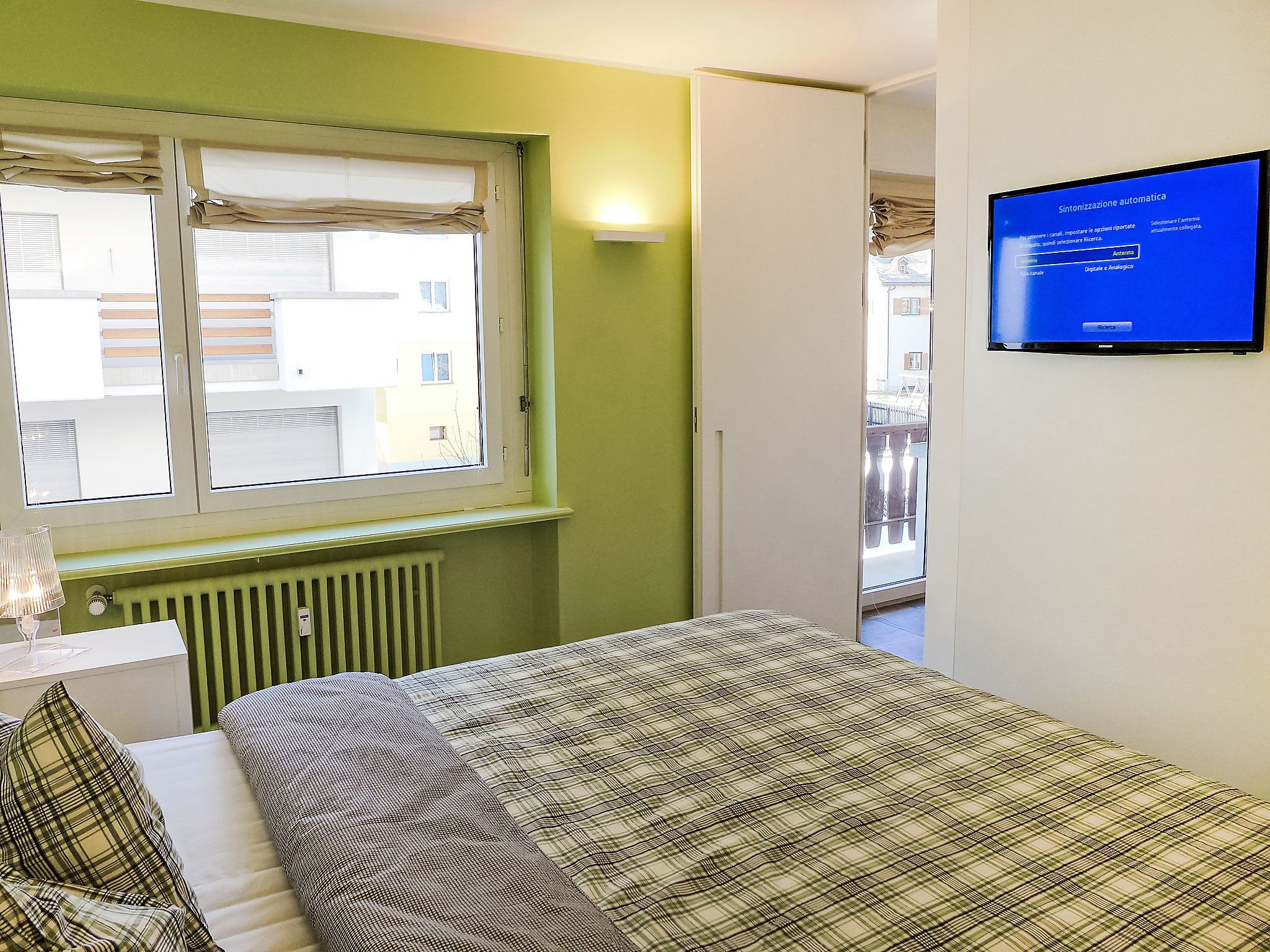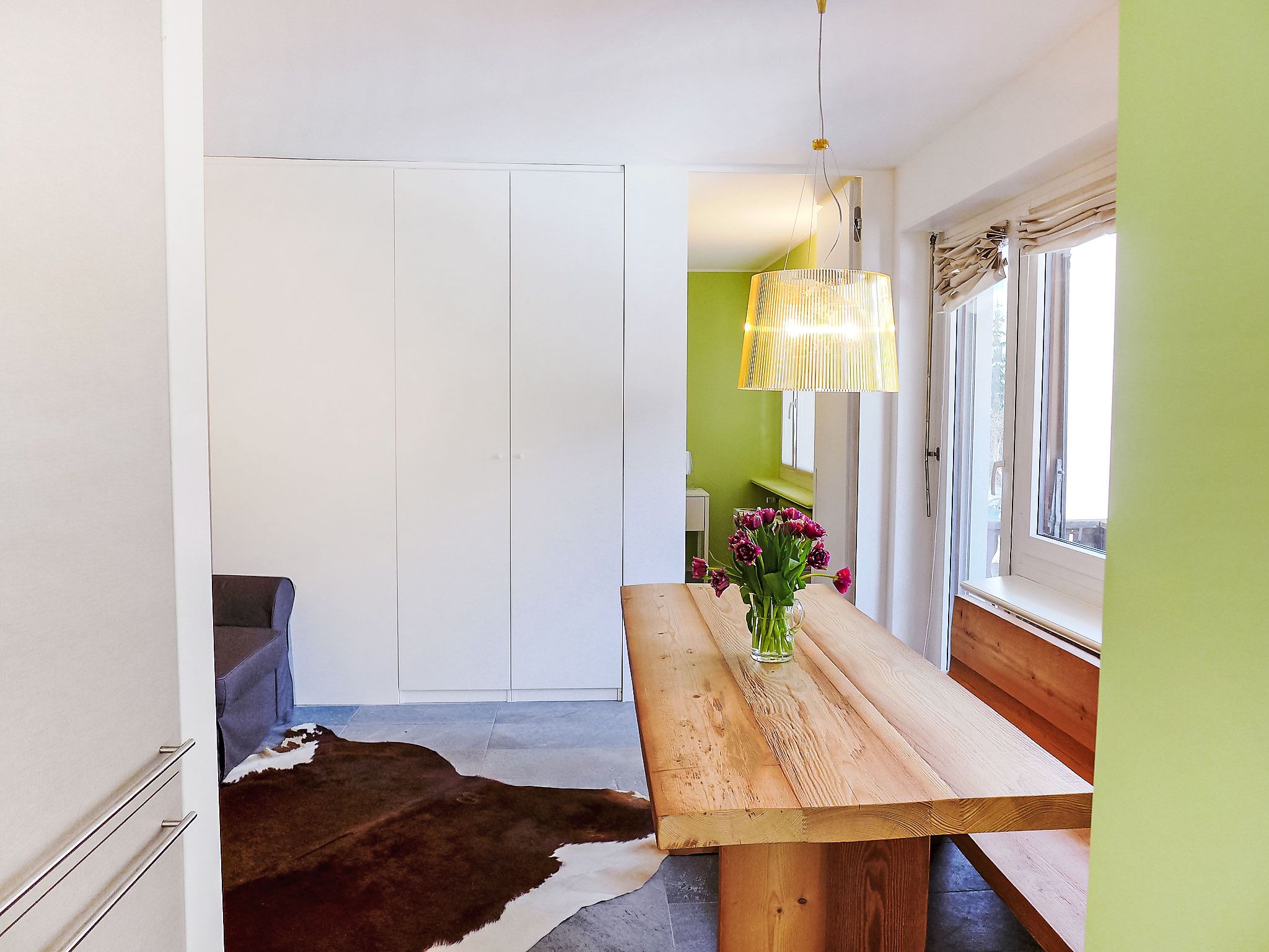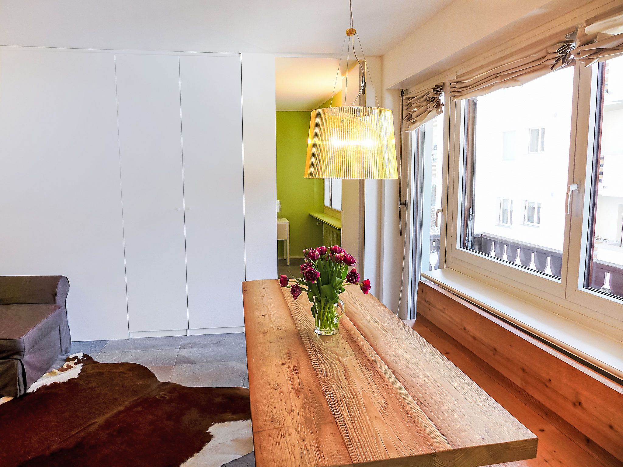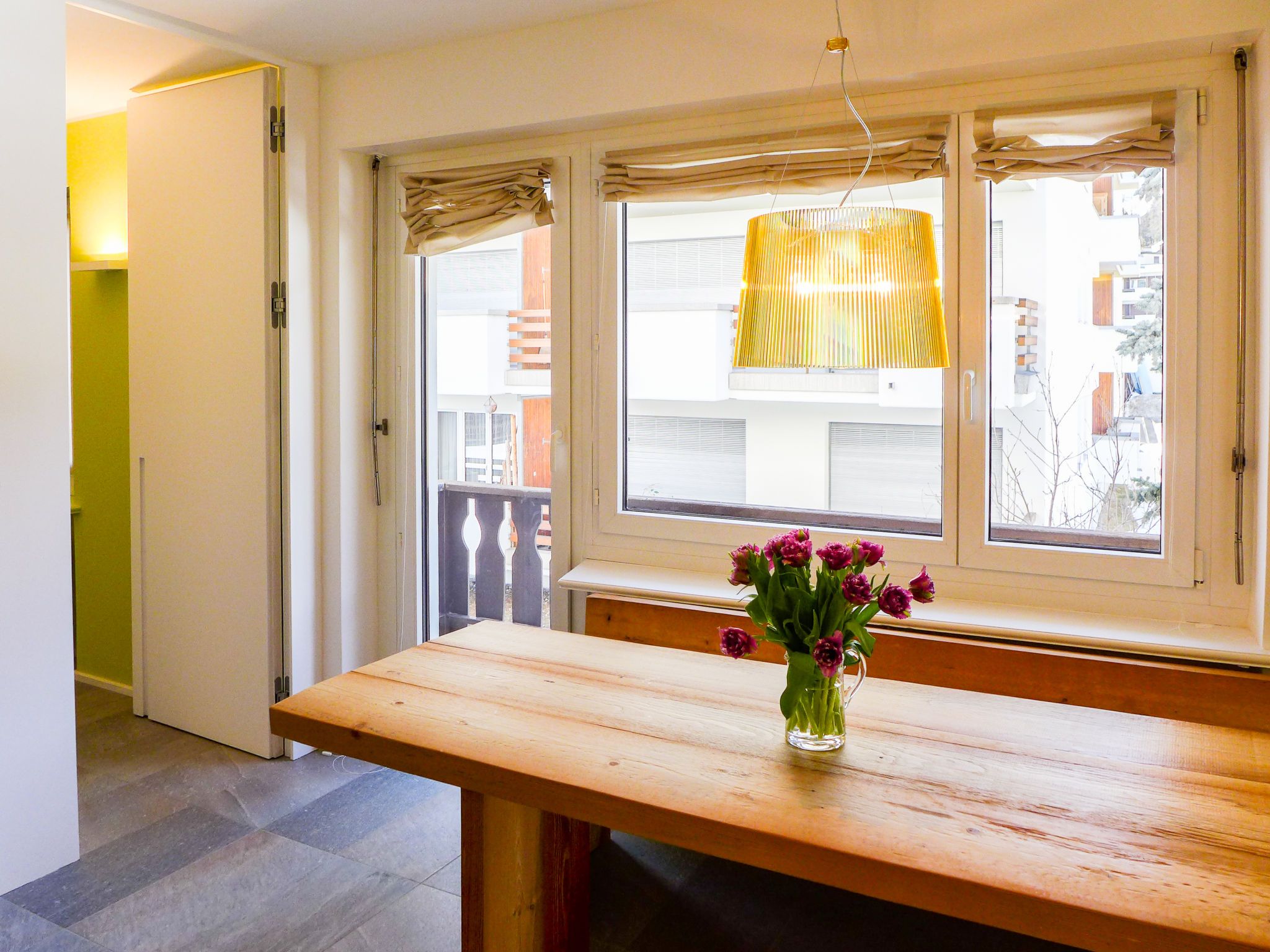 Chesa La Soliva, 2-Zimmer-Wohnung 47 m2 im 1. Stock. Vollständig renoviert im Jahre 2015, sehr modern und geschmackvoll eingerichtet: Wohn-/Esszimmer mit 1 Doppeldiwanbett (1 x 150 cm, Länge 200 cm). Ausgang zum Balkon, Richtung Westen. 1 Zimmer mit 1 franz. Bett (180 cm, Länge 200 cm), TV. Kleine, offene Küche (Backofen, Geschirrspüler, 4 Induktionskochplatten, Toaster, Wasserkocher, Tiefkühler, elektrische Kaffeemaschine, Kapseln für die Kaffeemaschine (Nespresso) extra). Dusche/WC. Heizung. Natursteinboden. Seitliche Sicht auf die Berge und die Ortschaft. Zur Verfügung: Haartrockner. Internet (Wireless LAN, gratis). Parkplatz Nr. 20 (1 Auto). Bitte beachten: geeignet für Familien. Nichtraucher-Unterkunft. Maximal 1 kleines Haustier/Hund erlaubt. Kein Fahrstuhl.