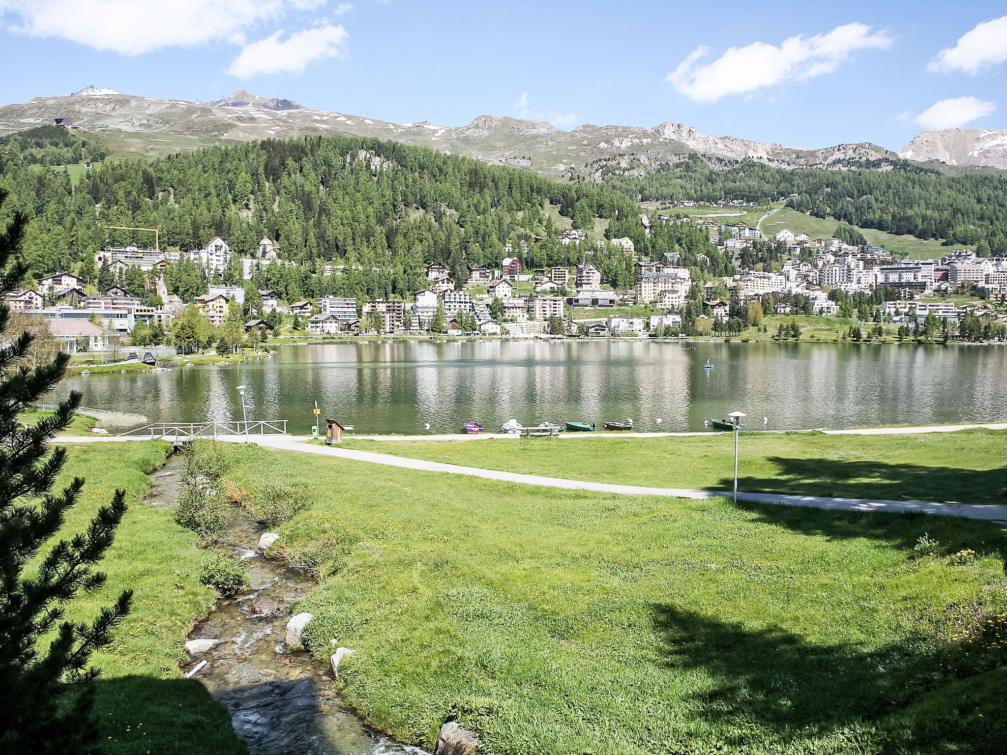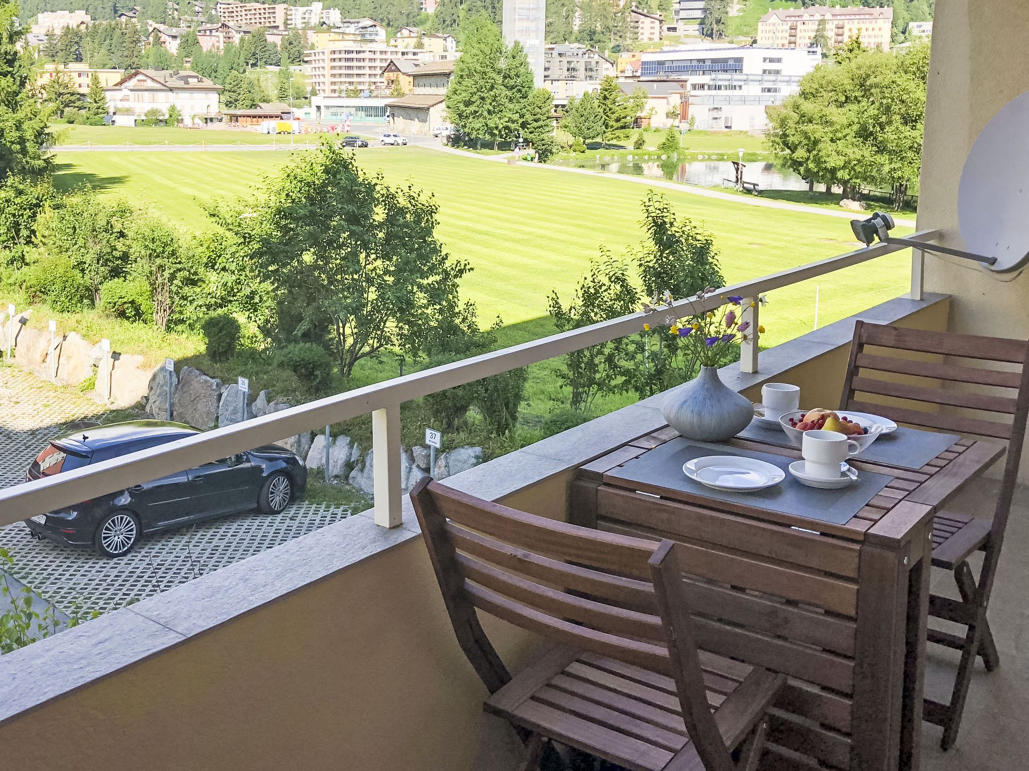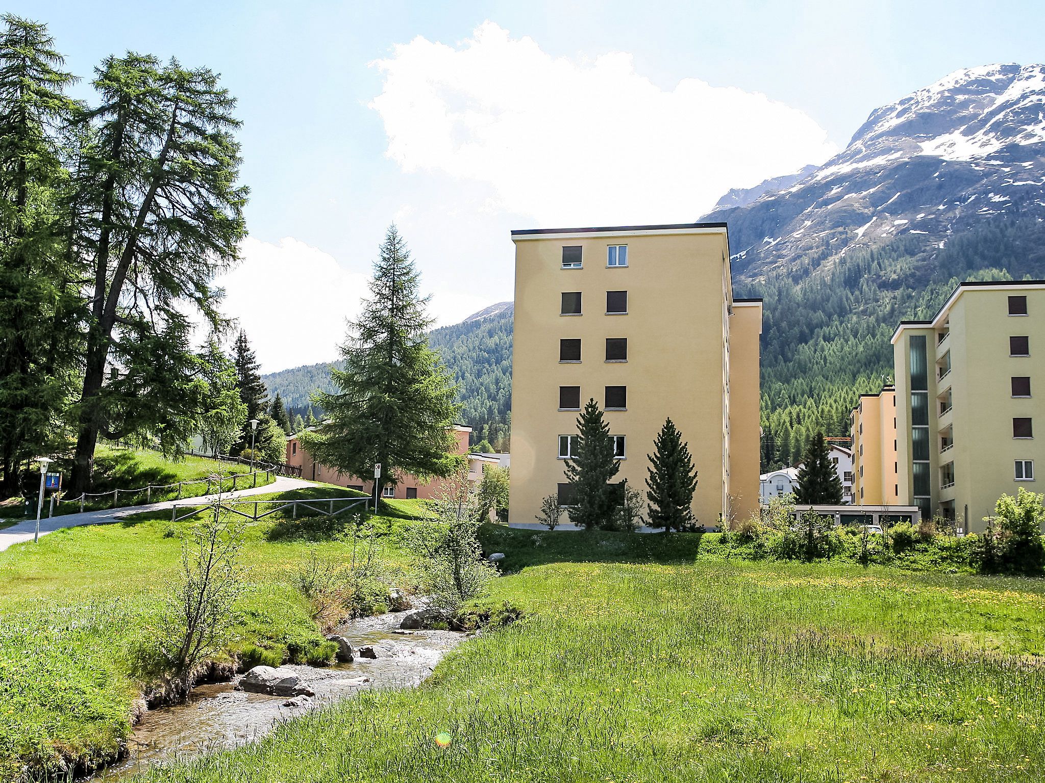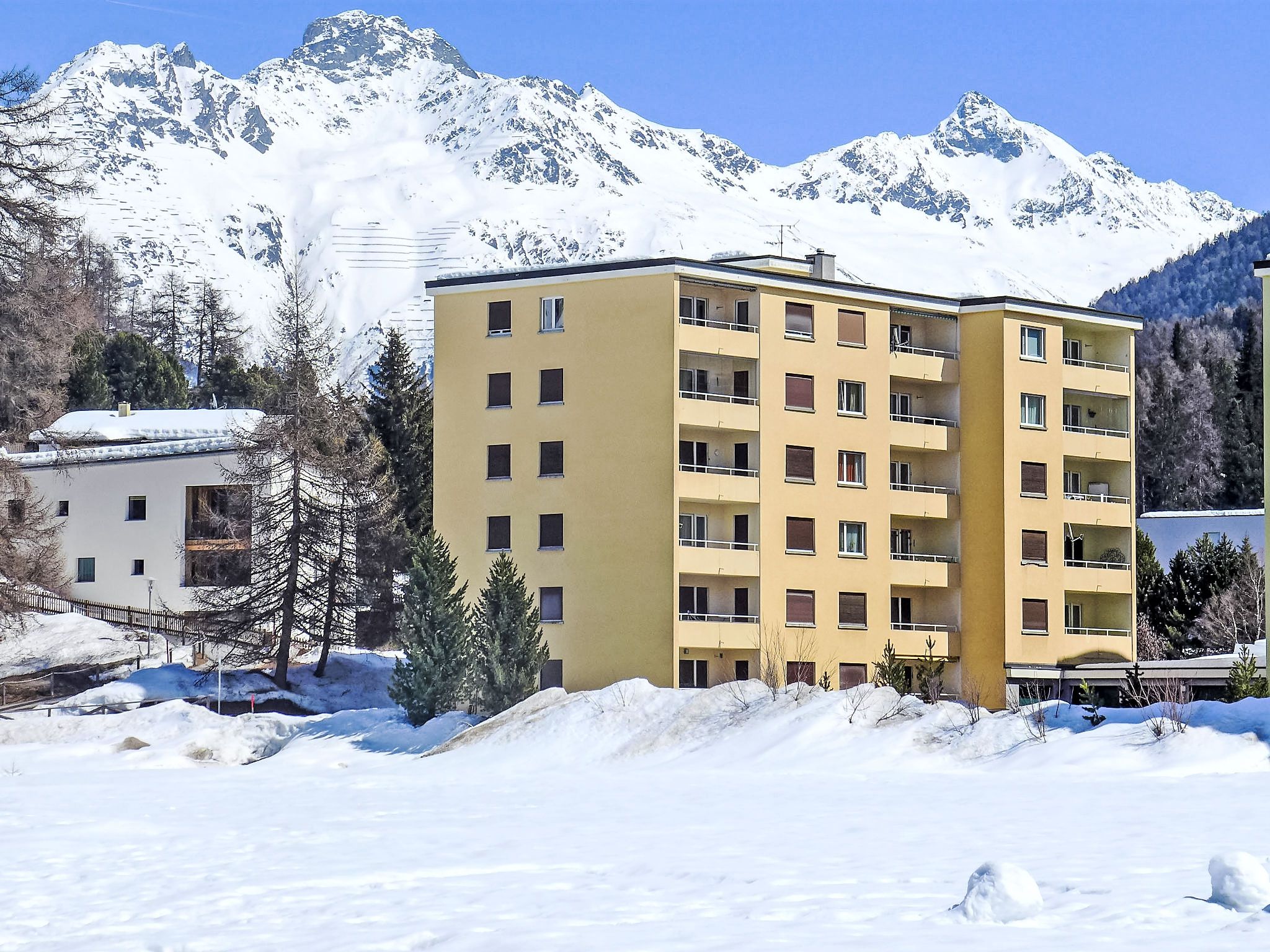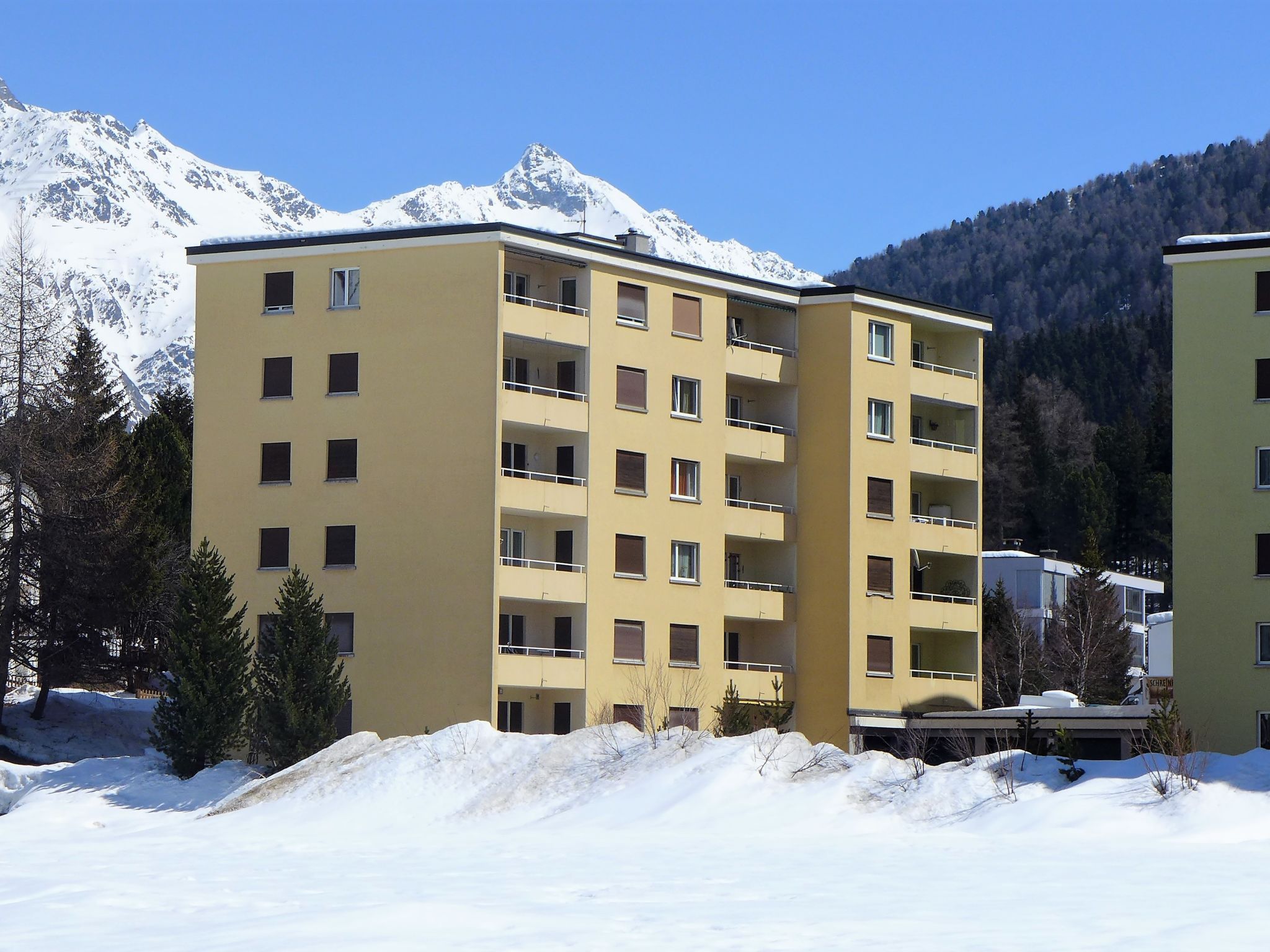 St. Moritz Bad: Mehrfamilienhaus Chesa Daniela B, auf 6 Stockwerken, Baujahr 1971. Zentrale Lage in einem Wohnquartier, vom Waldrand, 50 m vom See, 1.2 km vom Skigebiet, in einer Sackgasse. Im Hause: Fahrstuhl, Zentralheizung, Waschmaschine (zur Mitbenutzung, extra), Trockenraum. Einzelgarage. Einkaufsgeschäft, Supermarkt 1.1 km, Restaurant 350 m, Bäckerei 900 m, Café 750 m, Fahrradverleih, Bushaltestelle St. Moritz Bad, Giand'Alva 230 m, Bahnstation 2.4 km, Hallenbad 750 m, Thermalbad Heilbadzentrum St. Moritz 900 m, See St. Moritzer See 50 m. Golfplatz (18 Loch) 8 km, Surfschule 5.6 km, Tennis 1.3 km, Tennishalle 1.3 km, Minigolf 750 m, Reitstall 3.2 km, Wanderwege ab Haus 50 m, Radweg 50 m, Luftseilbahn 1.2 km, Skilift 1.2 km, Skipisten 1.2 km, Skiverleih 750 m, Skibushaltestelle 230 m, Skischule 2.4 km, Kinderskischule 2.4 km, Schlittelbahn 6 km, Langlaufloipe 200 m, Eisfeld 750 m, Kinderspielplatz 850 m. Nahe gelegene Sehenswürdigkeiten: Segantini Museum 2.6 km, Engadiner Museum 1.5 km, Mili Weber-Haus 3.2 km, Olympia Bob Run mit Museum 3 km, Nietzsche Museum in Sils-Maria 9.9 km. Bekannte Skigebiete sind gut erreichbar: Corviglia Piz Nair 1.2 km, Corvatsch - Furtschellas 6.8 km, Diavolezza - Lagalb 20.1 km. Bekannte Seen in der Umgebung sind gut erreichbar: St.Moritzer See 50 m, Silvaplaner See 5.6 km, Silser See 9.8 km. Wandergebiete: Stazerwald & Stazersee, Corviglia Piz Nair, Muottas Muragl. Die Schlüsselübergabe findet bei der Agentur Interhome in St. Moritz Bad statt.