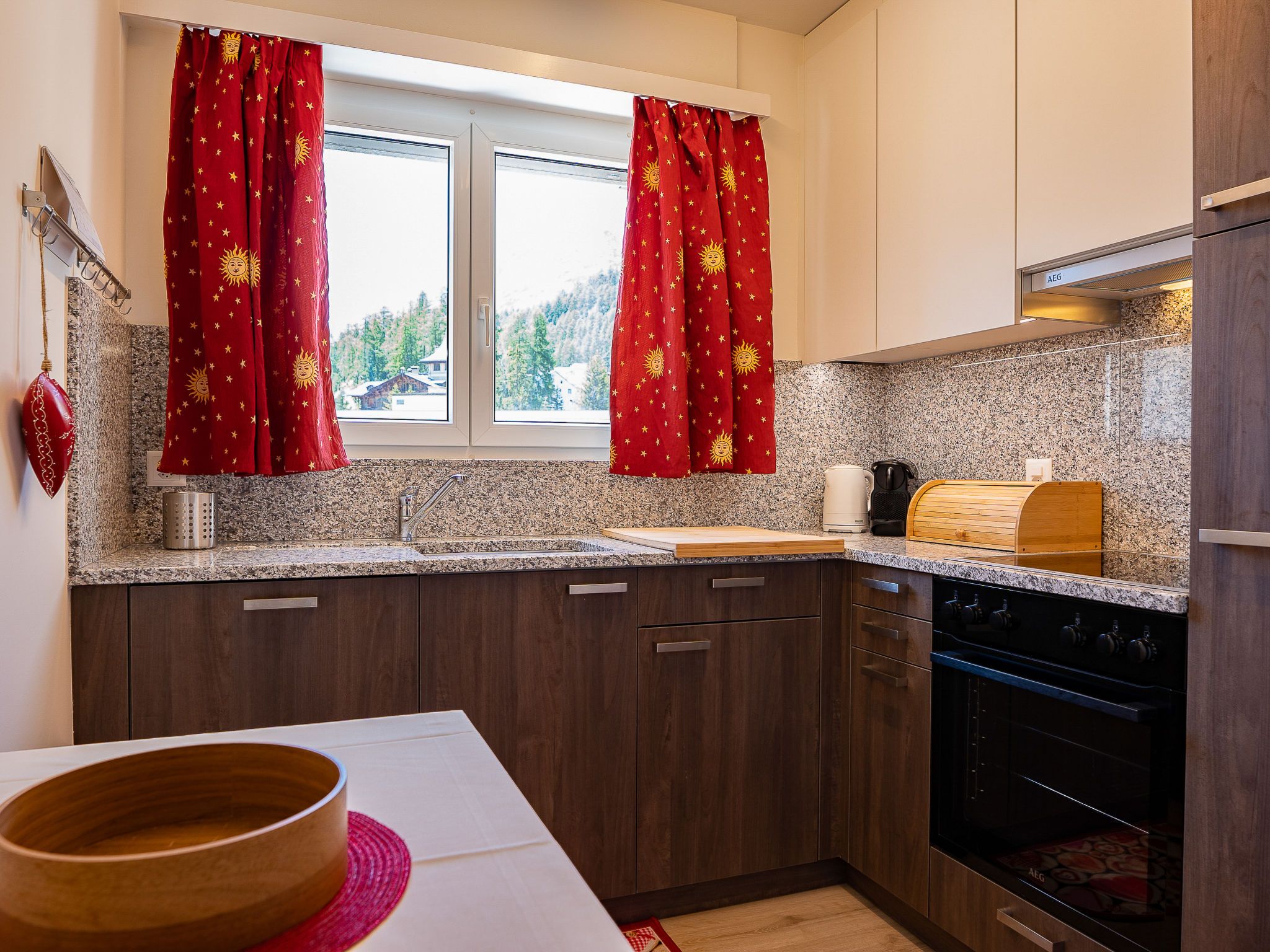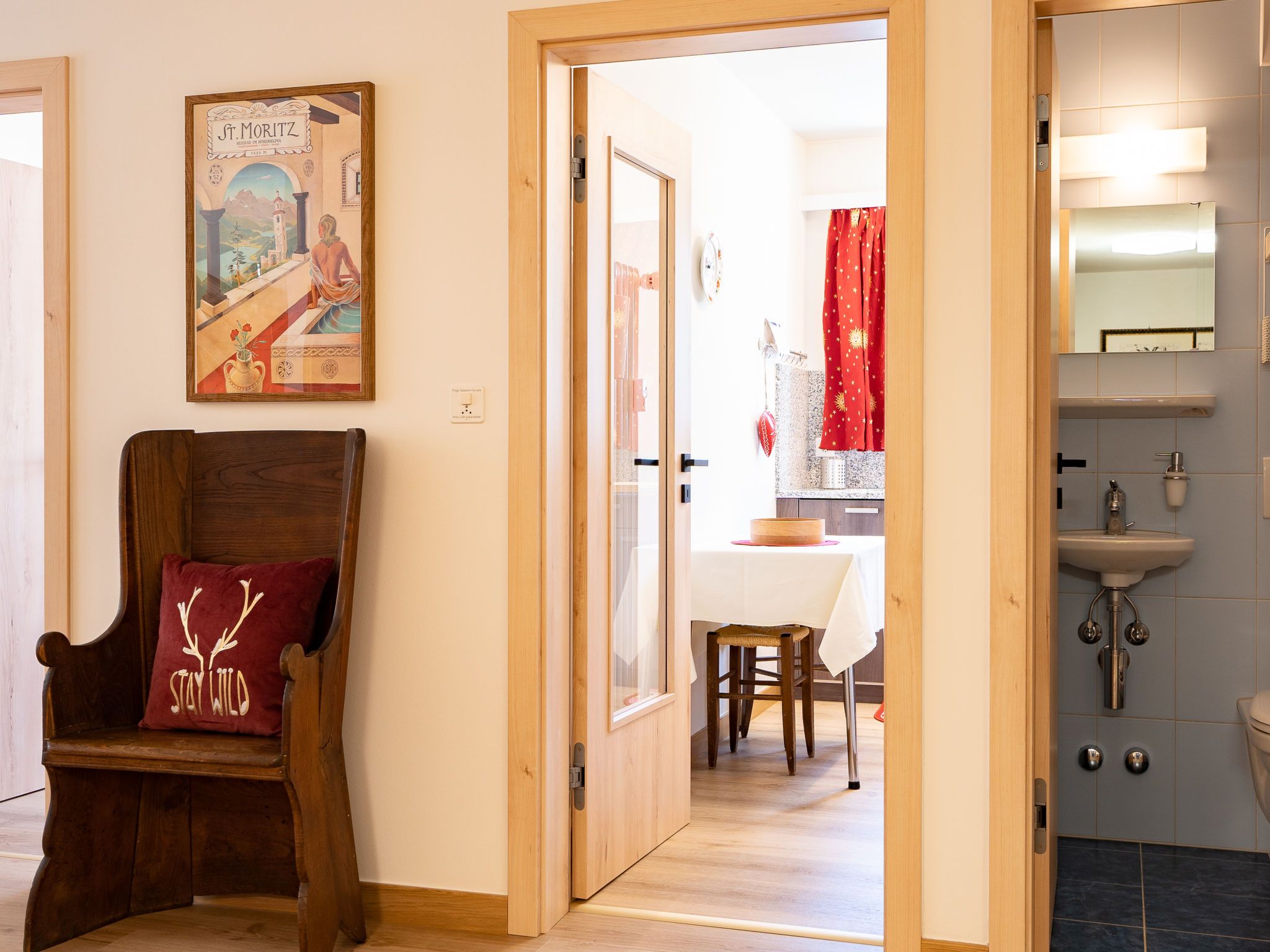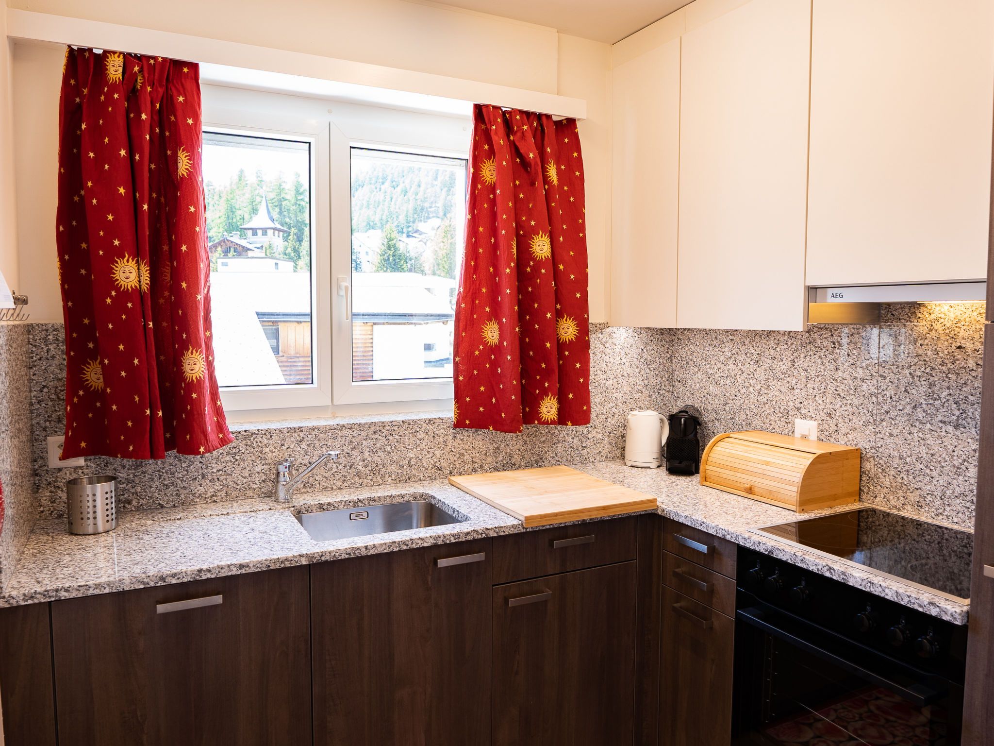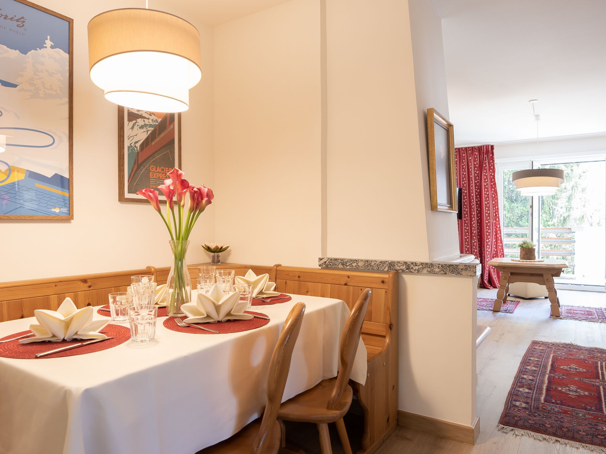 Chesa Derby 27, 3-Zimmer-Wohnung 65 m2 im 3. Stock. Hell, teilweise renoviert im Jahre 2022, gemütlich eingerichtet: offenes Wohn-/Esszimmer mit offenem Kamin (nur Deko), Esstisch und TV (Flachbildschirm). Ausgang zum Balkon, Richtung Süden. 1 Doppelzimmer mit 1 Doppelbett (2 x 90 cm, Länge 200 cm). Ausgang zum Balkon. 1 Zimmer mit 1 Bett (90 cm, Länge 190 cm), 1 x 1 Etagenbetten (90 cm, Länge 190 cm). Kleine Küche (Backofen, Geschirrspüler, 4 Glaskeramikplatten, Toaster, Wasserkocher, elektrische Kaffeemaschine, Kapseln für die Kaffeemaschine (Nespresso) extra, Fondue Set (Käse)). Bad/Bidet/WC, sep. WC. Heizung. Balkon 10 m2. Balkonmöbel. Seitliche Sicht auf die Berge. Zur Verfügung: Haartrockner. Internet (Wireless LAN, gratis). Garage Nr. G (1 Auto), Höhe 200 cm, Breite 220 cm. Bitte beachten: geeignet für Familien Wohnung auf Parkplatzseite. Nichtraucher-Unterkunft. Bedingt durch das Coronavirus (COVID-19) ergreift diese Unterkunft Maßnahmen, um die Sicherheit der Gäste und Mitarbeiter zu gewährleisten. Die Nutzung des Pools kann daher nur eingeschränkt bzw. teilweise auch gar nicht möglich sein.
