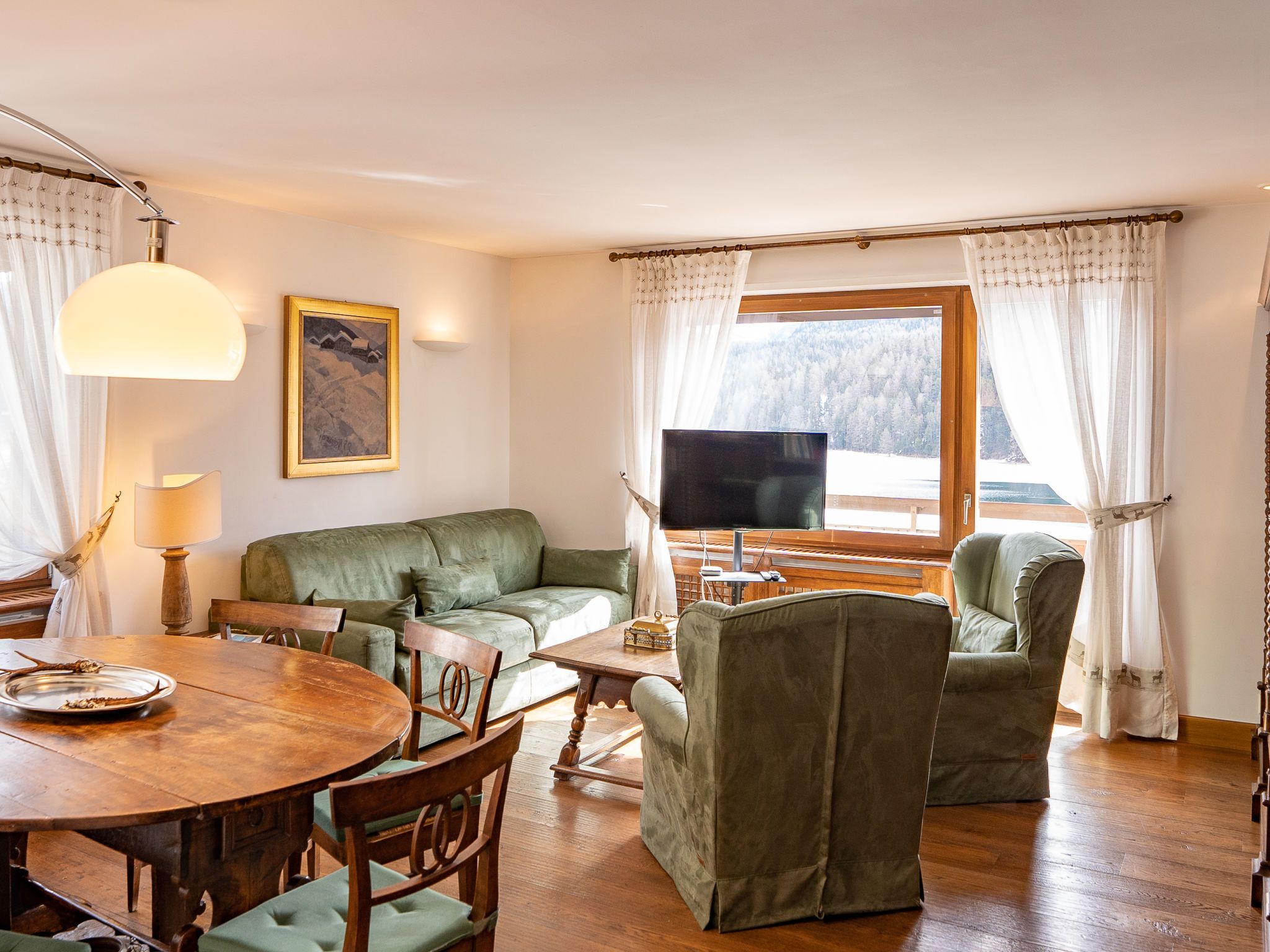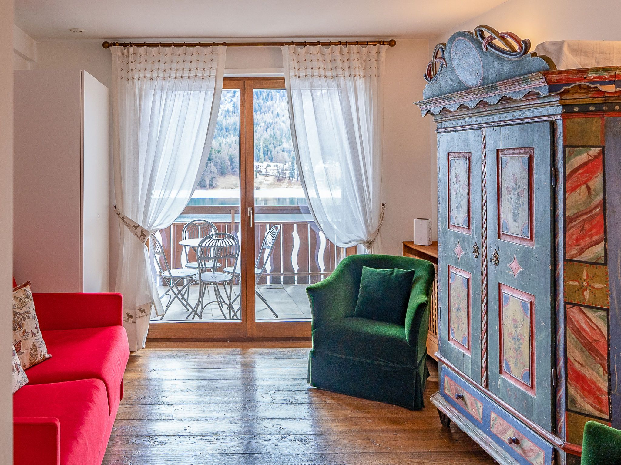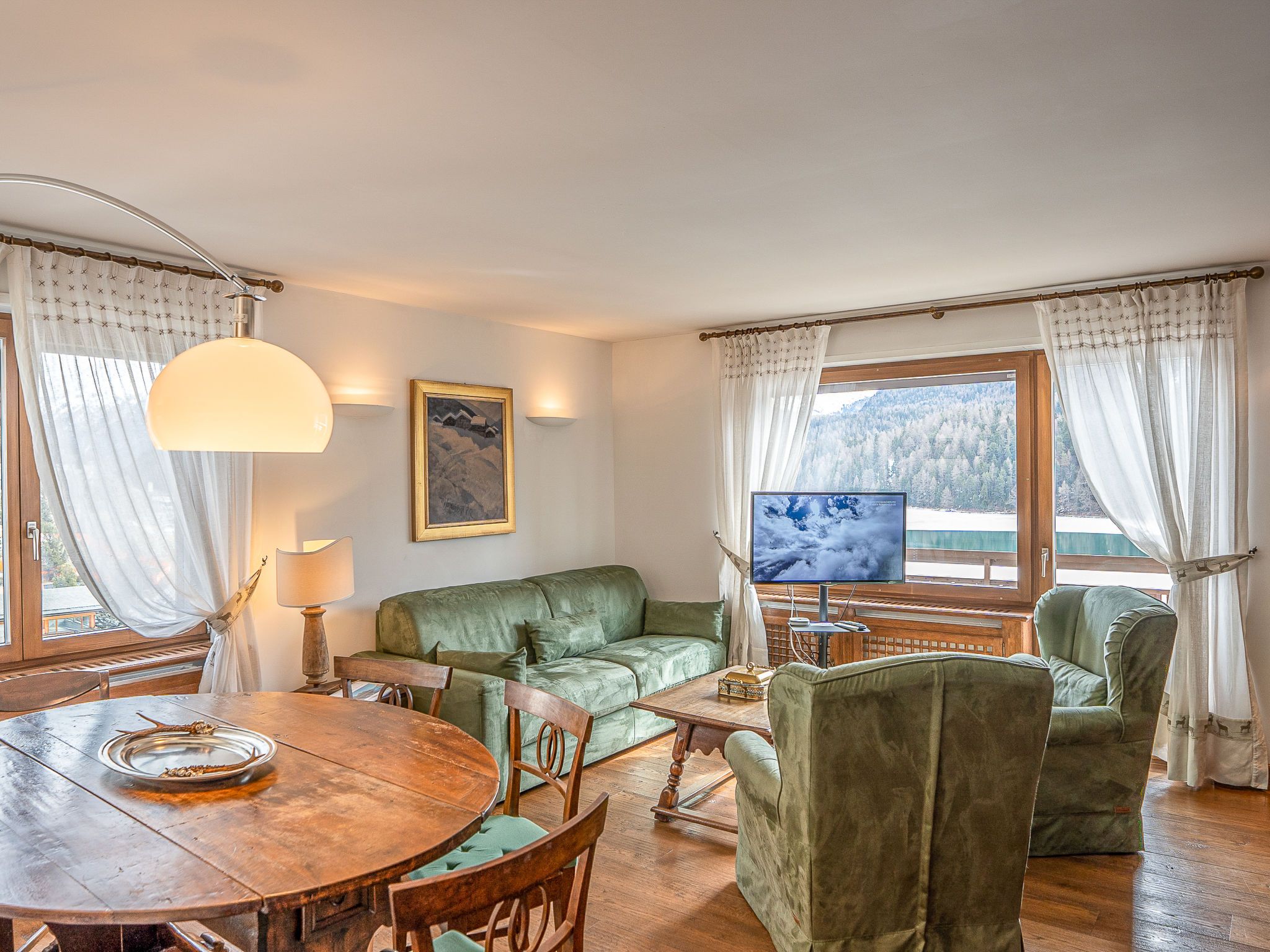 Chesa Sonnalpine B 48, 3-Zimmer-Wohnung 85 m2, im Dachgeschoss. Hell, geschmackvoll und stilvoll eingerichtet: Wohn-/Esszimmer mit TV (Flachbildschirm). Ausgang zum Balkon. Kleines Wohn-/Schlafzimmer mit 1 Diwanbett (140 cm, Länge 190 cm). Ausgang zum Balkon, Richtung Süden. 1 Doppelzimmer mit 1 Doppelbett (1 x 180 cm, Länge 200 cm), Bad/Dusche/Bidet/WC. Küche (Backofen, Geschirrspüler, 4 Induktionskochplatten, Toaster, Wasserkocher, Tiefkühler, elektrische Kaffeemaschine, Kapseln für die Kaffeemaschine (Nespresso) extra). Dusche/WC. Parkettboden. Balkonmöbel. Panoramasicht auf den See, die Berge, die Landschaft und die Ortschaft. Zur Verfügung: Bügeleisen, Haartrockner. Internet (Wireless LAN, gratis). Garage Nr. 48, Höhe 185 cm, Breite 180 cm. Bitte beachten: Nichtraucher-Unterkunft, Nichtraucher-Haus. Maximal 1 Haustier/Hund erlaubt. :Parkplatz nur für Kleinwagen.