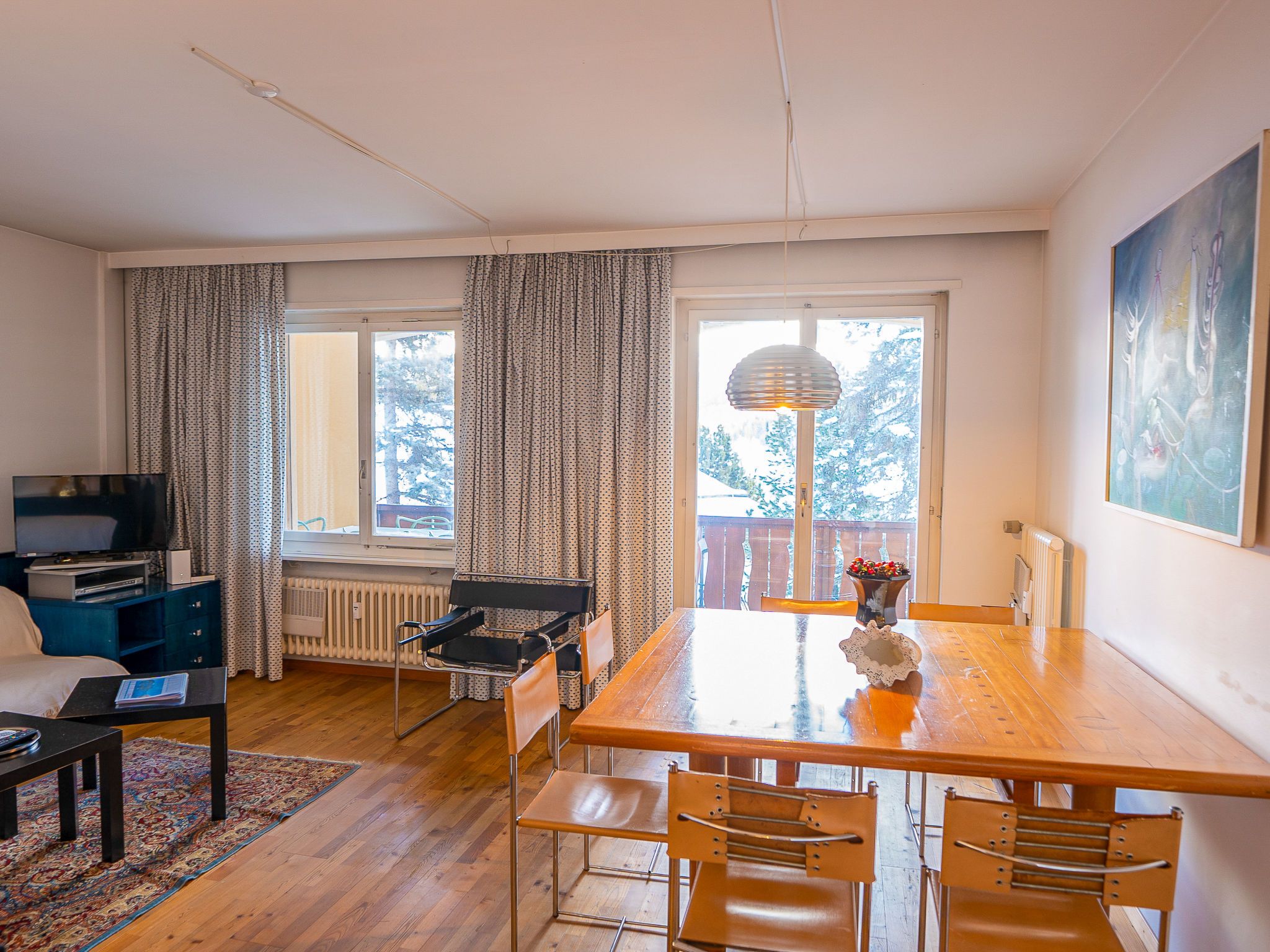 Chesa Romantica 17, 4-Zimmer-Wohnung 80 m2 im 3. Stock. Hell, zweckmässig und rustikal eingerichtet: Eingang. Wohn-/Esszimmer mit Esstisch und TV (Flachbildschirm). Ausgang zum Balkon, Richtung Osten. 1 Doppelzimmer mit 1 franz. Bett (160 cm, Länge 200 cm). 1 Zimmer mit 1 franz. Bett (140 cm, Länge 190 cm). 1 Zimmer mit 1 Bett (85 cm, Länge 185 cm). Küche (Backofen, Geschirrspüler, 4 Glaskeramikplatten, Toaster, Wasserkocher, elektrische Kaffeemaschine, Kapseln für die Kaffeemaschine (Nespresso) extra, Fondue Set (Käse)). Ausgang zum Balkon. Bad/Bidet/WC, Dusche/WC. Heizung. Grosser Balkon. Seitliche Sicht auf den See und die Berge. Zur Verfügung: Bügeleisen, Haartrockner. Internet (Wireless LAN, gratis). Garage Nr. 6, Höhe 205 cm, Breite 210 cm. Flexibilität bei der Bettenaufteilung: Es stehen mehr Schlafmöglichkeiten zur Verfügung als die maximal zugelassene Personenzahl, diese darf dennoch nicht überschritten werden.