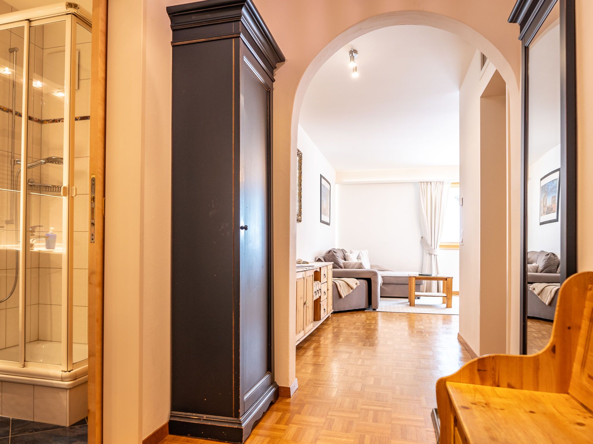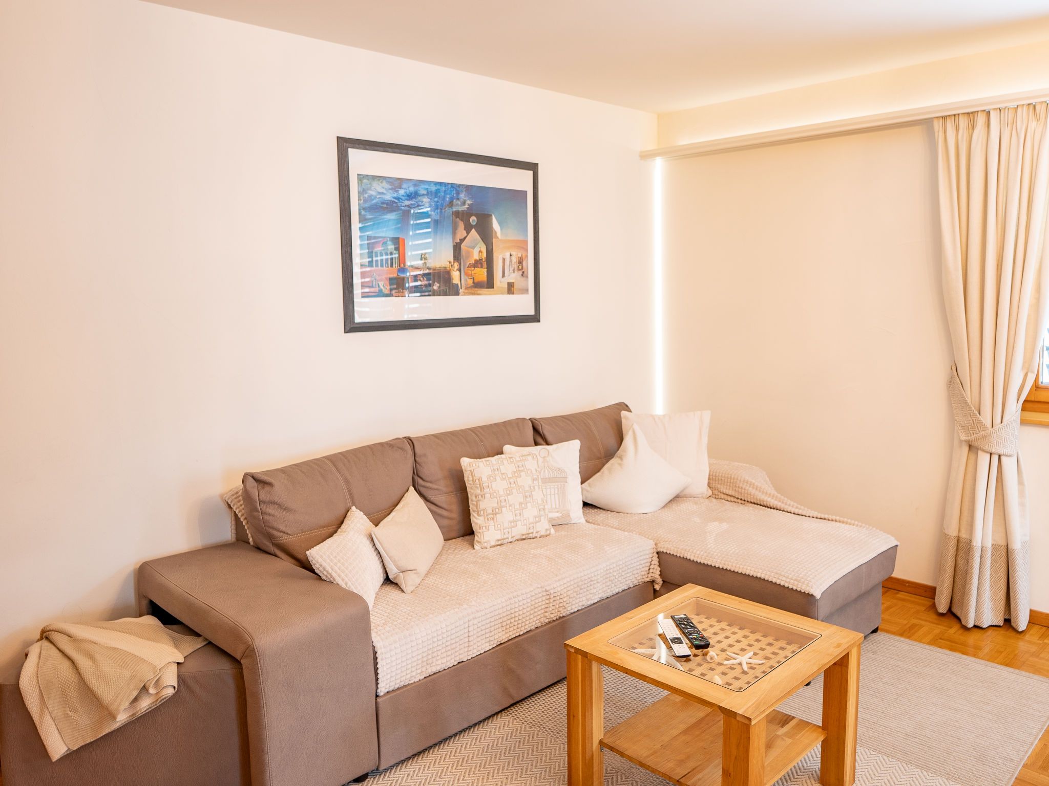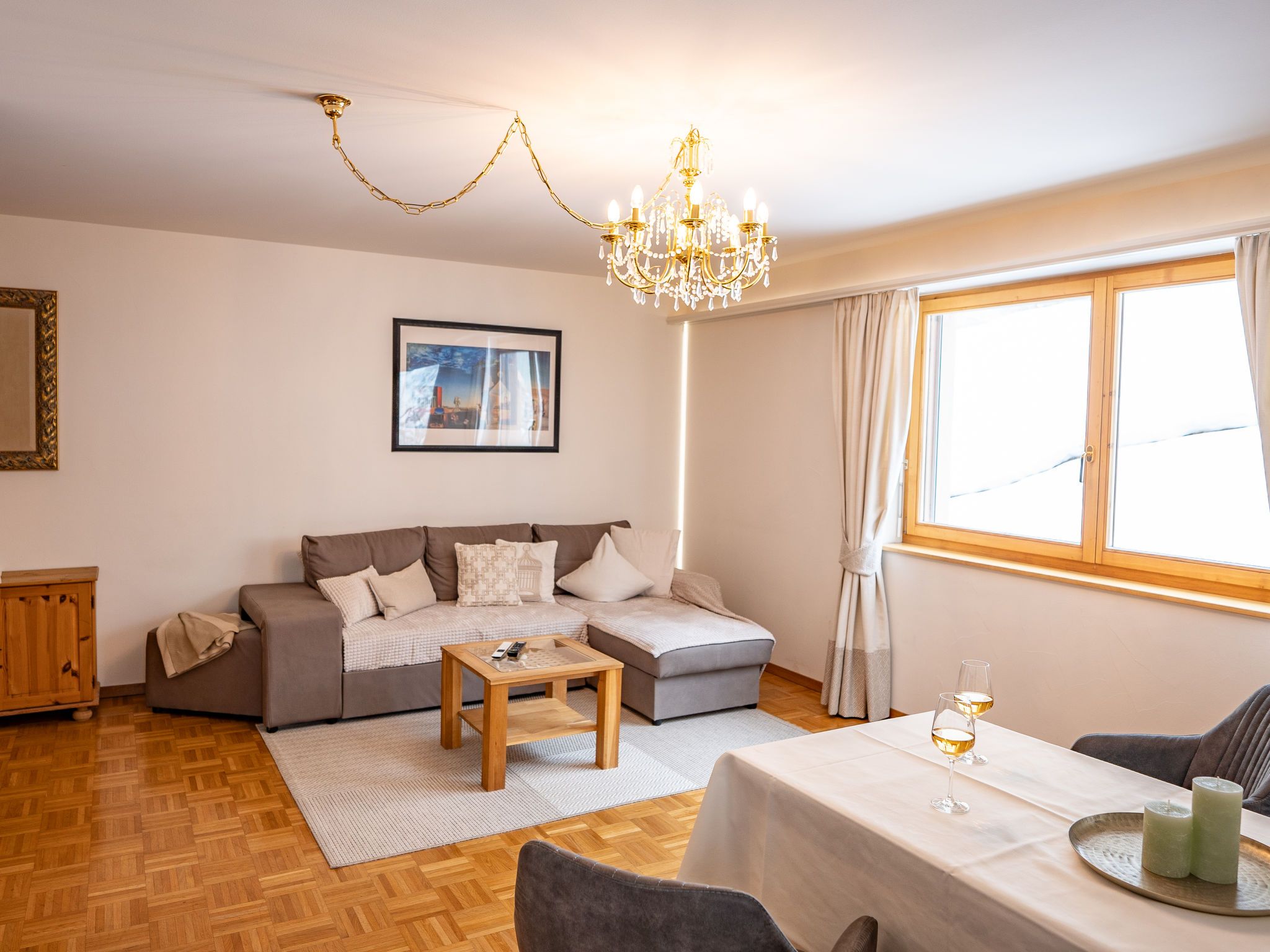 Chesa Sur Ova 30, 3-Zimmer-Wohnung 56 m2 im 4. Stock. Komfortabel und gemütlich eingerichtet: Wohn-/Esszimmer mit Esstisch und TV (Flachbildschirm), Radio und CD. Ausgang zum Balkon. 1 Zimmer mit 1 franz. Bett (1 x 160 cm, Länge 200 cm). Ausgang zum Balkon. 1 kleines Zimmer, ohne Fenster mit 2 Betten (90 cm, Länge 195 cm). Offene Küche (Backofen, Geschirrspüler, Toaster, Wasserkocher, elektrische Kaffeemaschine, Kapseln für die Kaffeemaschine (Nespresso) extra, Racletteofen, Fondue Set (Käse)). Dusche/WC. Bodenheizung. Parkettboden. 2 kleine Balkone. Sicht auf die Ortschaft. Zur Verfügung: Bügeleisen, Haartrockner. Internet (Wireless LAN, gratis). Garage Nr. 1, Höhe 200 cm, Breite 230 cm. Bitte beachten: geeignet für Familien. Nichtraucher-Unterkunft. Flexibilität bei der Bettenaufteilung: Es stehen mehr Schlafmöglichkeiten zur Verfügung als die maximal zugelassene Personenzahl, diese darf dennoch nicht überschritten werden.
