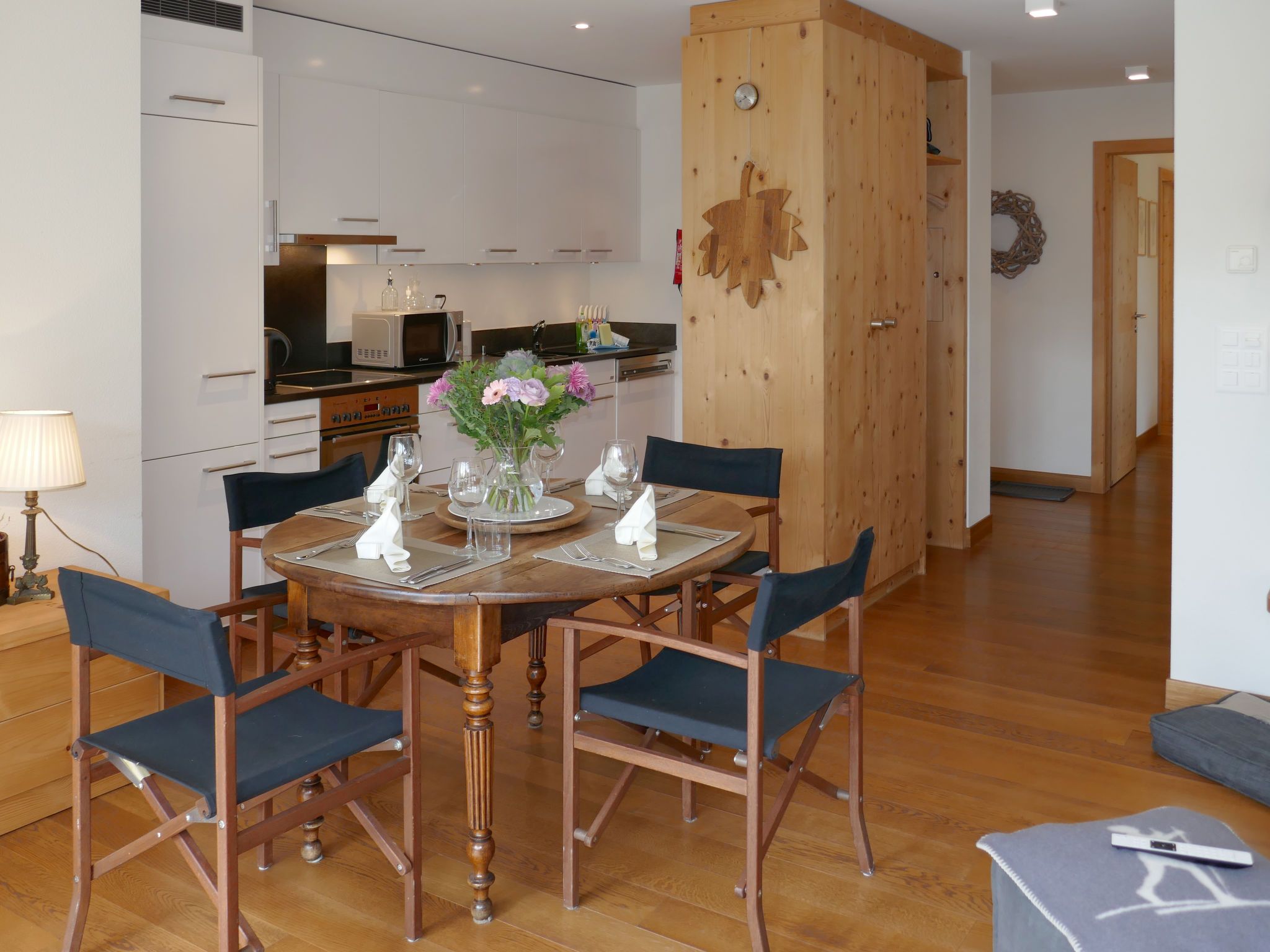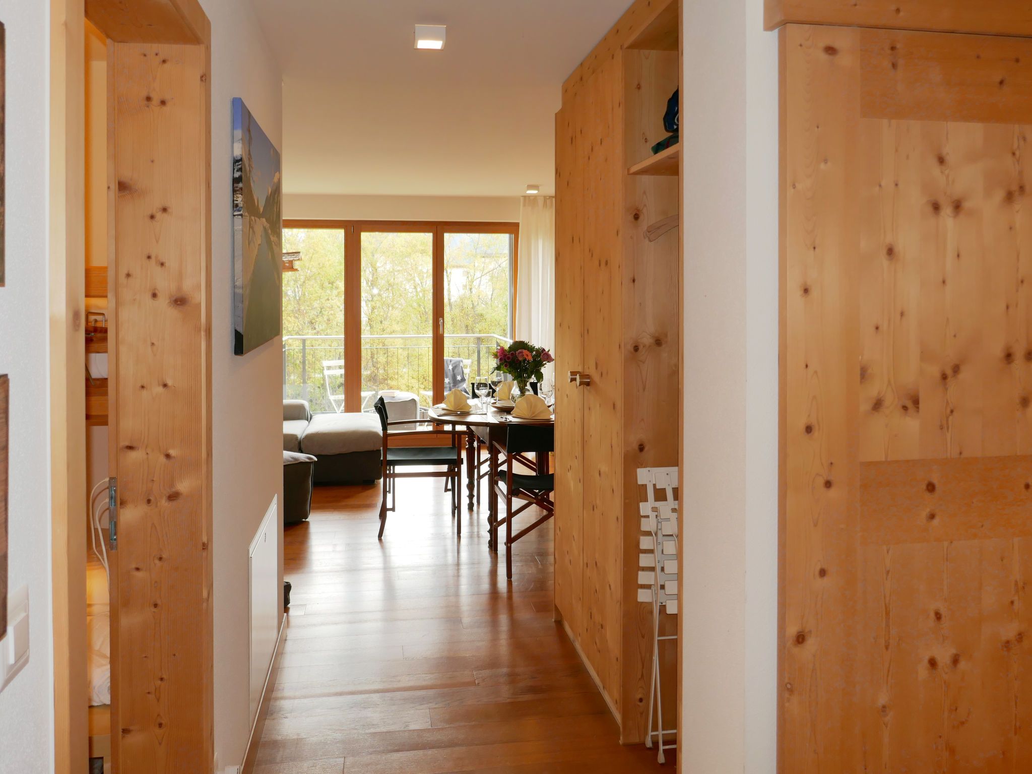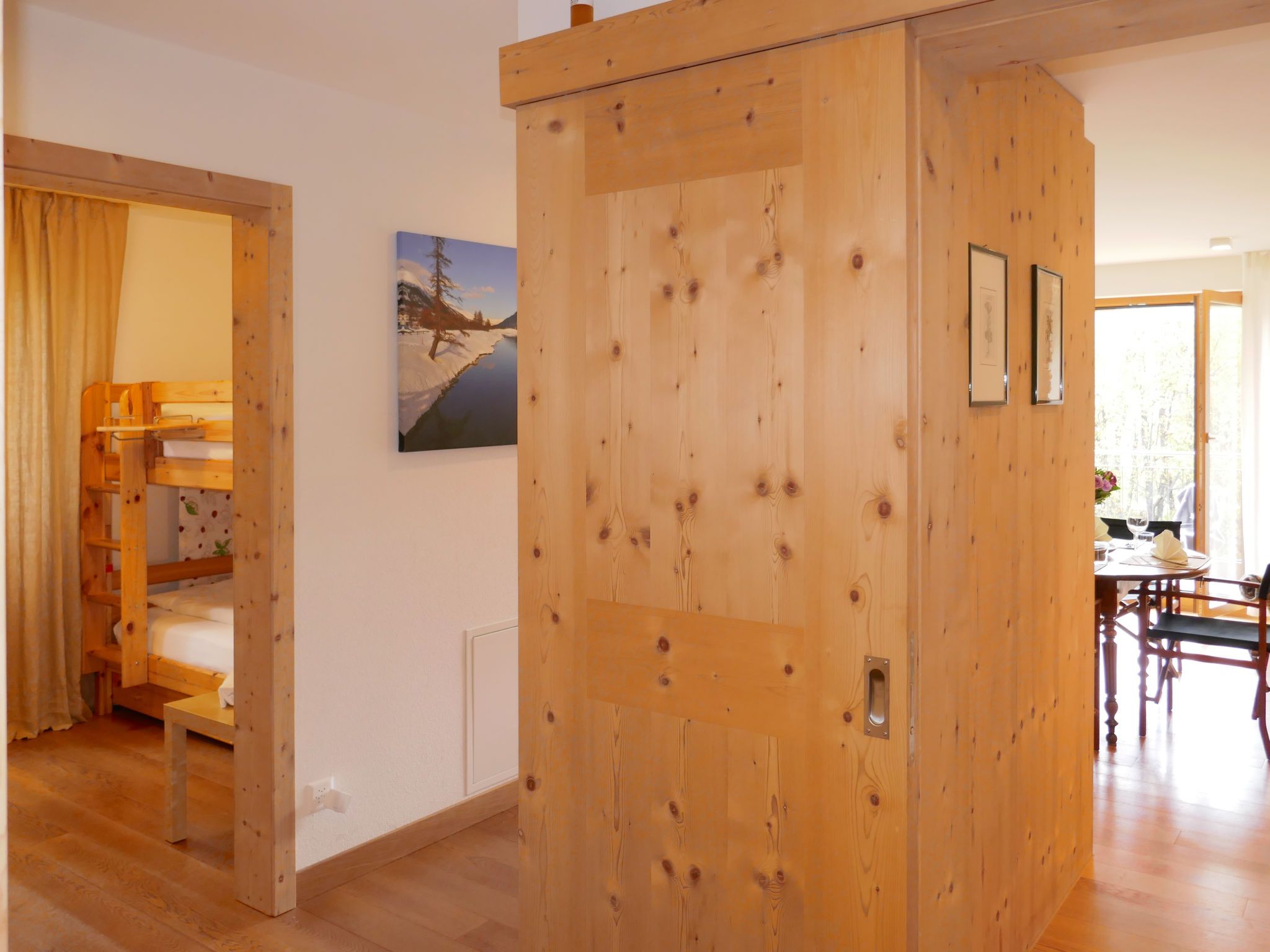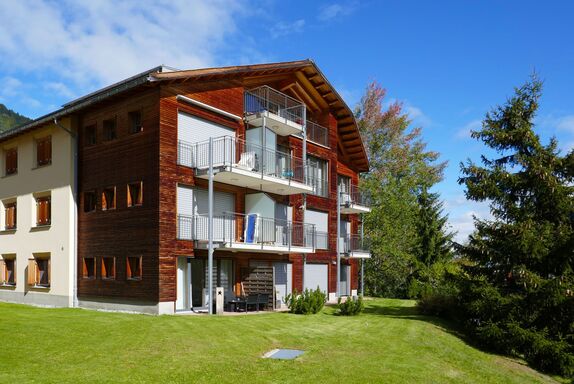 Chesa San Bastiaun B4, 3-Zimmer-Wohnung 60 m2 im 1. Stock, Südostlage. Objekt geeignet für 2 Erwachsene + 2 Kinder. Hell, geschmackvoll und gemütlich eingerichtet: Wohn-/Esszimmer mit Esstisch und TV (Flachbildschirm), DVD. Ausgang zum Balkon. 1 Doppelzimmer 10 m2 mit 1 franz. Bett (1 x 160 cm, Länge 200 cm). 1 Kinderzimmer 6 m2 mit 1 x 2 Etagenbetten (2 x 90 cm, Länge 190 cm). Offene Küche (Backofen, Geschirrspüler, 4 Glaskeramikplatten, Toaster, Wasserkocher, Mikrowelle, elektrische Kaffeemaschine, Kapseln für die Kaffeemaschine (Nespresso) extra, Racletteofen, Fondue Set (Chinoise, Käse)). Bad/Bidet/WC, Dusche/WC. Heizung. Holzdielenboden. Balkonmöbel. Sehr schöne Sicht auf die Berge und den Fluss. Zur Verfügung: Bügeleisen, Haartrockner. Internet (Wireless LAN, gratis). Garage Nr. B4 auf dem Grundstück (1 Auto), Höhe 230 cm, Breite 250 cm. Bitte beachten: geeignet für Familien. Nichtraucher-Unterkunft, Nichtraucher-Haus.