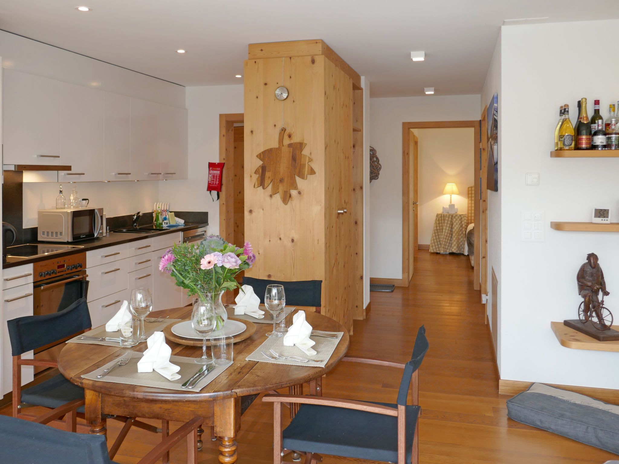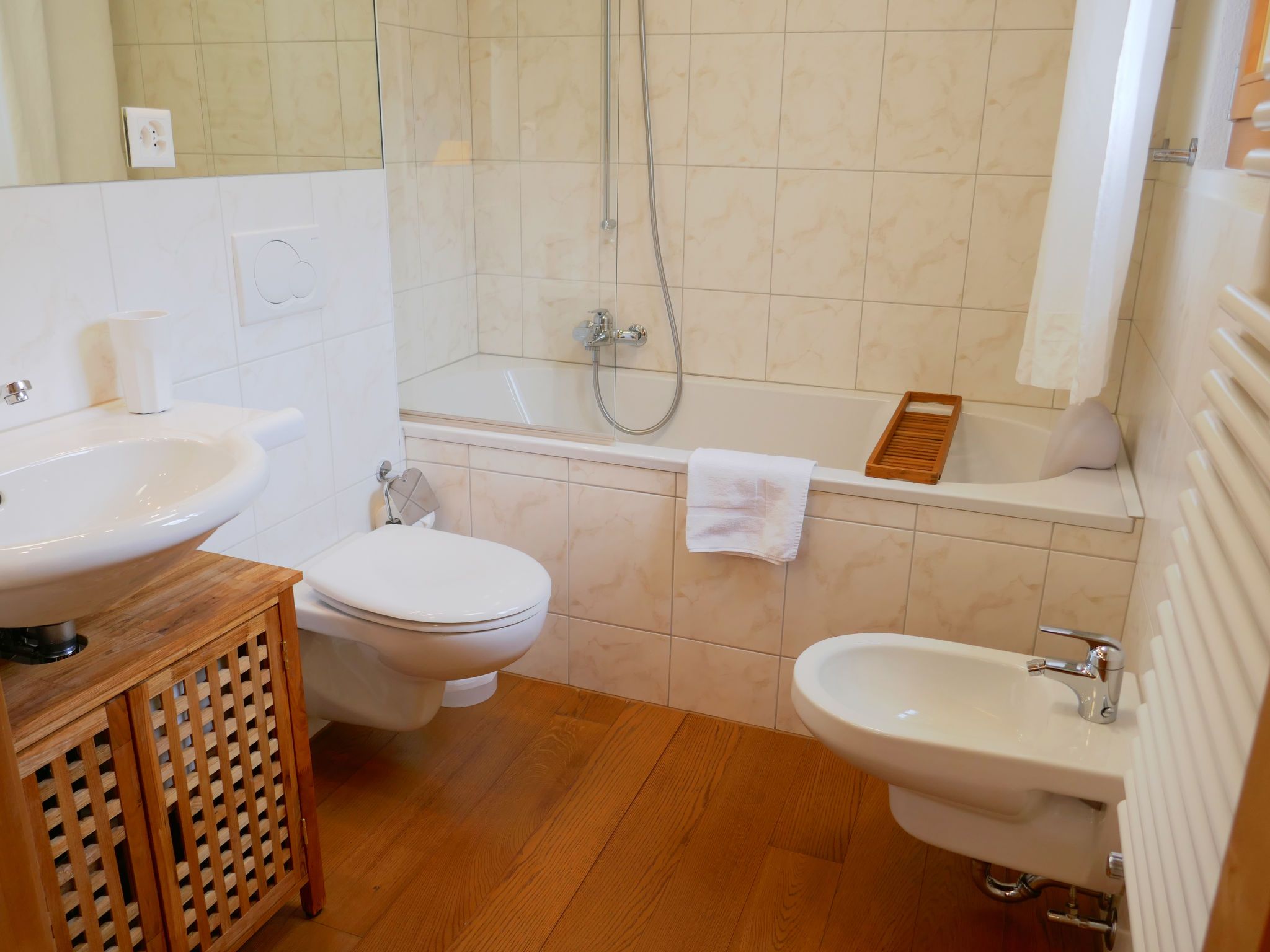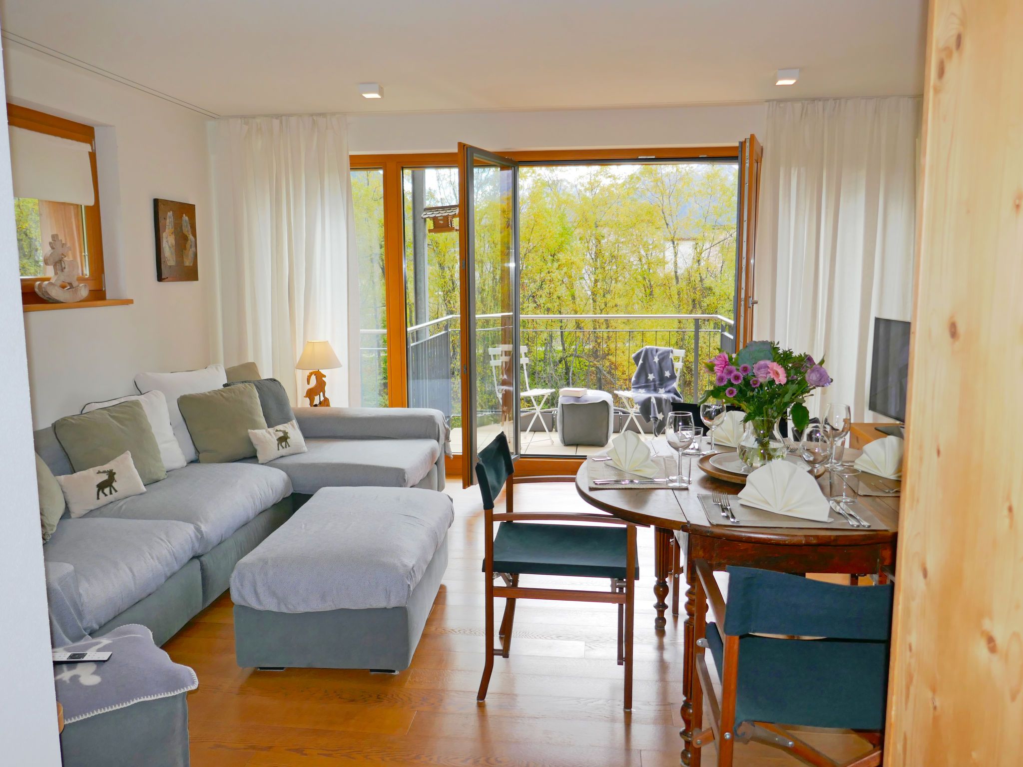 Chesa San Bastiaun B4, 3-Zimmer-Wohnung 60 m2 im 1. Stock, Südostlage. Objekt geeignet für 2 Erwachsene + 2 Kinder. Hell, geschmackvoll und gemütlich eingerichtet: Wohn-/Esszimmer mit Esstisch und TV (Flachbildschirm), DVD. Ausgang zum Balkon. 1 Doppelzimmer 10 m2 mit 1 franz. Bett (1 x 160 cm, Länge 200 cm). 1 Kinderzimmer 6 m2 mit 1 x 2 Etagenbetten (2 x 90 cm, Länge 190 cm). Offene Küche (Backofen, Geschirrspüler, 4 Glaskeramikplatten, Toaster, Wasserkocher, Mikrowelle, elektrische Kaffeemaschine, Kapseln für die Kaffeemaschine (Nespresso) extra, Racletteofen, Fondue Set (Chinoise, Käse)). Bad/Bidet/WC, Dusche/WC. Heizung. Holzdielenboden. Balkonmöbel. Sehr schöne Sicht auf die Berge und den Fluss. Zur Verfügung: Bügeleisen, Haartrockner. Internet (Wireless LAN, gratis). Garage Nr. B4 auf dem Grundstück (1 Auto), Höhe 230 cm, Breite 250 cm. Bitte beachten: geeignet für Familien. Nichtraucher-Unterkunft, Nichtraucher-Haus.