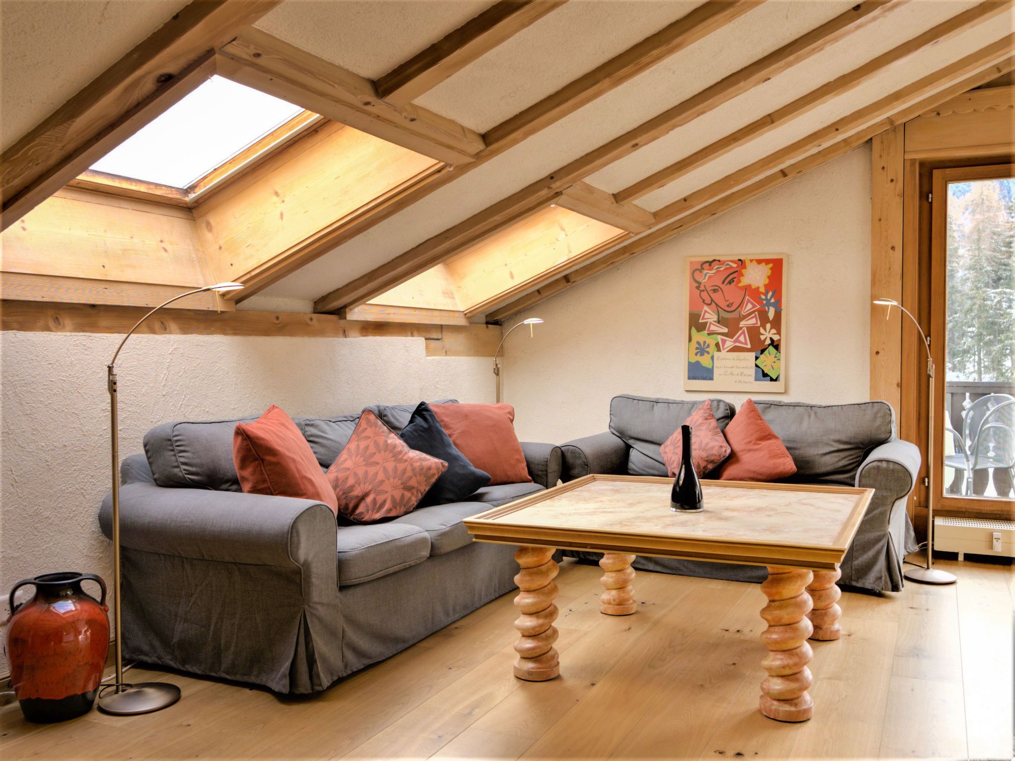 Chesa Misaun, 3-Zimmer-Wohnung 95 m2 auf 2 Stockwerken, im Dachgeschoss. Gemütlich und mit viel Holz eingerichtet: grosses Wohn-/Esszimmer mit offenem Kamin, Essecke und Sat-TV (Flachbildschirm), Radio. Ausgang zum Balkon, Richtung Süden. 1 Zimmer mit 1 Doppelbett (2 x 90 cm, Länge 185 cm), Bad/WC. Ausgang zum Balkon. Küche (Backofen, Geschirrspüler, 4 Glaskeramikplatten, Toaster, Wasserkocher, Mikrowelle, Tiefkühler, elektrische Kaffeemaschine, Kapseln für die Kaffeemaschine (Nespresso) extra, Fondue Set (Chinoise, Käse)). Dachgeschoss: (steile Treppe) abgeschrägte, offene grosse Galerie mit 1 Bett (120 cm, Länge 200 cm), 1 Doppelbett (2 x 90 cm, Länge 200 cm), Dusche/WC. 2 kleine Balkone. Terrassenmöbel (3). Sehr schöne Sicht auf die Berge, den Fluss und den Wald. Zur Verfügung: Bügeleisen, Haartrockner. Internet (Wireless LAN, gratis). Garage Nr. 6 in 300 m, Höhe 200 cm, Breite 225 cm. Maximal 1 Haustier/Hund erlaubt. Anstelle eines abgeschlossenen Schlafzimmers befinden sich manche Schlafplätze in einem offenen Bereich (Galerie, Nische etc.).