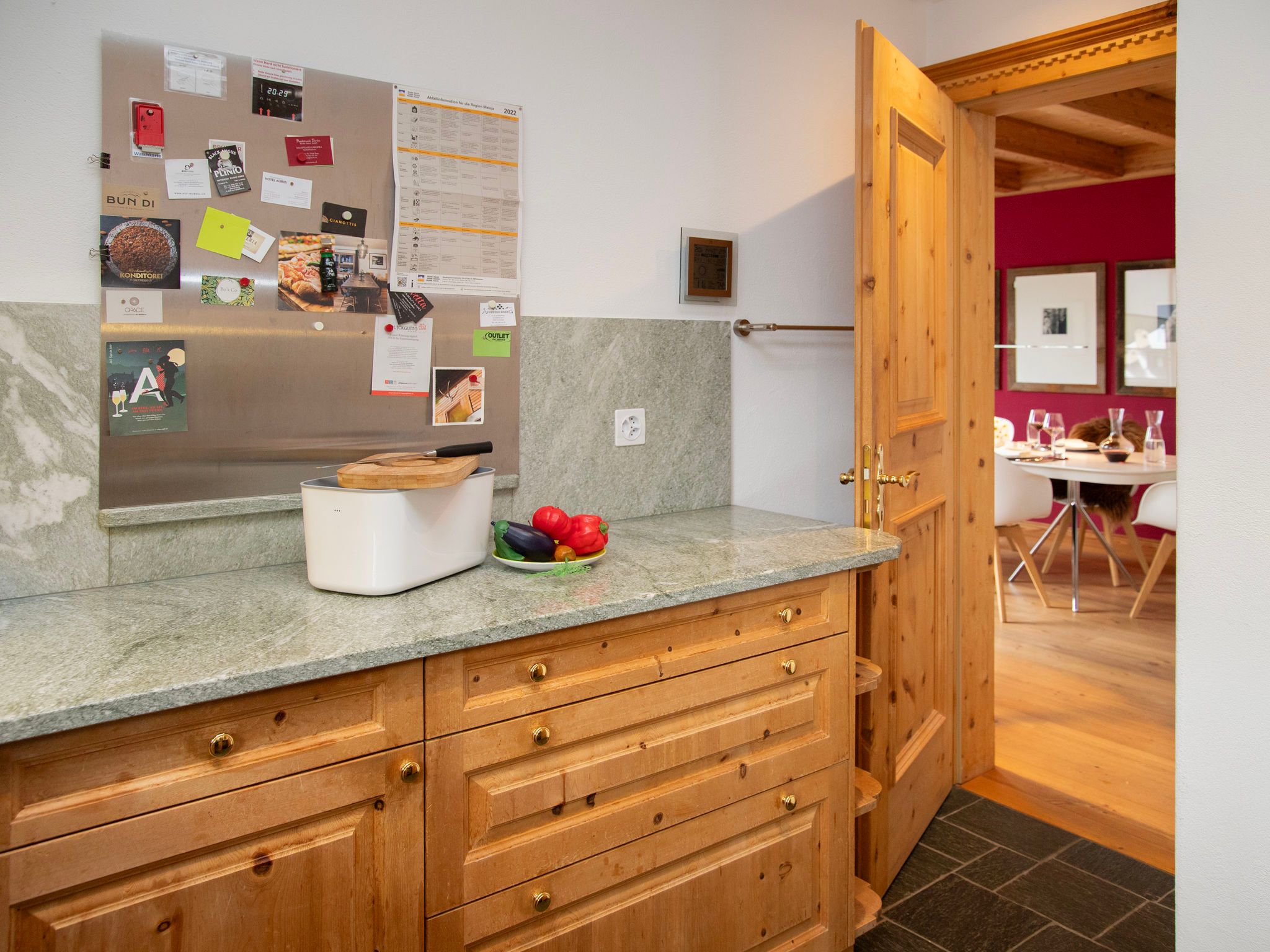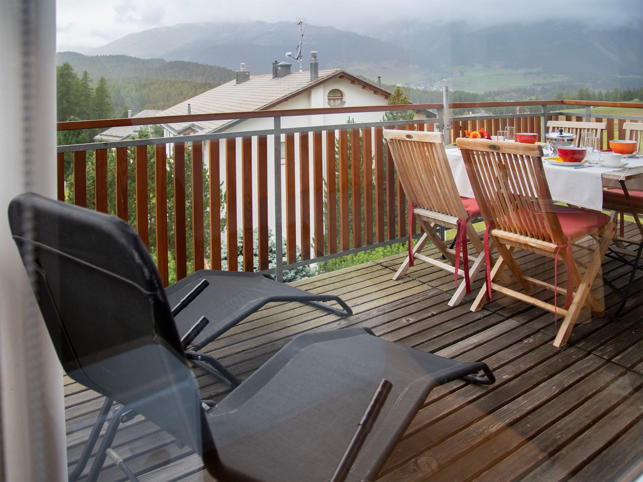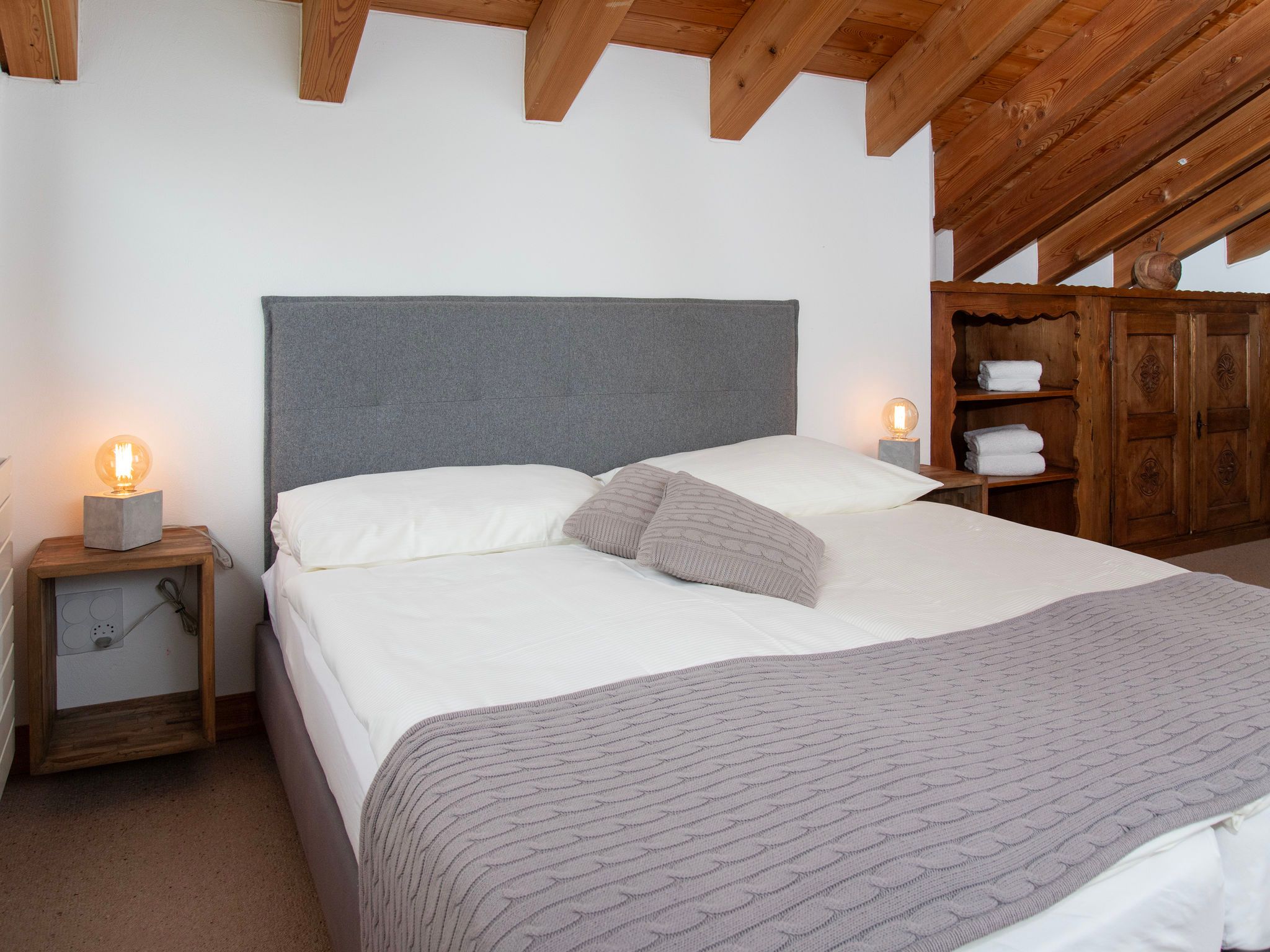 Chesa Vadret 12, 3-Zimmer-Wohnung 110 m2 auf 2 Stockwerken, im Dachgeschoss. Geräumig und hell, teilweise abgeschrägt, komfortabel und modern eingerichtet: offenes Wohn-/Esszimmer. Ausgang Richtung Westen. 1 Zimmer mit 1 franz. Bett (1 x 160 cm, Länge 200 cm), Bad/Bidet/WC. Küche (Backofen, Geschirrspüler, 4 Glaskeramikplatten, Toaster, Wasserkocher, elektrische Kaffeemaschine, Kapseln für die Kaffeemaschine (Nespresso) extra, Fondue Set (Käse)). Dusche/WC. Heizung. Obergeschoss: offene grosse Galerie mit 1 franz. Bett (2 x 80 cm, Länge 200 cm). Offenes Durchgangszimmer mit TV. Grosser Balkon 10 m2. Balkonmöbel. Herrliche Panoramasicht auf die Berge und das Tal. Zur Verfügung: Bügeleisen, Haartrockner. Internet (WLAN, gratis). Garage Nr. Vadret 12, Höhe 225 cm, Breite 250 cm. Bitte beachten: nicht geeignet für Kinder unter 6 Jahren. Nichtraucher-Unterkunft. Anstelle eines abgeschlossenen Schlafzimmers befinden sich manche Schlafplätze in einem offenen Bereich (Galerie, Nische etc.).