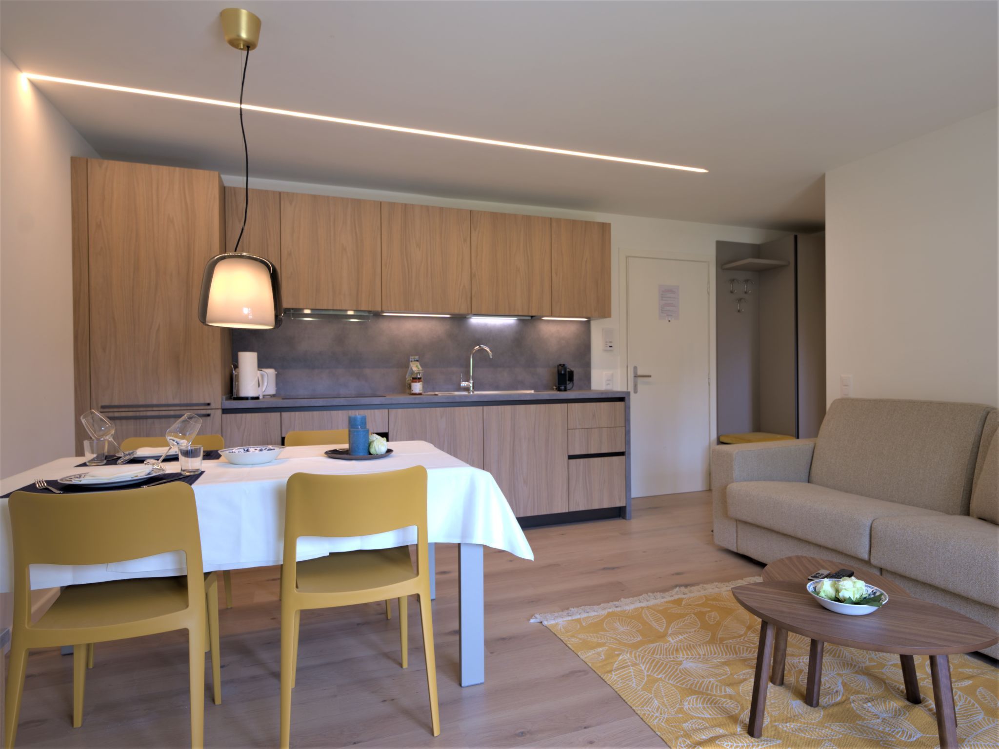 Chesa Stè 8, 2-Zimmer-Wohnung 40 m2 im 2. Stock. Geräumig und hell, vollständig renoviert im Jahre 2021, modern und geschmackvoll eingerichtet: Wohn-/Esszimmer mit Esstisch und TV (Flachbildschirm). Ausgang zum Balkon. 1 Doppelzimmer mit 1 franz. Bett (1 x 160 cm, Länge 200 cm). Offene Küche (Backofen, Geschirrspüler, 4 Induktionskochplatten, Toaster, Wasserkocher, Tiefkühler, elektrische Kaffeemaschine, Kapseln für die Kaffeemaschine (Nespresso) extra, Fondue Set (Käse)). Dusche/Bidet/WC. Heizung. Kleiner Balkon. Balkonmöbel. Sehr schöne Sicht auf die Berge und die Landschaft. Zur Verfügung: Haartrockner. Internet (Wireless LAN, gratis). Garage Nr. Apt. 8 (1 Auto), Höhe 200 cm, Breite 210 cm. Bitte beachten: Nichtraucher-Unterkunft, Nichtraucher-Haus. Maximal 1 Haustier/Hund erlaubt. Kein Fahrstuhl.