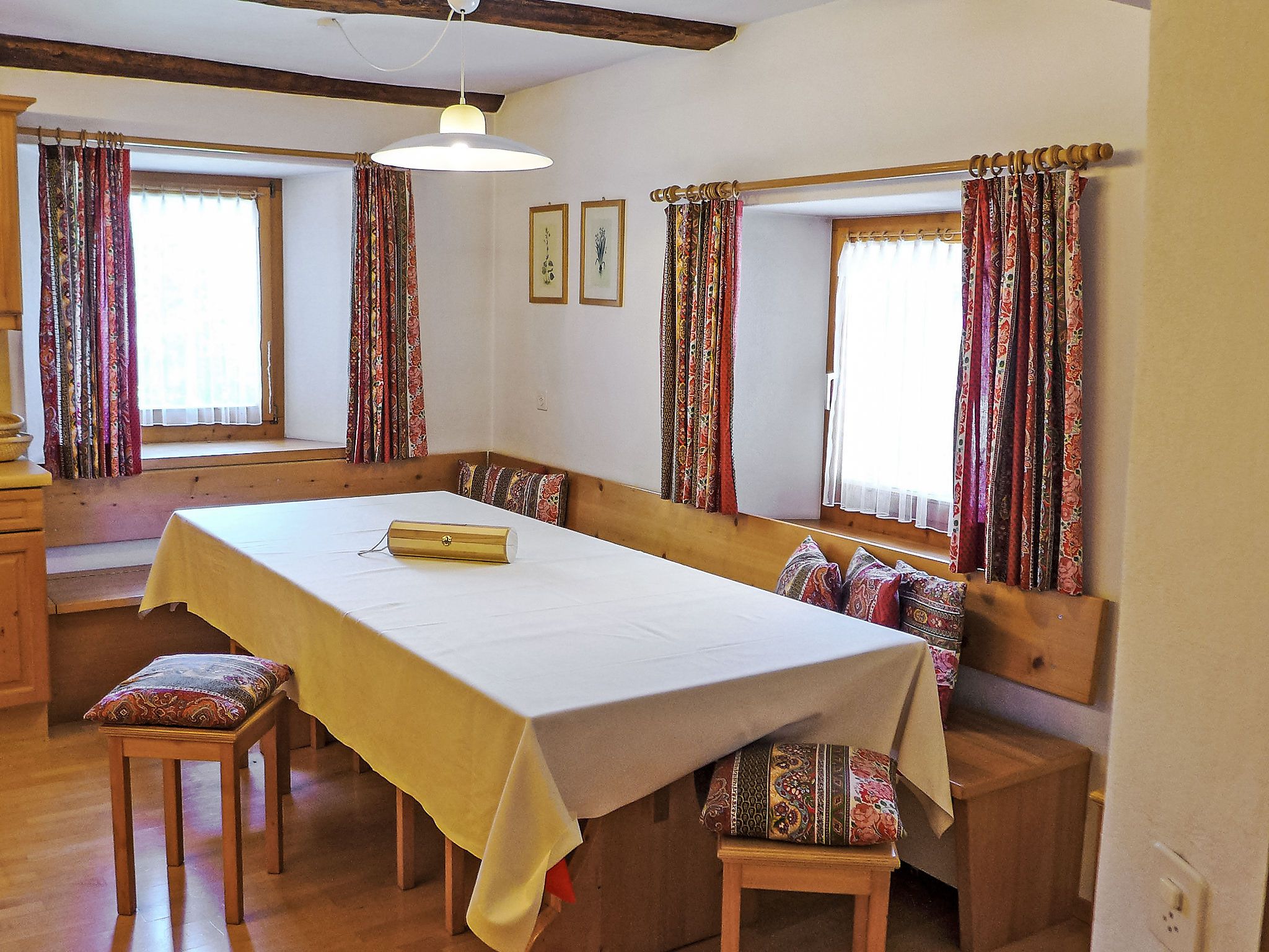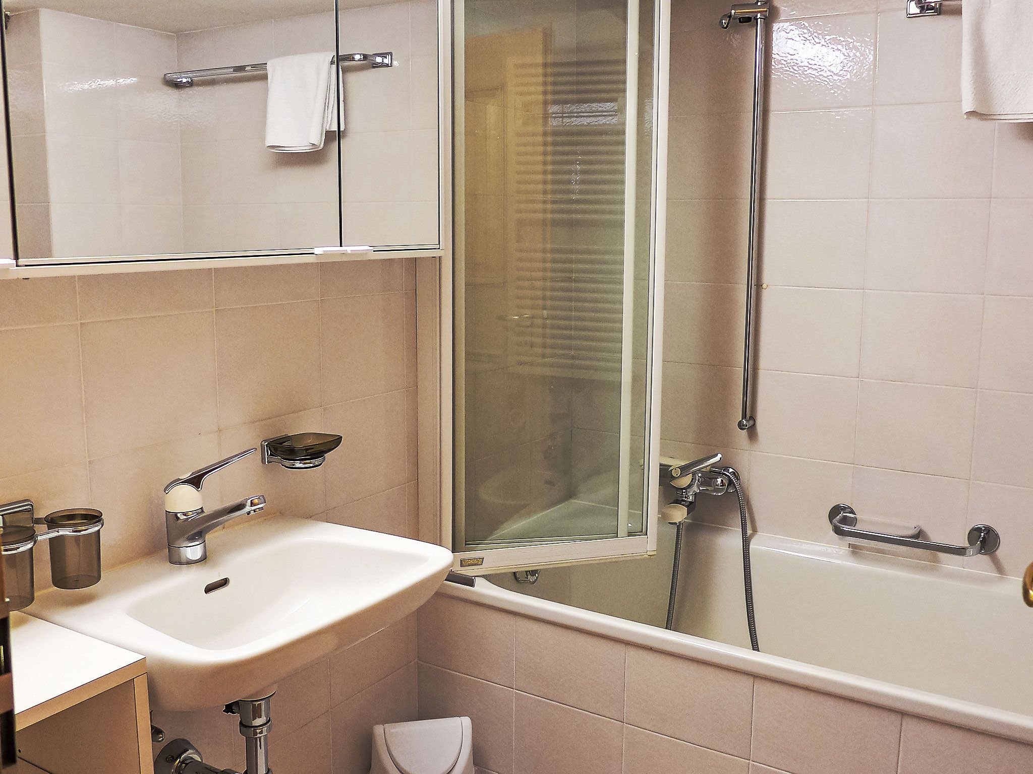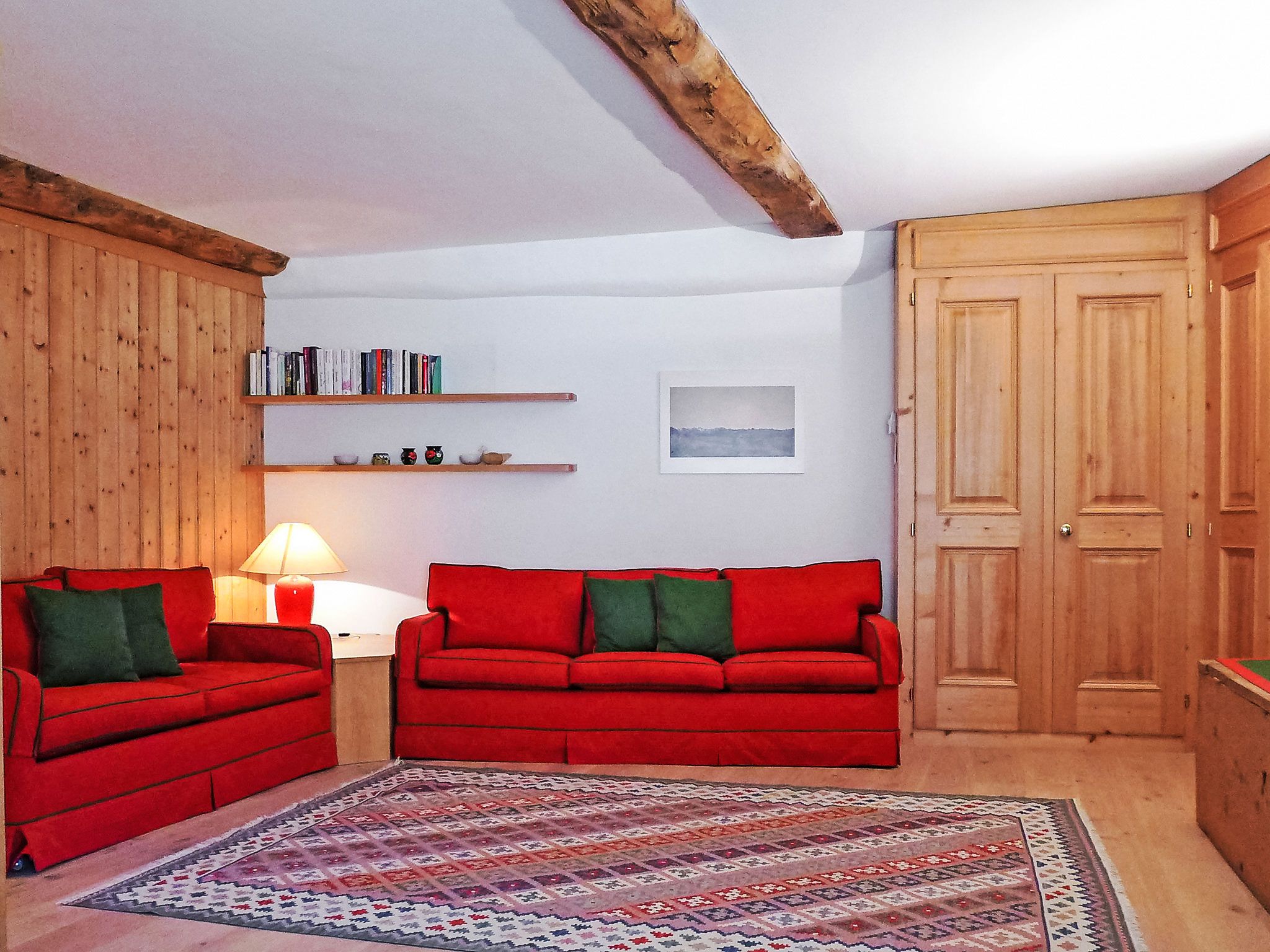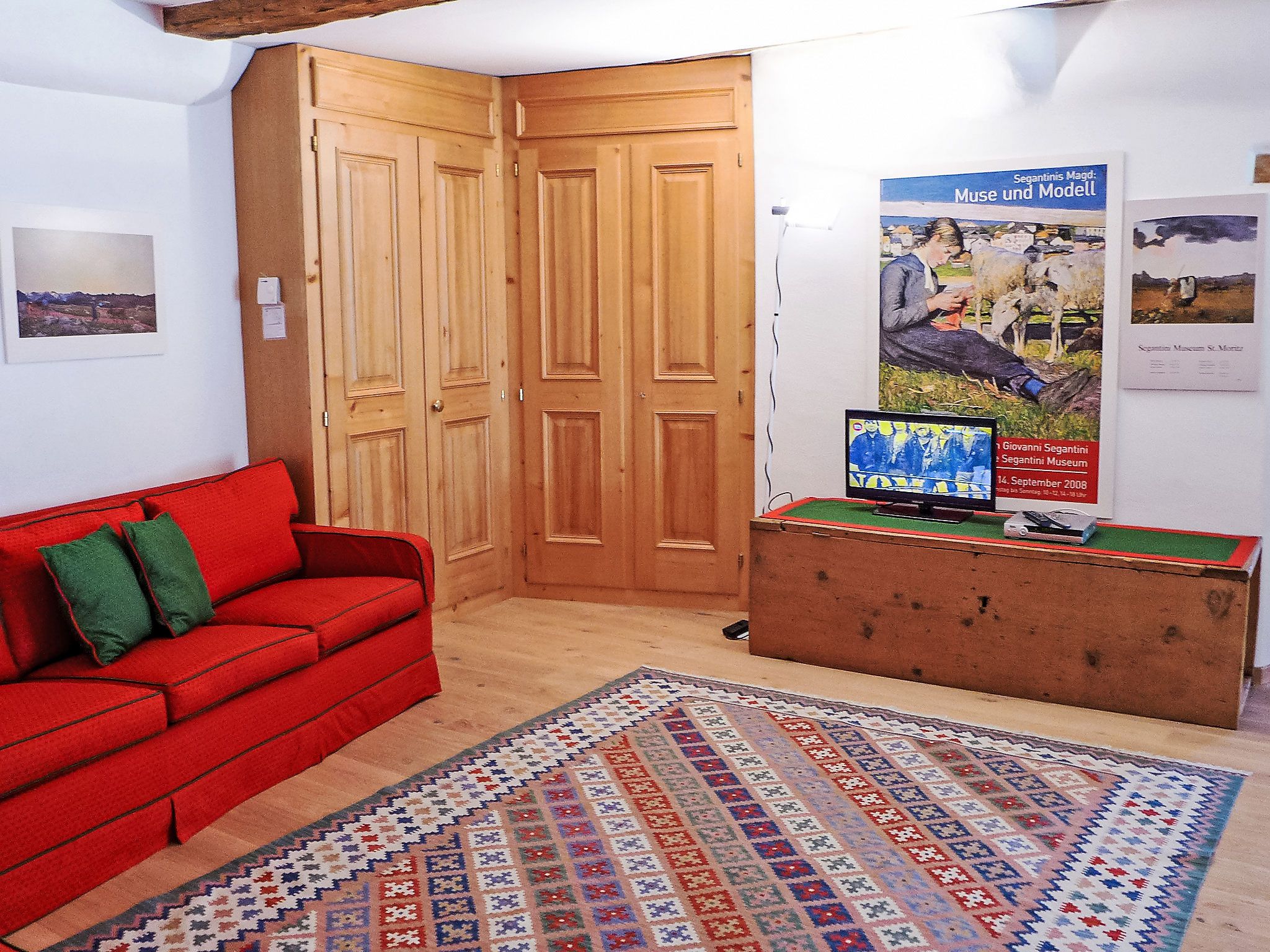 Chesa Frizzoni, 2-Zimmer-Wohnung 70 m2, im Erdgeschoss. Einfach und zweckmässig eingerichtet: Wohn-/Schlafzimmer, Fenster zum Hof mit 2 Diwanbetten und TV (Flachbildschirm). 1 Zimmer mit begehbarem Kleiderschrank, ohne Fenster mit 1 Doppelbett (1 x 170 cm, Länge 200 cm). Grosse Küche (4 Kochplatten, Backofen, Geschirrspüler, Toaster, Wasserkocher, Mikrowelle, elektrische Kaffeemaschine, Kapseln für die Kaffeemaschine (Nespresso) extra) mit Esstisch. Bad/Bidet/WC. Heizung. Keine Sicht. Zur Verfügung: Haartrockner. Internet (Wireless LAN, extra). Garage Nr. 83 (500 m), Höhe 215 cm, Breite 225 cm. Bitte beachten: geeignet für Familien Wohnung auf Hofseite. Nichtraucher-Unterkunft. Flexibilität bei der Bettenaufteilung: Es stehen mehr Schlafmöglichkeiten zur Verfügung als die maximal zugelassene Personenzahl, diese darf dennoch nicht überschritten werden.