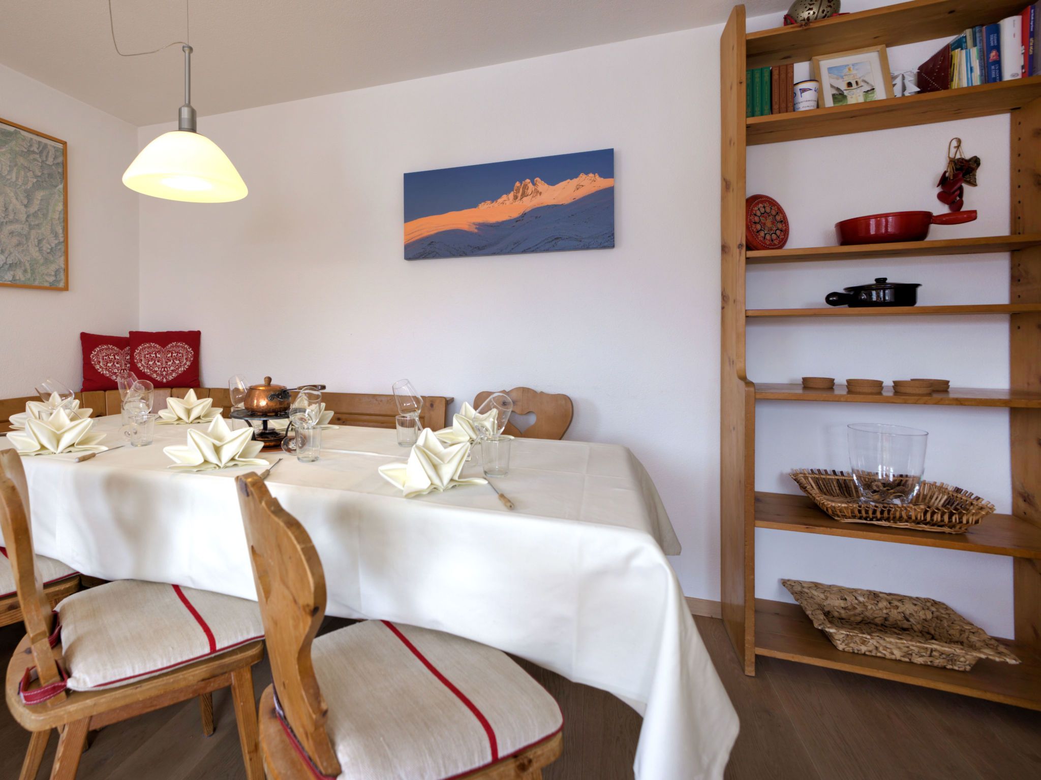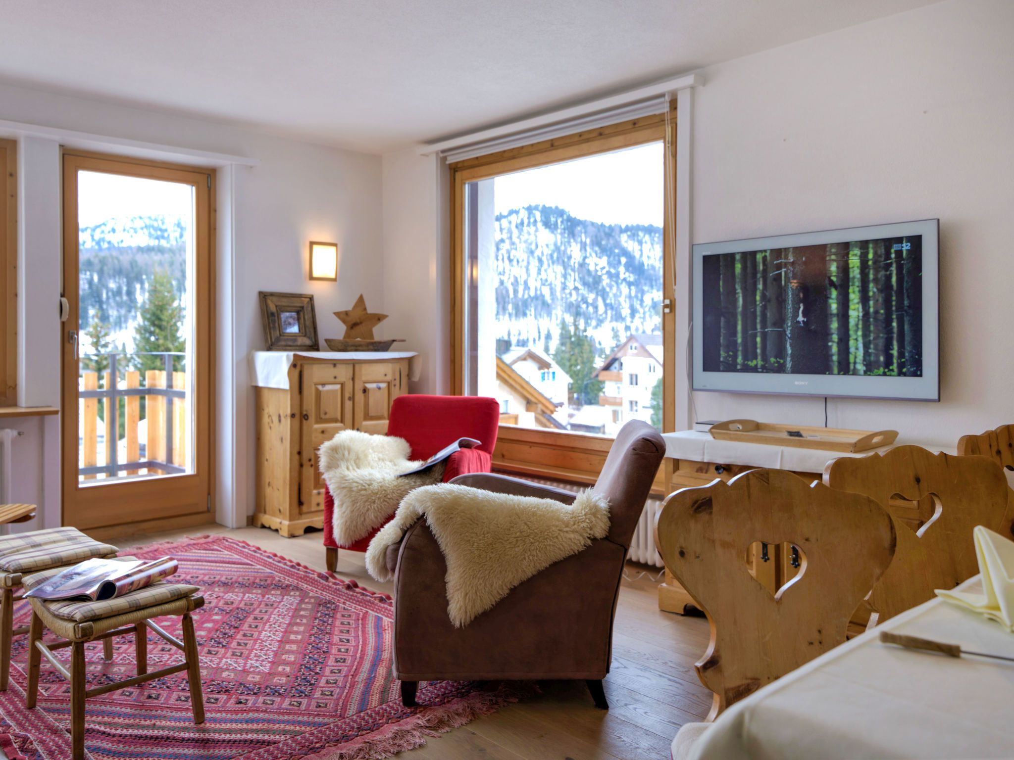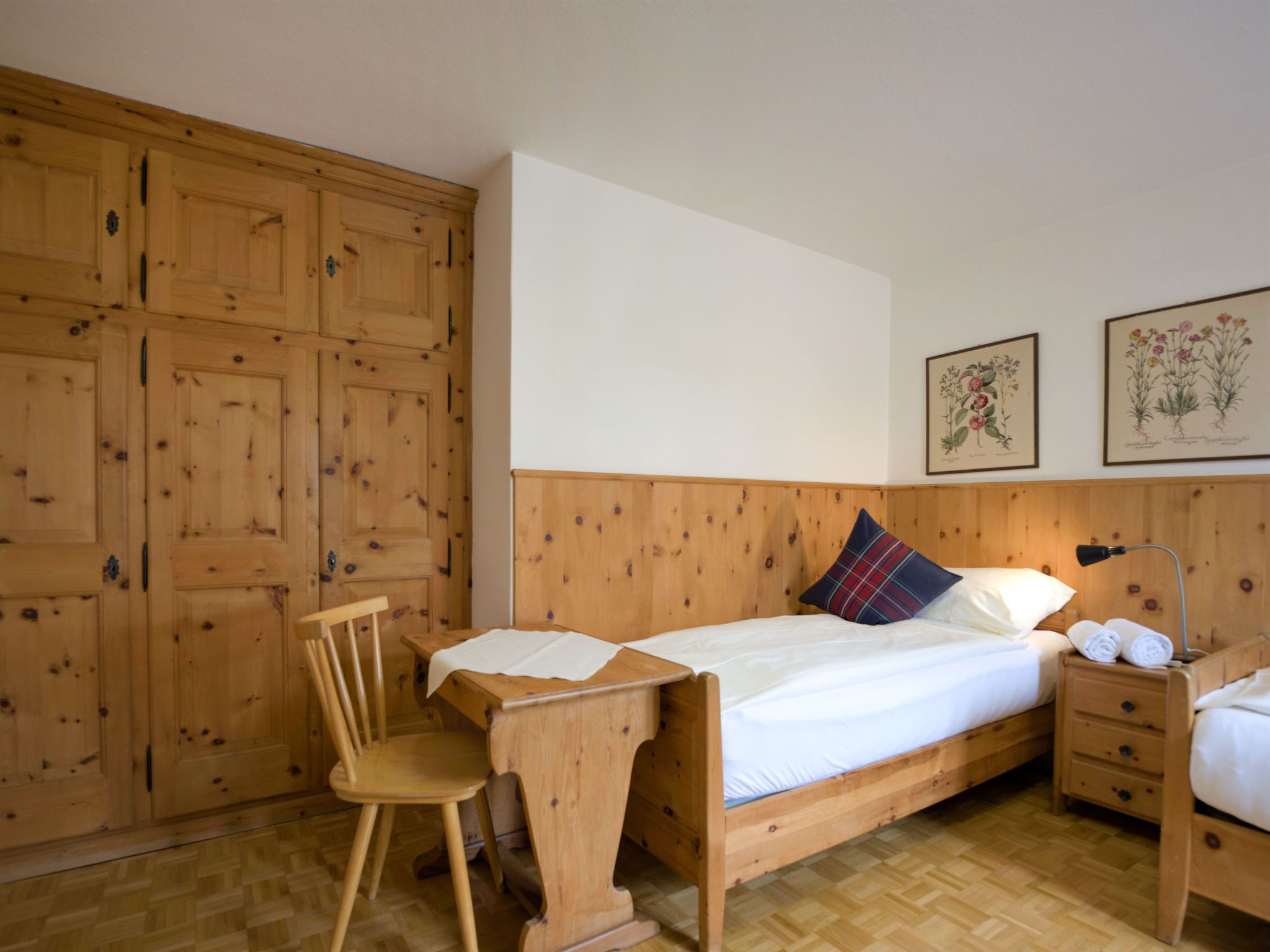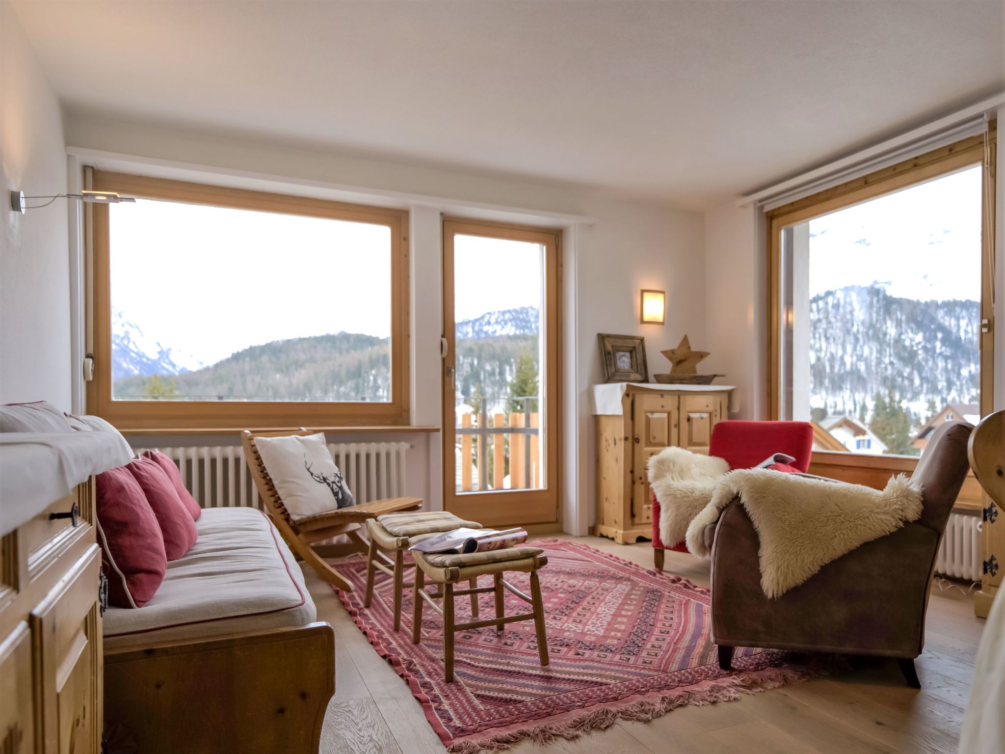 Chesa Villasimius, 4-Zimmer-Wohnung 85 m2 im 3. Stock. Hell, zweckmässig und mit viel Holz eingerichtet: offenes Wohn-/Esszimmer mit TV (Flachbildschirm). Ausgang zum Balkon. 1 Zimmer mit 1 Doppelbett (2 x 80 cm, Länge 190 cm), Waschbecken und sep. WC. 1 Zimmer mit 2 Betten (90 cm, Länge 200 cm). 1 Zimmer mit 3 Betten (85 cm, Länge 190 cm). Kleine Küche (Backofen, Geschirrspüler, 4 Glaskeramikplatten, Toaster, Wasserkocher, elektrische Kaffeemaschine, Kapseln für die Kaffeemaschine (Nespresso) extra, Fondue Set (Käse)). Bad/Bidet/WC. Heizung. Sehr schöne Panoramasicht auf die Berge. Zur Verfügung: Haartrockner. Internet (Wireless LAN, gratis). Parkplatz (1 Auto), Garage Nr. 4 (1 Auto), Höhe 195 cm, Breite 230 cm. Bitte beachten: geeignet für Familien. Nichtraucher-Unterkunft. Kein Fahrstuhl.