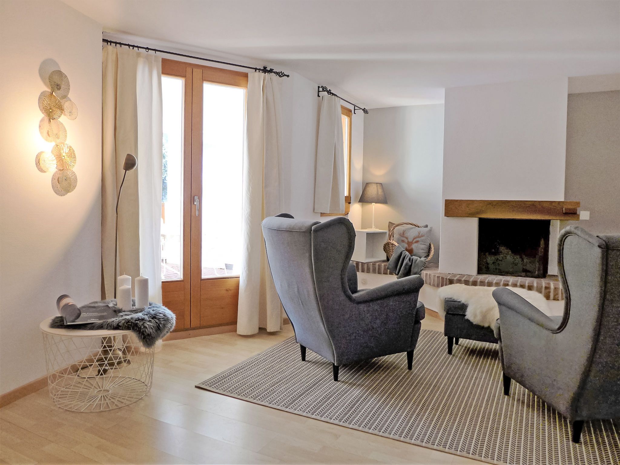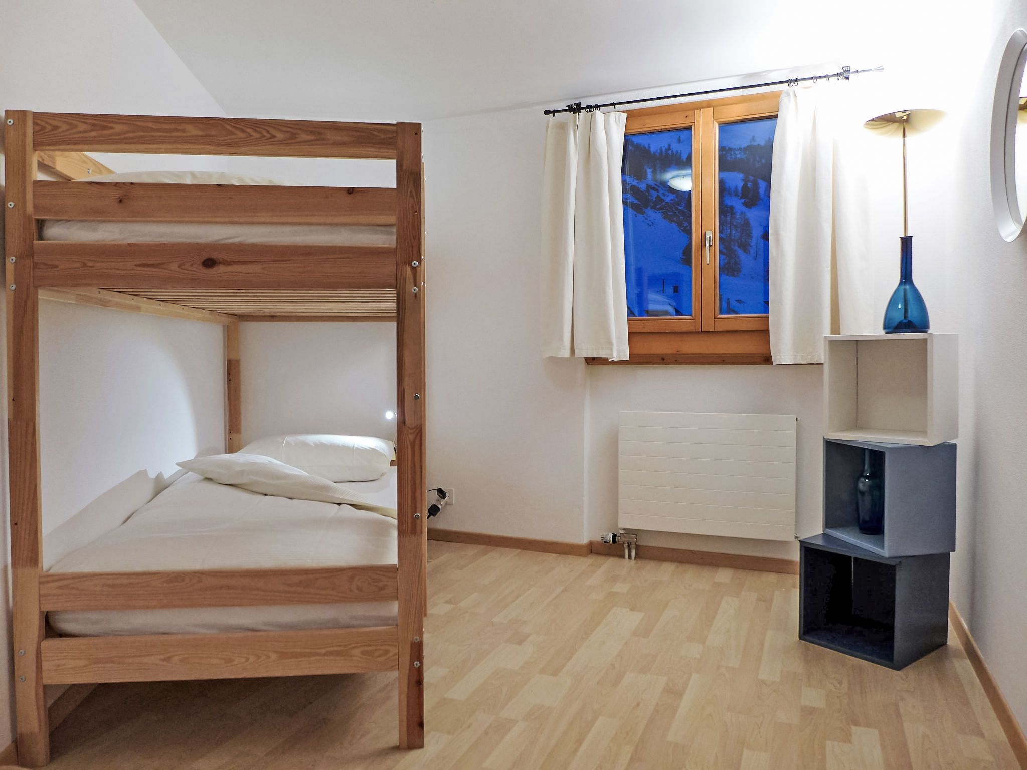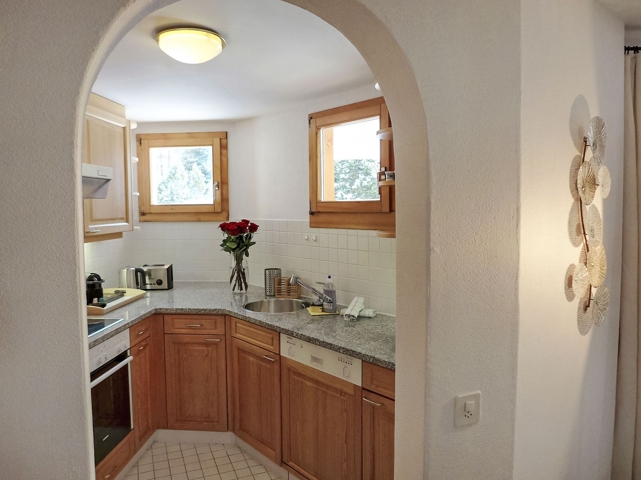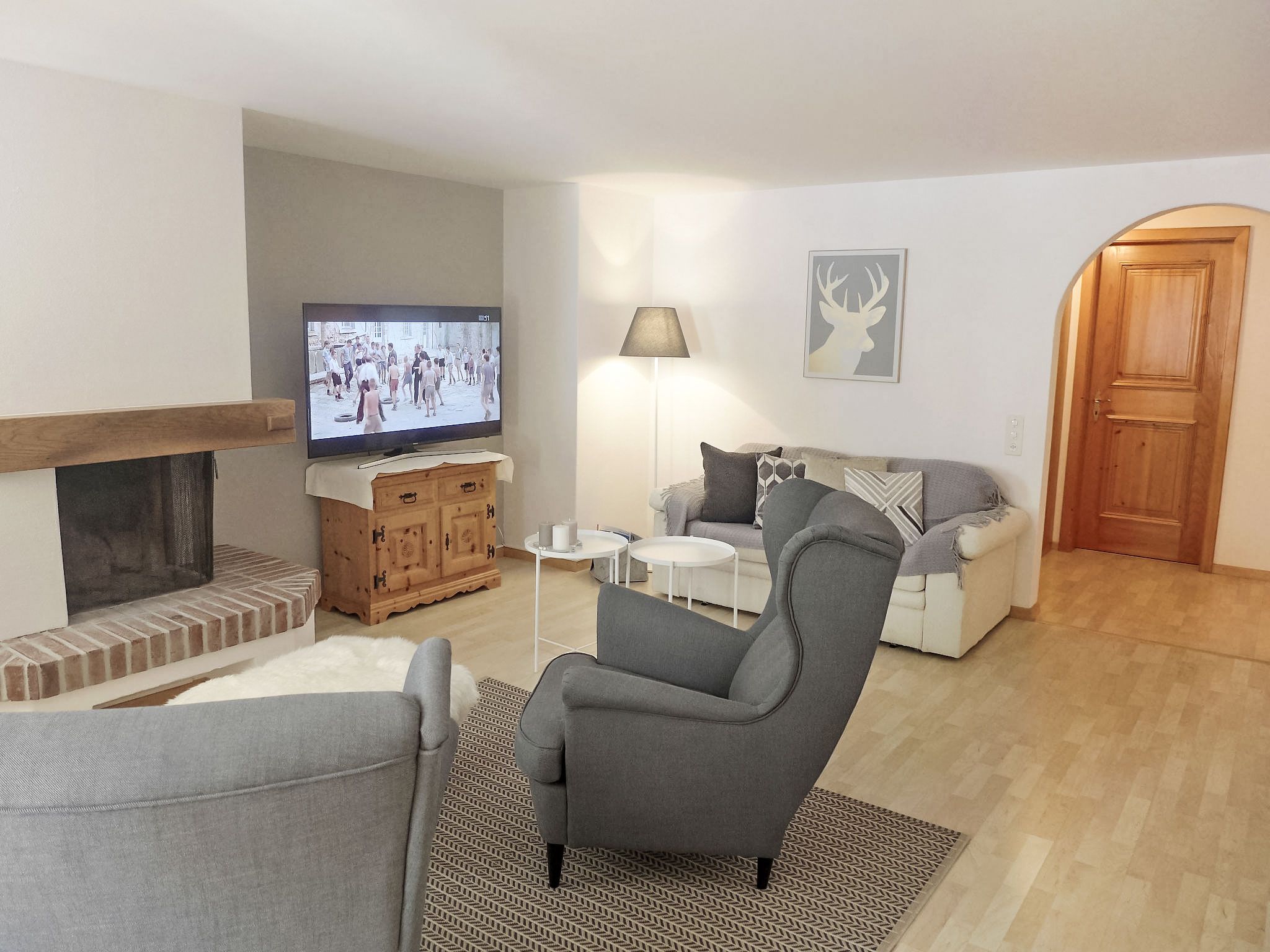 Chesa Fuolla Verda A8, 4-Zimmer-Wohnung 100 m2 im 1. Stock. Geräumig und hell, komfortabel und gemütlich eingerichtet: Wohn-/Esszimmer mit offenem Kamin und TV (Flachbildschirm). Ausgang zum Balkon, Richtung Süden. 1 grosses Doppelzimmer, Fenster zum Hof mit 1 franz. Bett (2 x 80 cm, Länge 200 cm). 1 Zimmer, Fenster zum Hof mit 2 Betten (90 cm, Länge 200 cm). 1 Kinderzimmer, Fenster zum Hof mit 1 x 2 Etagenbetten (90 cm, Länge 190 cm). Offene Küche (Backofen, Geschirrspüler, 4 Glaskeramikplatten, Toaster, Wasserkocher, elektrische Kaffeemaschine, Kapseln für die Kaffeemaschine (Nespresso) extra, Fondue Set (Käse)). Bad/WC, Dusche/WC. Balkonmöbel. Schöne Sicht auf die Berge und die Landschaft. Zur Verfügung: Bügeleisen, Haartrockner. Internet (Wireless LAN, gratis). Garage Nr. 13/A8, Höhe 220 cm, Breite 210 cm. Bitte beachten: geeignet für Familien. Nichtraucher-Unterkunft, Nichtraucher-Haus. Maximal 1 Haustier/Hund erlaubt.