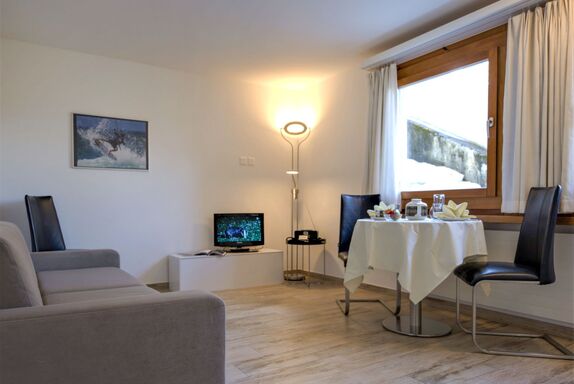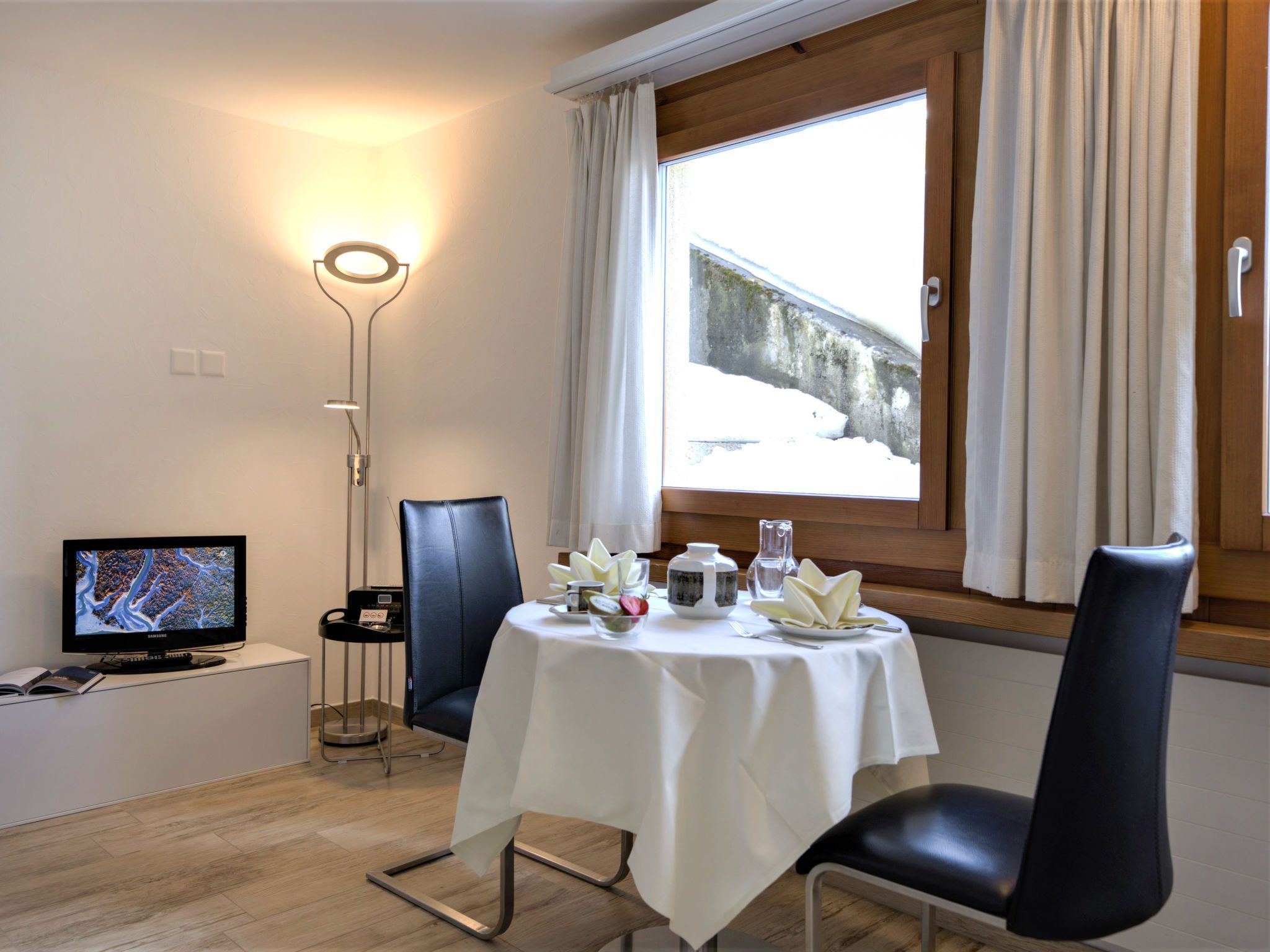 Chesa Munteratsch 311, 1-Zimmer-Wohnung 27 m2, Nordlage. Renoviert im Jahre 2015, schön und modern eingerichtet: Wohn-/Esszimmer mit 1 Doppelwandschrankbett (1 x 160 cm, Länge 200 cm), TV und Radio. Offene Küche (2 Kochplatten, Backofen, Geschirrspüler, Toaster, Wasserkocher, elektrische Kaffeemaschine, Kapseln für die Kaffeemaschine (Nespresso) extra) mit Esstisch. Dusche/WC. Heizung. Eingeschränkte Sicht auf die Landschaft. Zur Verfügung: Haartrockner. Internet (Wireless LAN, gratis). Bitte beachten: Nichtraucher-Unterkunft.