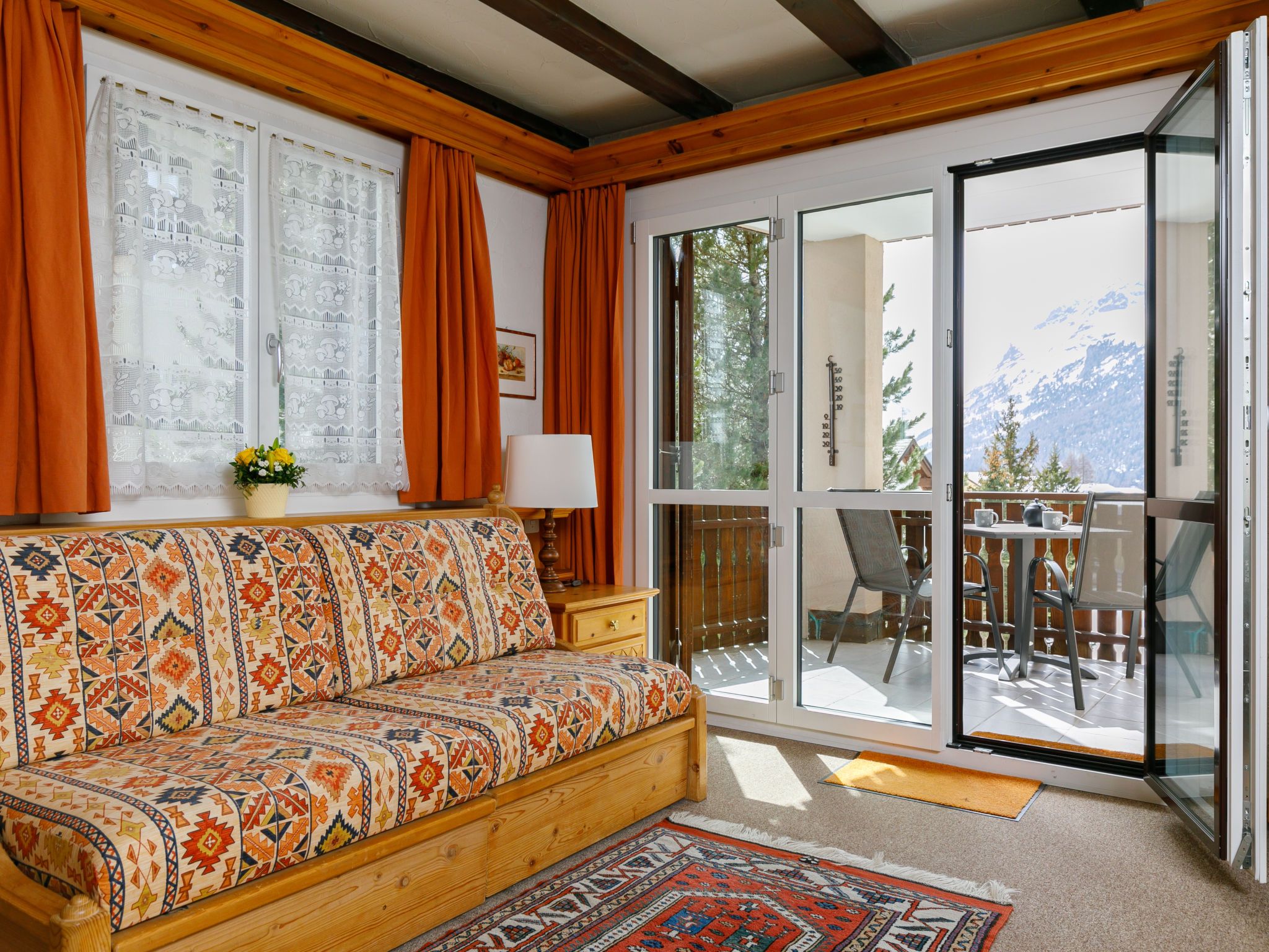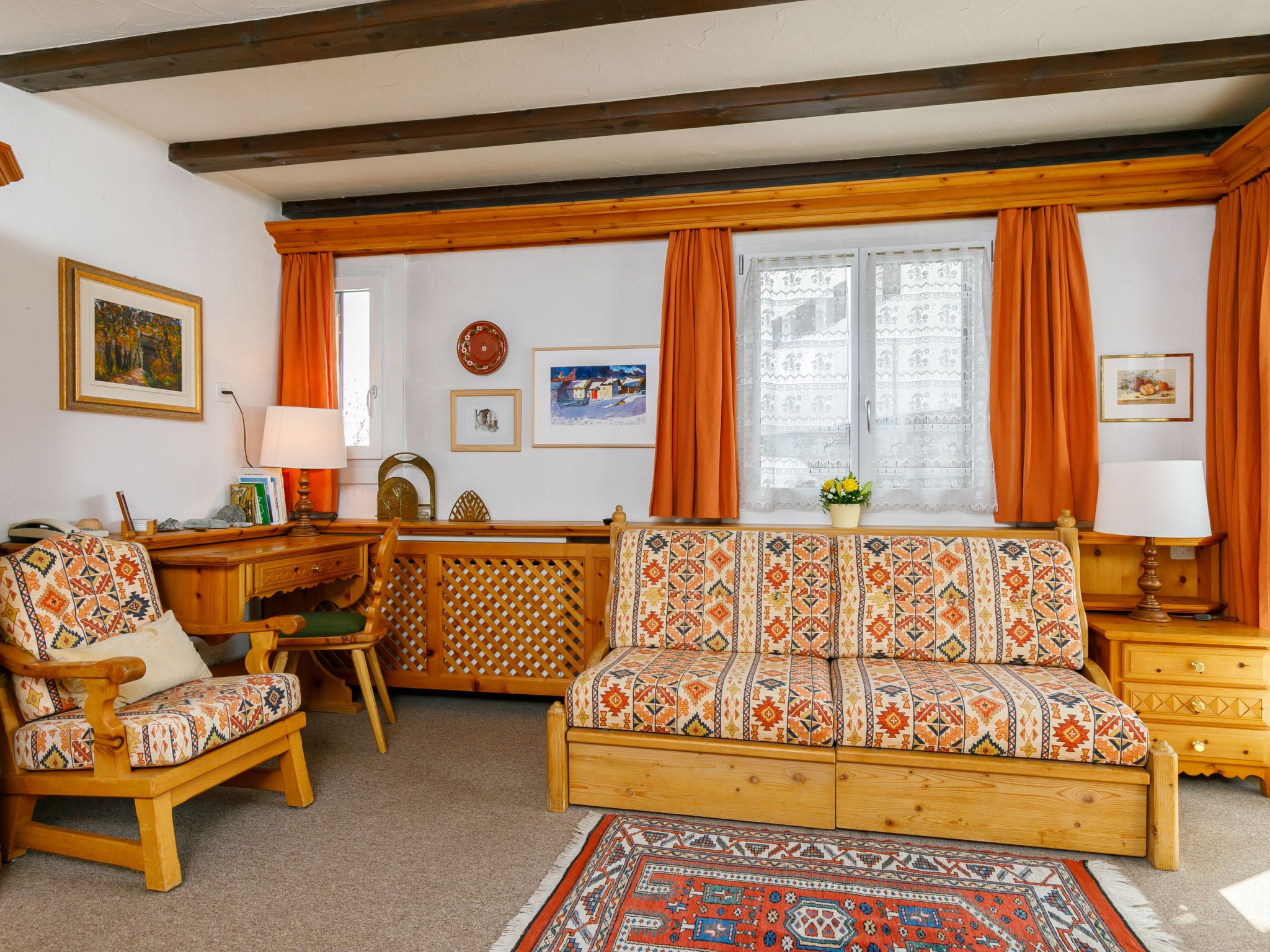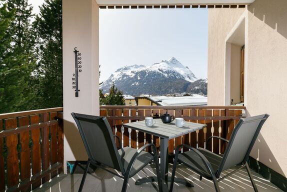 Residenza Chesa Margun 78-1, 1-Zimmer-Wohnung 31 m2 im 1. Stock, Südlage. Hell, komfortabel eingerichtet: Wohn-/Esszimmer mit 1 Doppeldiwanbett (2 x 70 cm, Länge 180 cm), Digital-TV und Flachbildschirm. Ausgang zum Balkon. Küche (4 Kochplatten, Backofen, Geschirrspüler, Mikrowelle, Racletteofen). Bad/WC, Bidet. E-Heizung. Teppichboden. Balkon, Südlage. Terrassenmöbel. Schöne Sicht auf die Berge und die Landschaft. Zur Verfügung: Internet (Wireless LAN). Bitte beachten: Nichtraucher-Unterkunft.