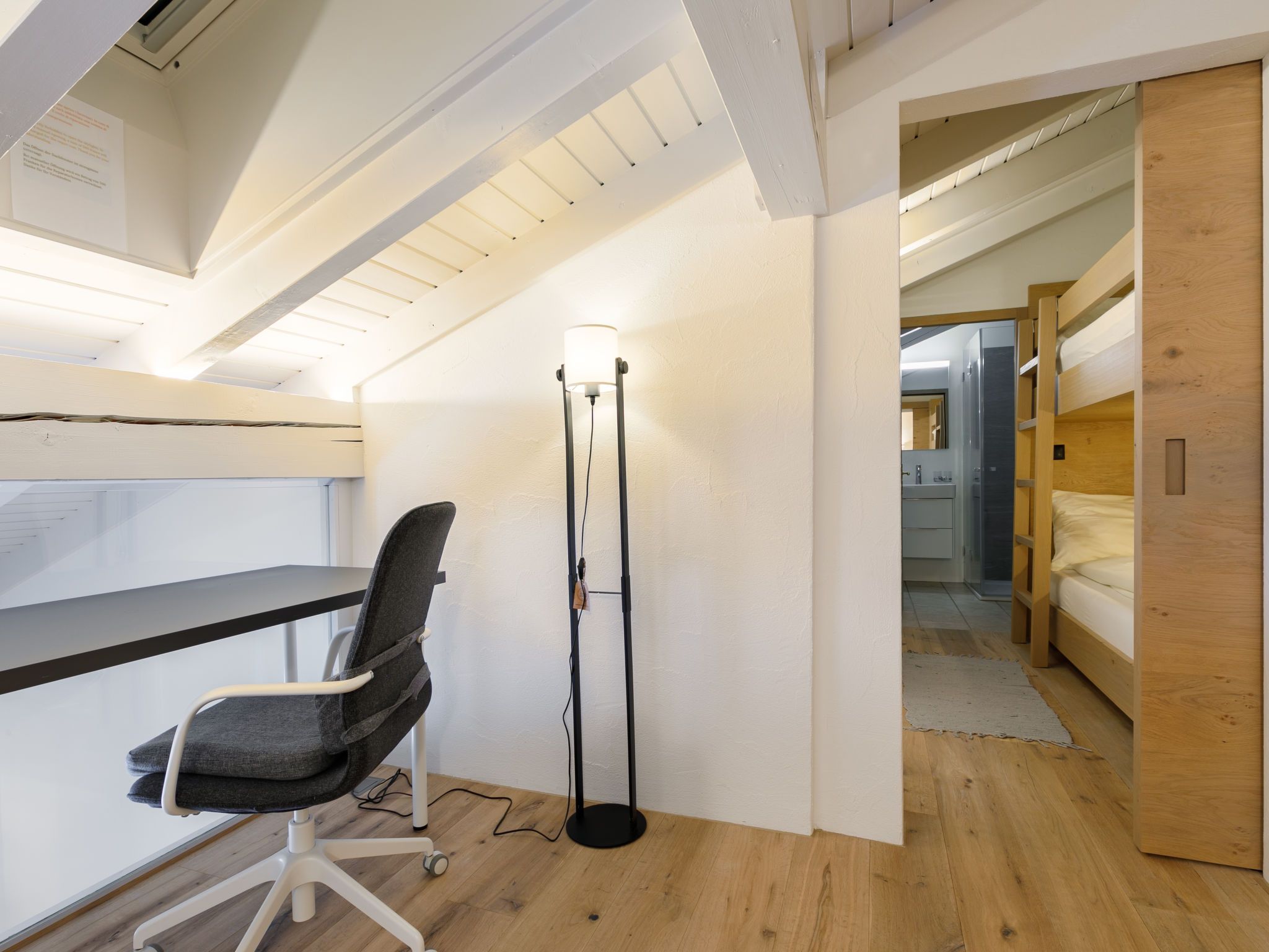 Residenza Chesa Margun 36-3, 2-Zimmer-Wohnung 52 m2 auf 2 Stockwerken, im Dachgeschoss, Nordlage. Vollständig renoviert im Jahre 2022, schön und gemütlich eingerichtet: Wohn-/Esszimmer mit Kabel-TV, Flachbildschirm und Radio. 1 Zimmer mit 1 Doppelbett. (Backofen, Geschirrspüler, 4 Glaskeramikplatten, elektrische Kaffeemaschine, Kapseln für die Kaffeemaschine (Nespresso) extra) mit Esstisch. Dusche/WC. E-Heizung. Obergeschoss: offene Galerie. Schlafnische mit Schiebetür mit 1 x 2 Etagenbetten. Schlafnische mit Schiebetür mit 1 Bett. Zur Verfügung: Internet (Wireless LAN). Garage. Bitte beachten: Nichtraucher-Unterkunft. Maximal 1 Haustier/Hund erlaubt. Galerie mit Home Office Ecke. Anstelle eines abgeschlossenen Schlafzimmers befinden sich manche Schlafplätze in einem offenen Bereich (Galerie, Nische etc.).