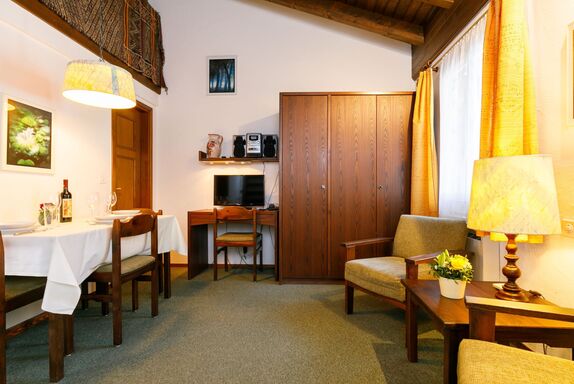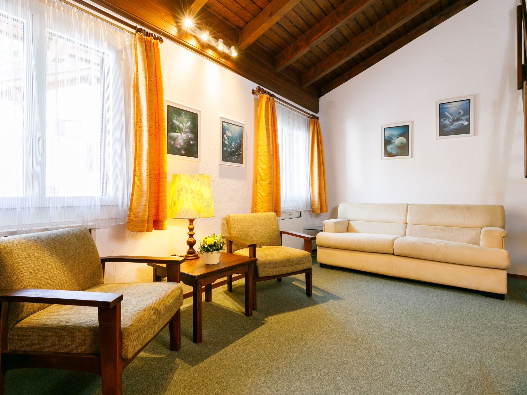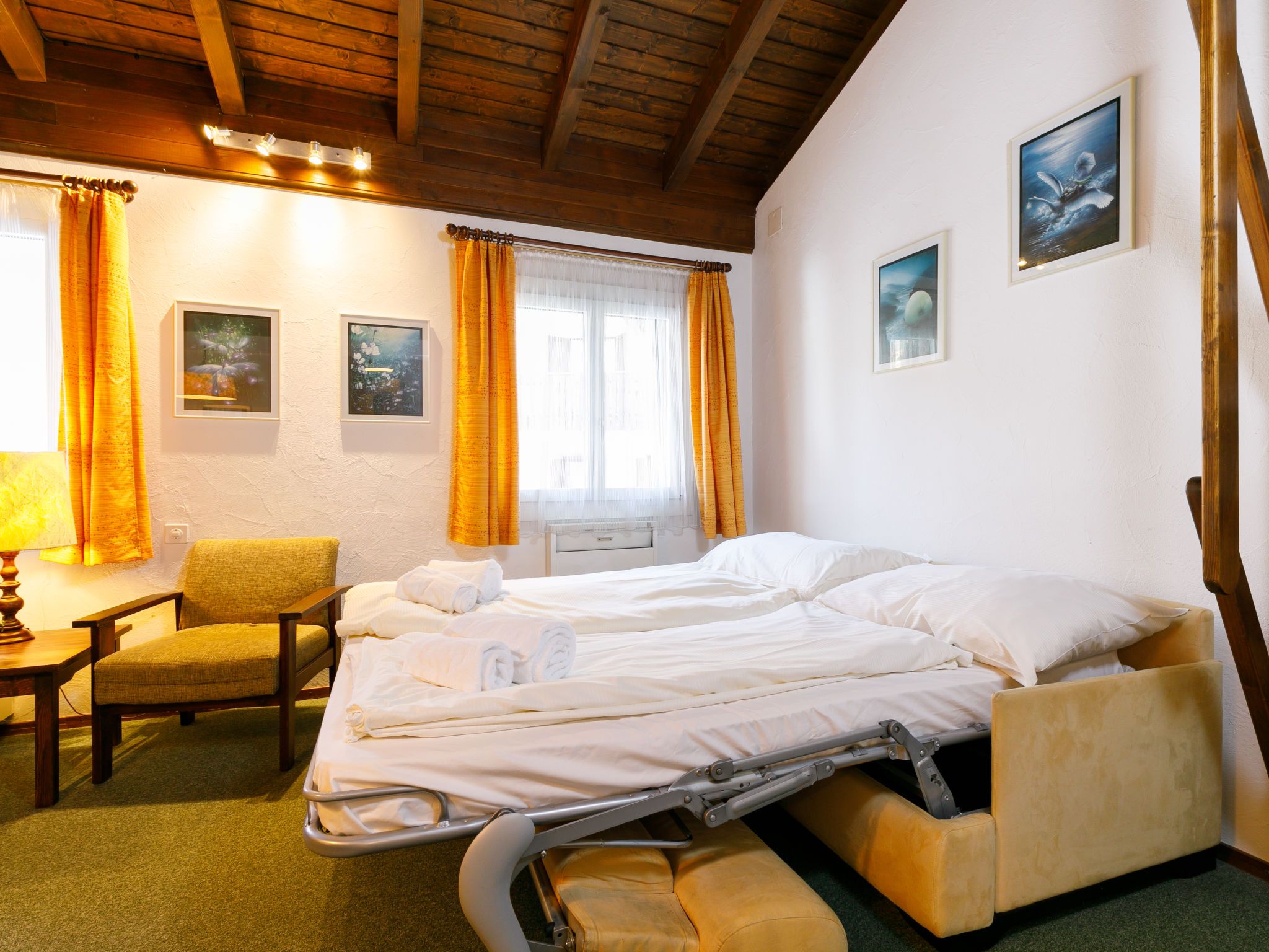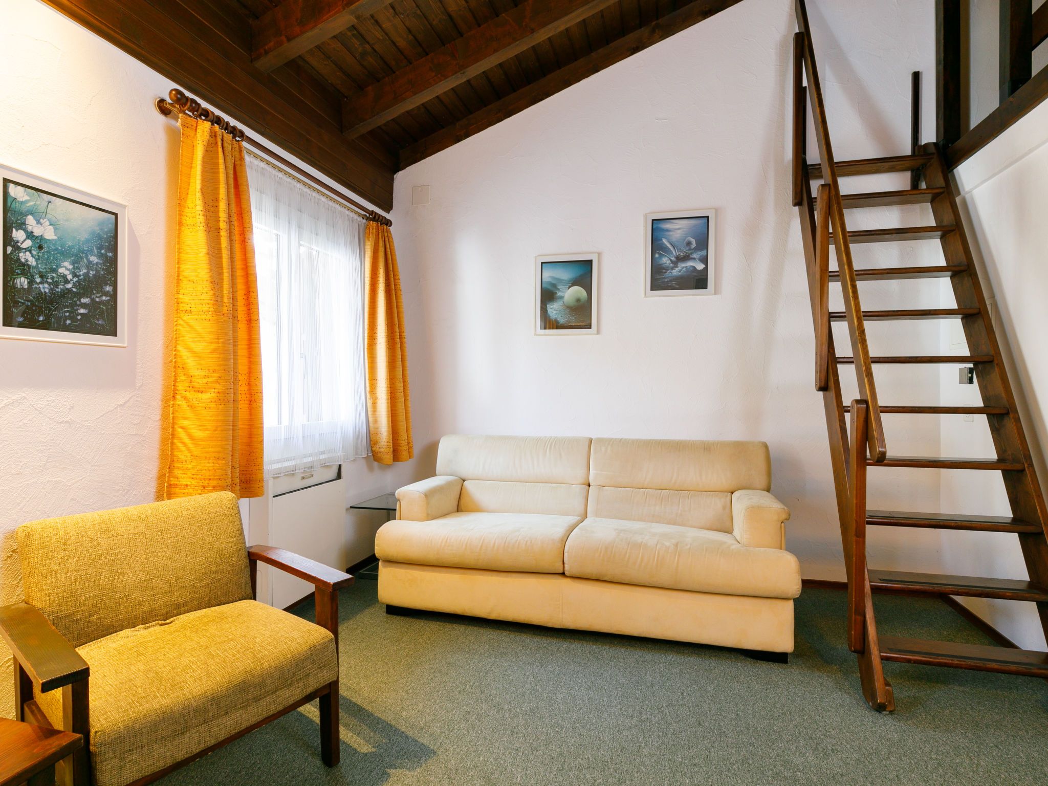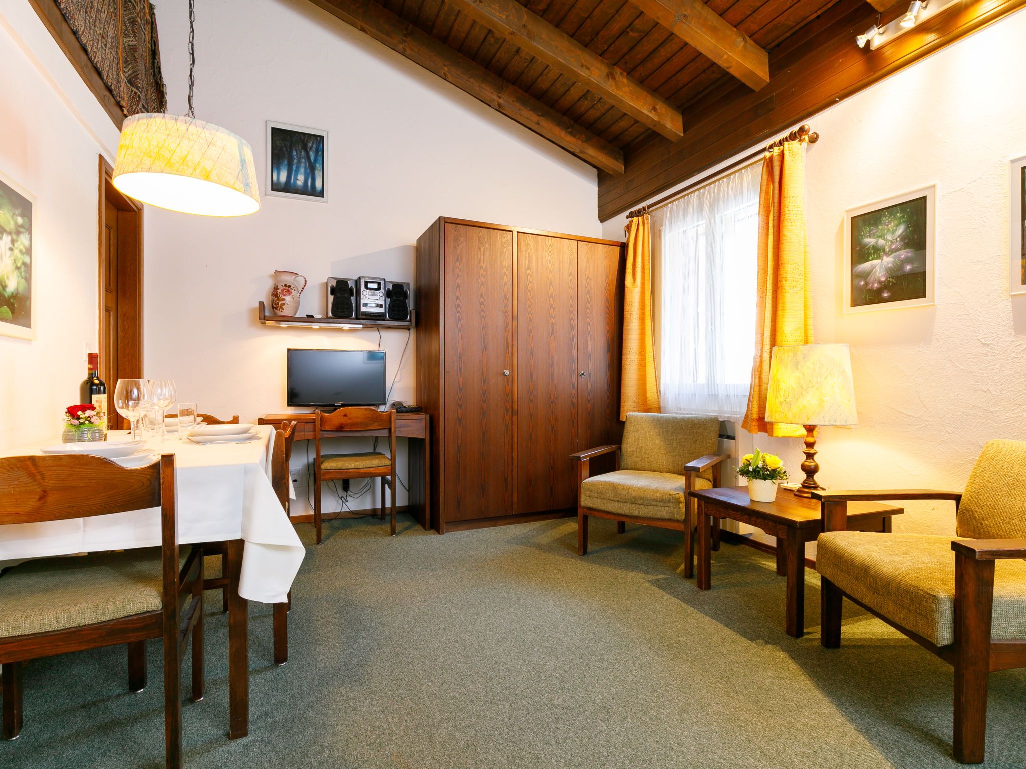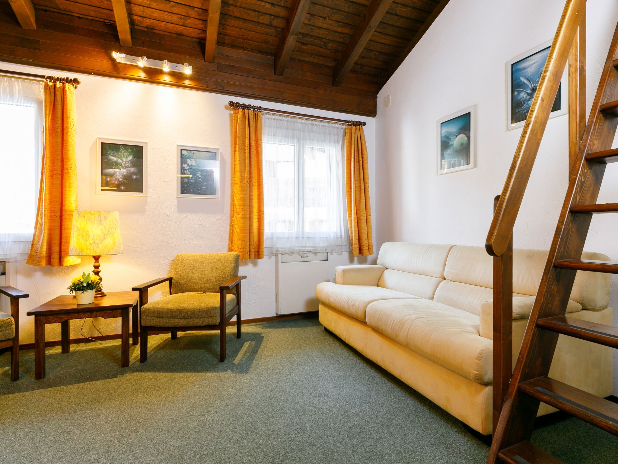 Residenza Chesa Margun 15-3, 1-Zimmer-Wohnung 29 m2 auf 2 Stockwerken, Nordlage. Komfortabel eingerichtet: Wohn-/Esszimmer mit 1 Doppeldiwanbett (170 cm, Länge 180 cm), Kabel-TV. Im Eingang (Backofen, Geschirrspüler, elektrische Kaffeemaschine). Dusche/WC. Obergeschoss: (steile Treppe) abgeschrägte, offene Galerie, Deckenhöhe 140 - 190 cm mit 1 franz. Bett (160 cm, Länge 190 cm). Garage. Bitte beachten: für Kleinkinder nicht geeignet Wohnung auf Hofseite. Maximal 1 Haustier/Hund erlaubt. Für ältere Leute nicht geeignet. Anstelle eines abgeschlossenen Schlafzimmers befinden sich manche Schlafplätze in einem offenen Bereich (Galerie, Nische etc.).