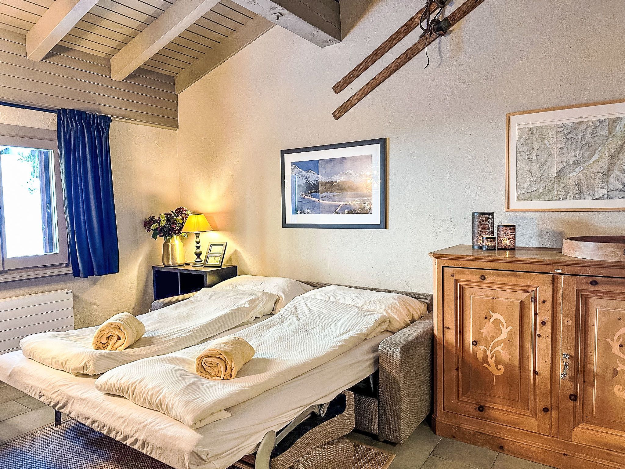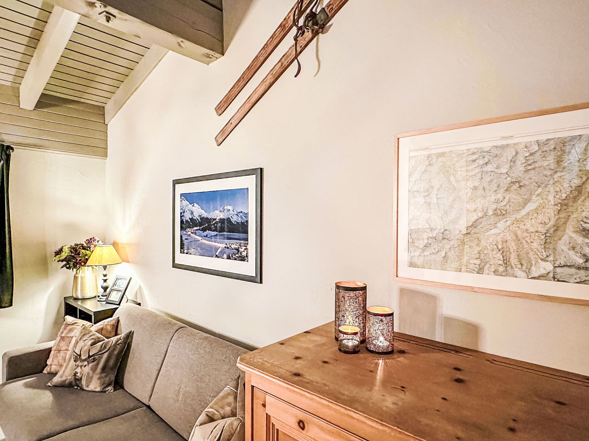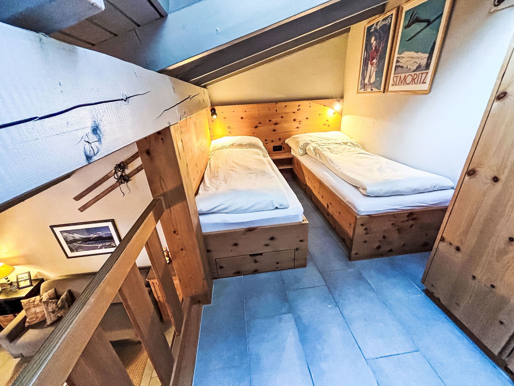 Residenza Chesa Margun 24-1, 1-Zimmer-Wohnung 34 m2 auf 2 Stockwerken, Nordlage. Renoviert im Jahre 2024, komfortabel und schön eingerichtet: Wohn-/Esszimmer mit 1 Doppeldiwanbett (170 cm, Länge 200 cm), Essecke, Kabel-TV, Flachbildschirm und Radio. Küche im Eingang (4 Kochplatten, Backofen, Geschirrspüler, 4 Glaskeramikplatten, elektrische Kaffeemaschine, Kapseln für die Kaffeemaschine (Nespresso) extra). Dusche/WC. Obergeschoss: abgeschrägte, offene Galerie mit Dachfenster mit 2 Betten (80 cm, Länge 200 cm). Zur Verfügung: Internet (WLAN, gratis). Bitte beachten: geeignet für Familien Wohnung auf Hofseite. Nichtraucher-Unterkunft. Anstelle eines abgeschlossenen Schlafzimmers befinden sich manche Schlafplätze in einem offenen Bereich (Galerie, Nische etc.).