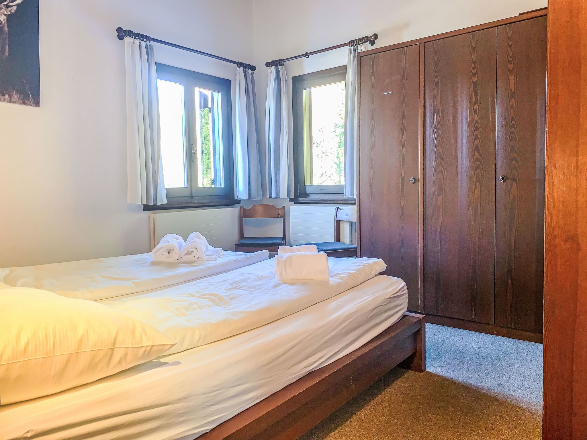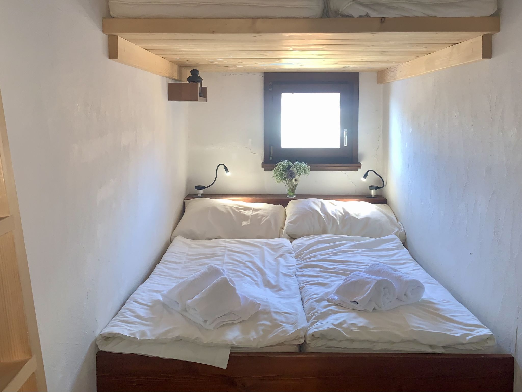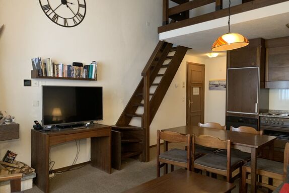 Residenza Chesa Margun 59-6, 2-Zimmer-Wohnung 49 m2 auf 2 Stockwerken, im Dachgeschoss, Nordlage. Zweckmässig eingerichtet: Wohn-/Esszimmer mit offenem Kamin, Esstisch und Sat-TV. Offene Galerie, Deckenhöhe 150 - 170 cm mit Schiebetür mit 1 franz. Bett. 1 Zimmer mit 2 Betten (80 cm, Länge 180 cm). Offene Küche (Backofen, Geschirrspüler, elektrische Kaffeemaschine, Kapseln für die Kaffeemaschine (Nespresso) extra) mit Esstisch. Bad/WC. Sicht auf den Wald. Bitte beachten: Nichtraucher-Unterkunft. Anstelle eines abgeschlossenen Schlafzimmers befinden sich manche Schlafplätze in einem offenen Bereich (Galerie, Nische etc.).