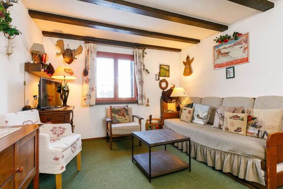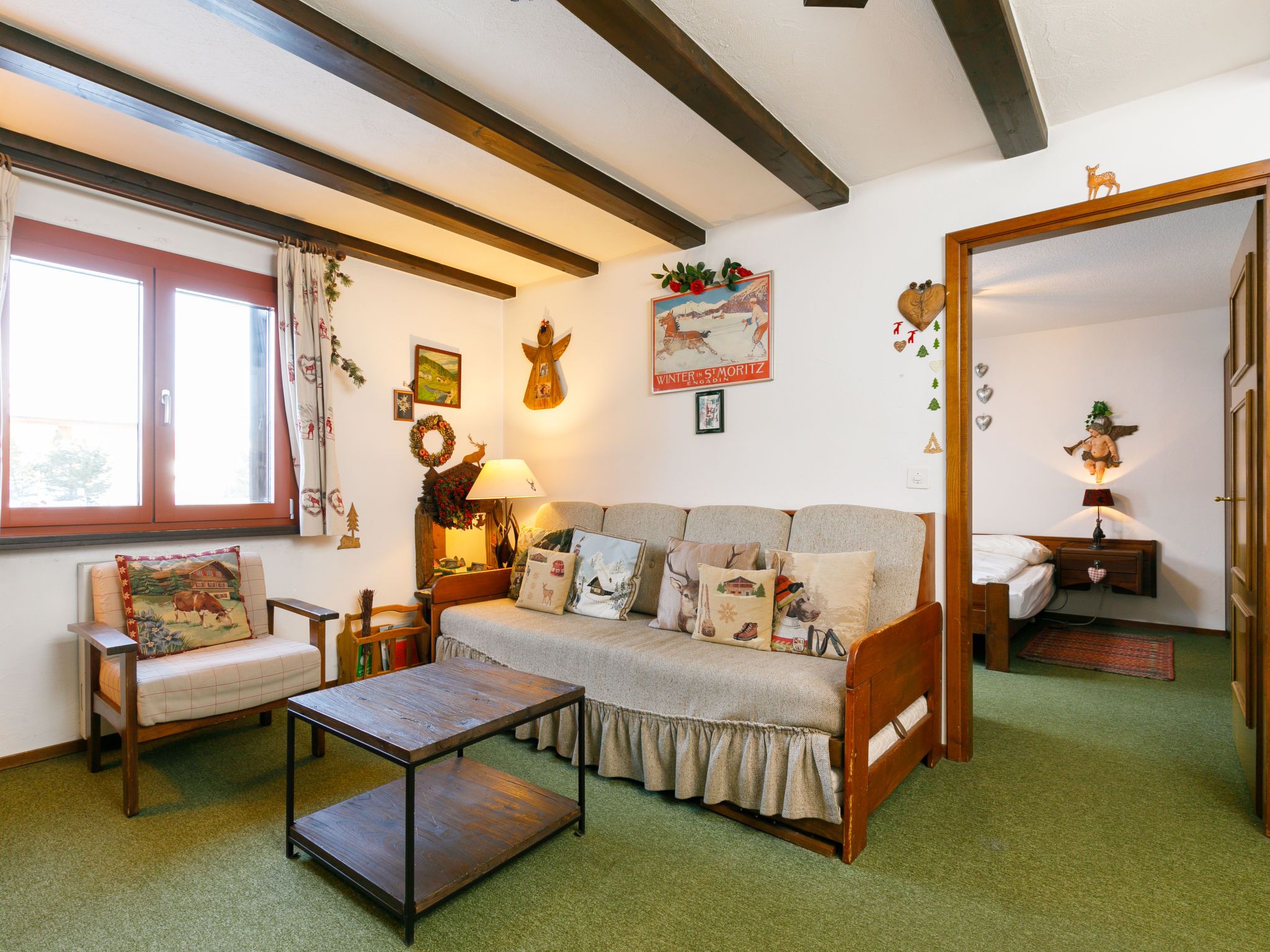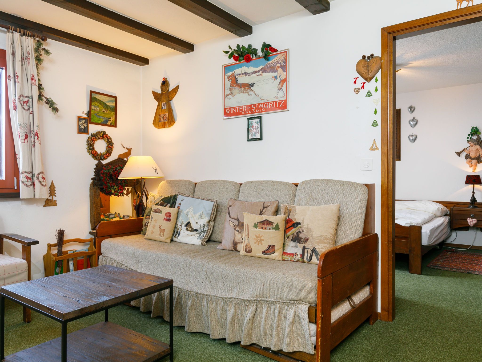 Residenza Chesa Margun 13-5, 2-Zimmer-Wohnung 53 m2, im Erdgeschoss, Südlage. Zweckmässig und gemütlich eingerichtet: Wohn-/Esszimmer mit 1 Diwanbett (140 cm, Länge 190 cm), Esstisch und Sat-TV. 1 Zimmer mit 2 Betten. Kleine Kochnische im Eingang (4 Kochplatten, Backofen, Geschirrspüler, Mikrowelle). Bad/WC. Heizung. Sicht auf die Ortschaft. Zur Verfügung: Internet (WLAN, gratis). Garage. Maximal 1 Haustier/Hund erlaubt. Bitte beachten: Raucher Wohnung.