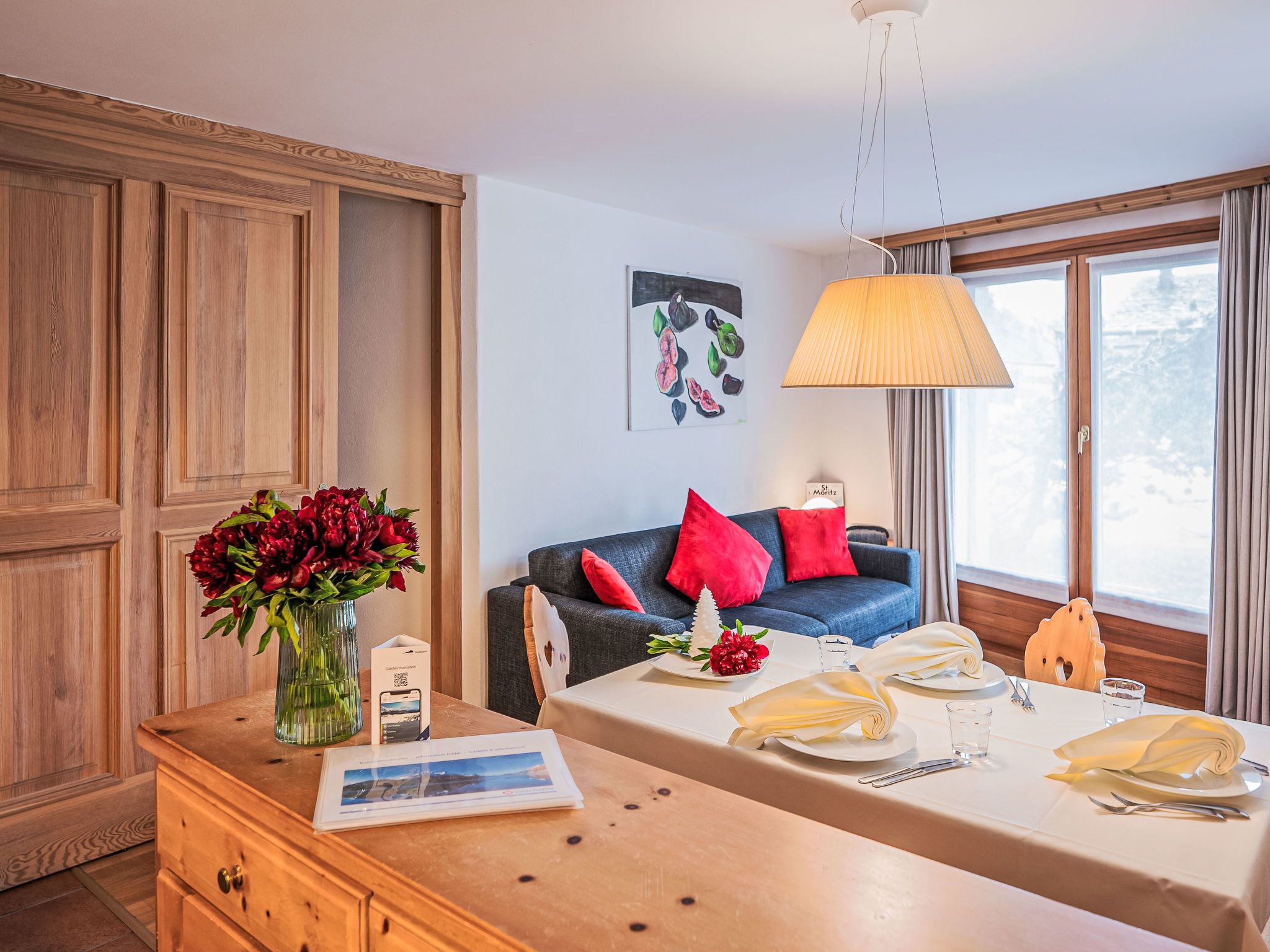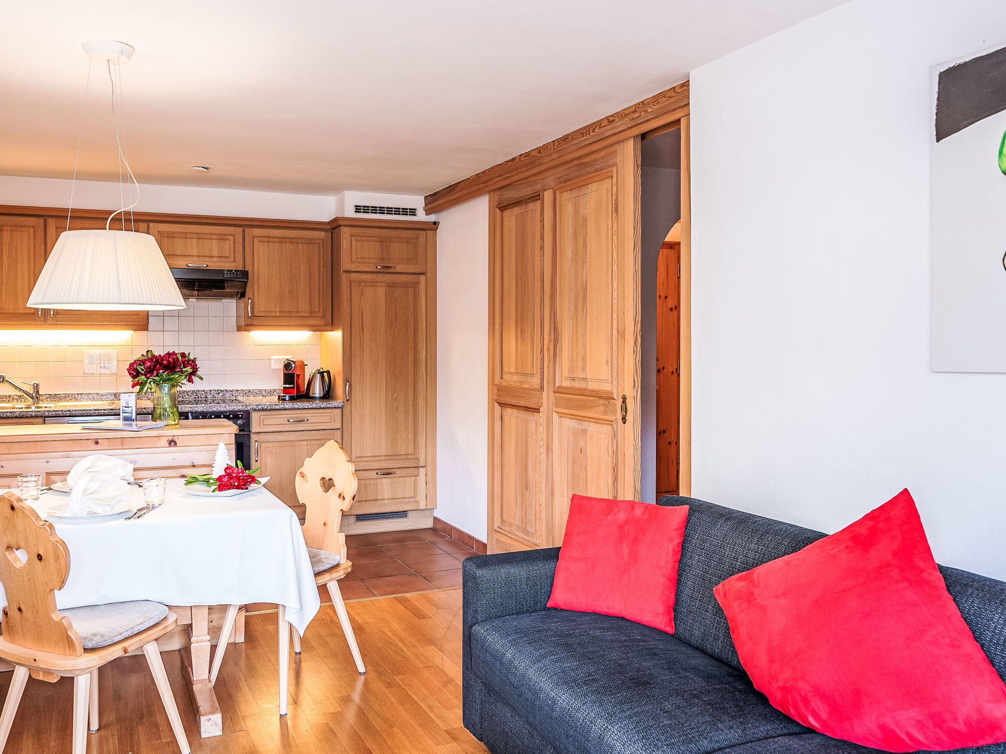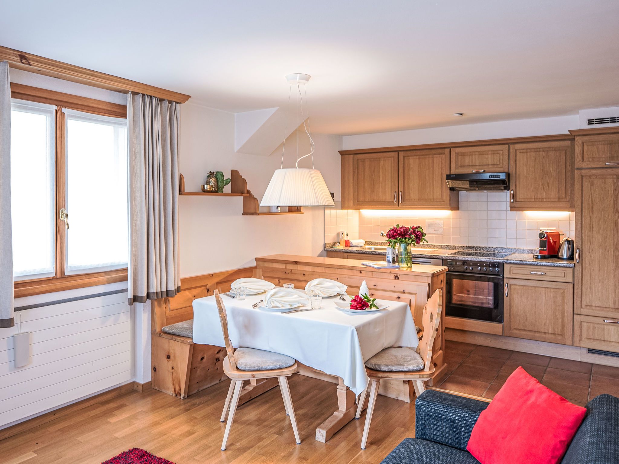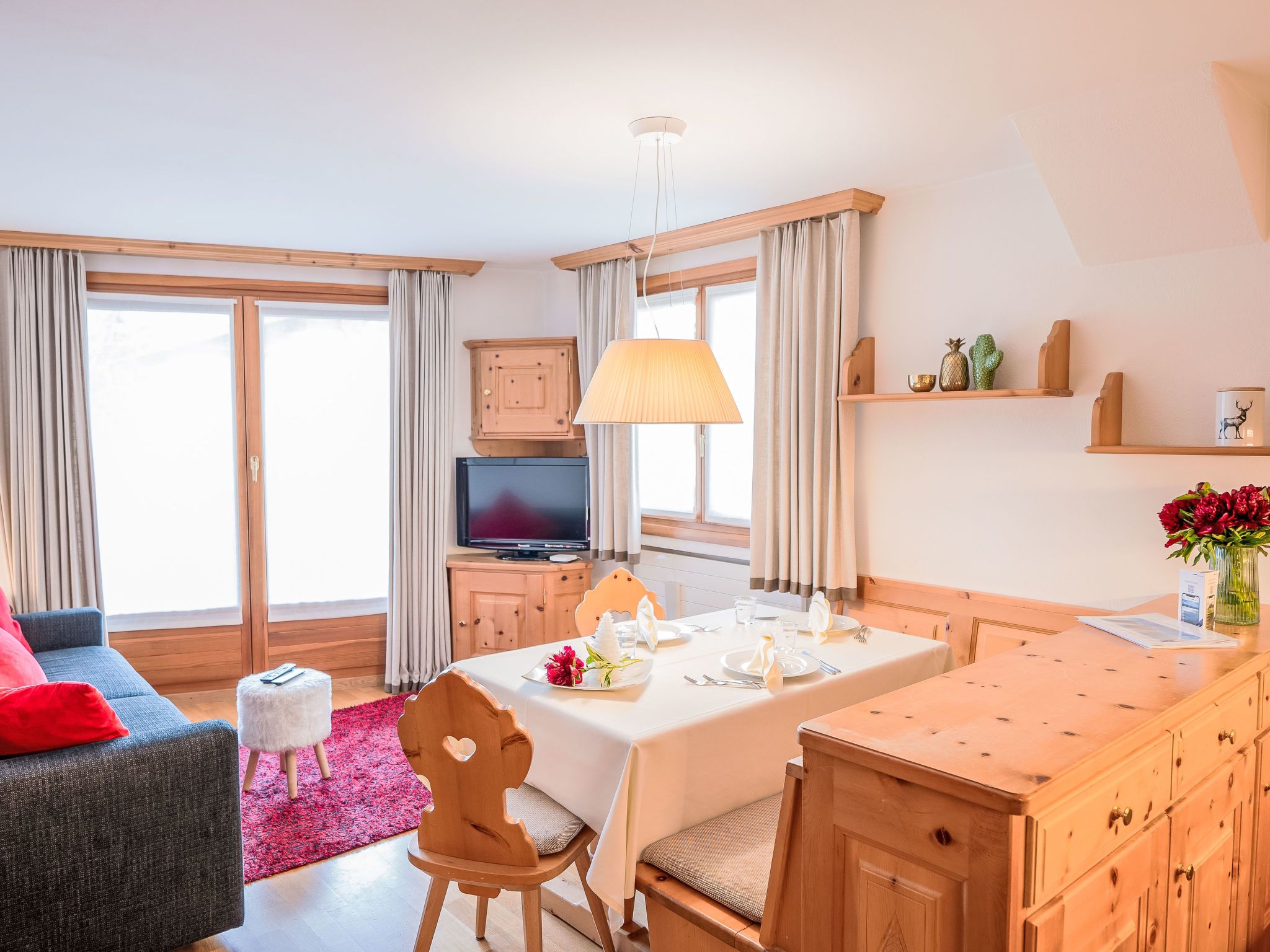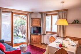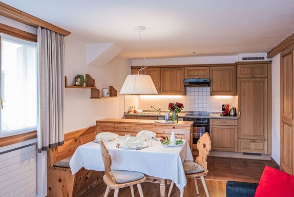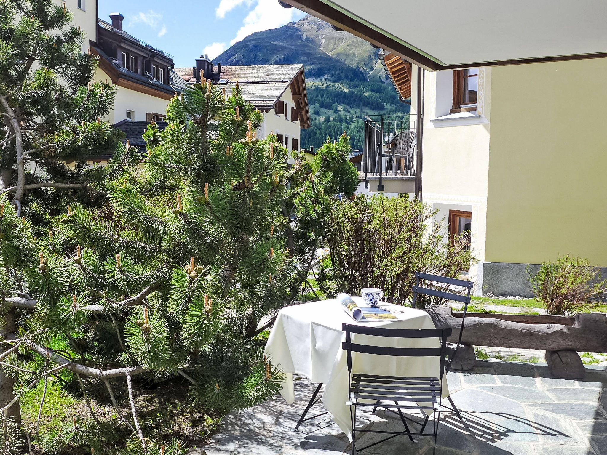 Chesa Vadret Surlej, 2-Zimmer-Wohnung 57 m2, im Erdgeschoss. Teilweise renoviert im Jahre 2016, gemütlich eingerichtet: offenes Wohn-/Esszimmer mit 1 Diwanbett (160 cm, Länge 200 cm), TV (Flachbildschirm). Ausgang zur Terrasse. 1 Zimmer mit 1 Doppelbett (1 x 170 cm, Länge 200 cm). Offene Küche (Geschirrspüler, 4 Glaskeramikplatten, Toaster, Wasserkocher, elektrische Kaffeemaschine, Kapseln für die Kaffeemaschine (Nespresso) extra, Fondue Set (Chinoise)). Dusche/Bidet/WC. Heizung. Kleine Terrasse. Terrassenmöbel. Sicht auf die Berge und die Ortschaft. Zur Verfügung: Haartrockner. Internet (Wireless LAN, gratis). Garage Nr. 26 auf dem Grundstück, Höhe 205 cm, Breite 290 cm. Bitte beachten: Nichtraucher-Unterkunft.