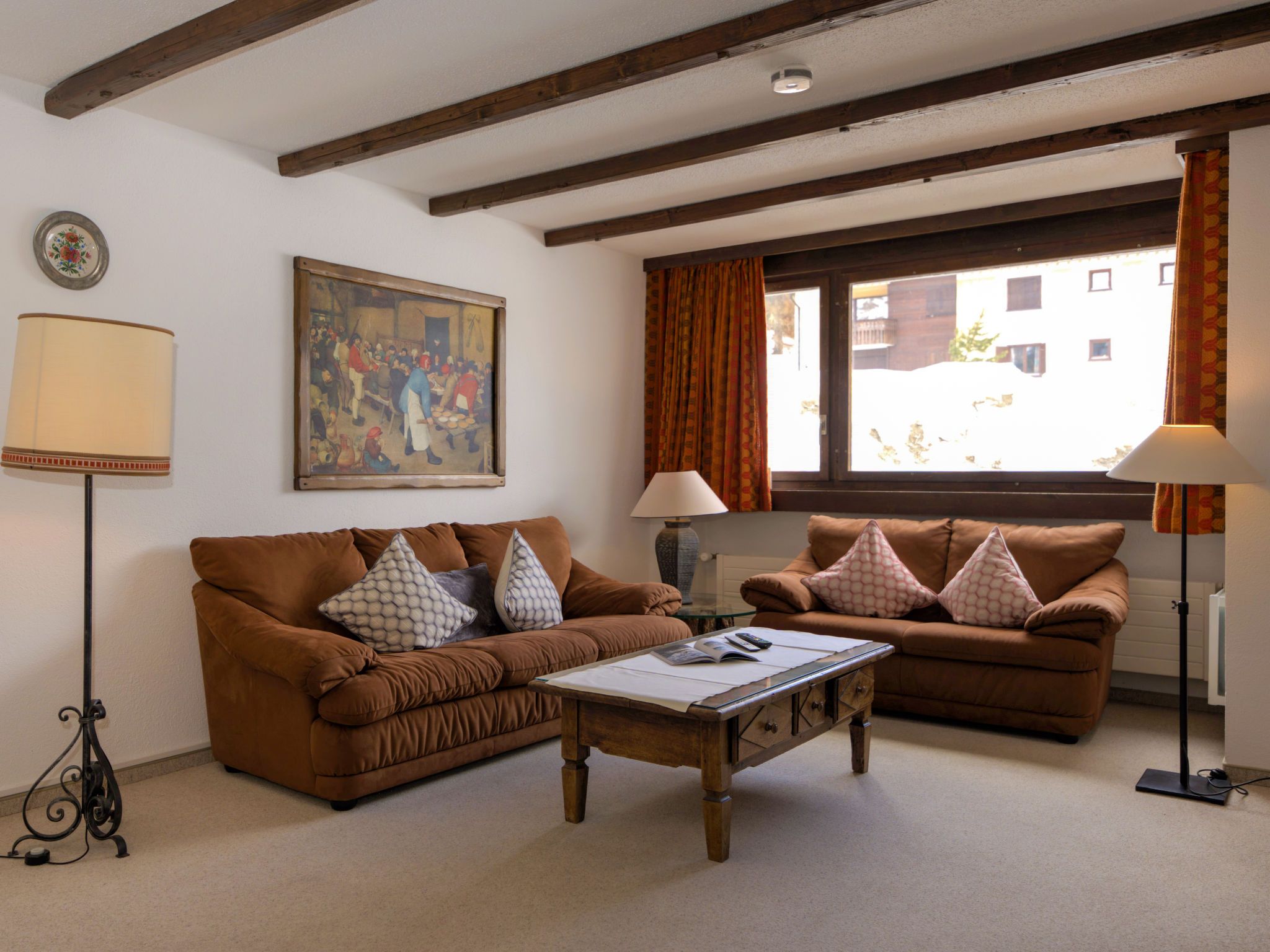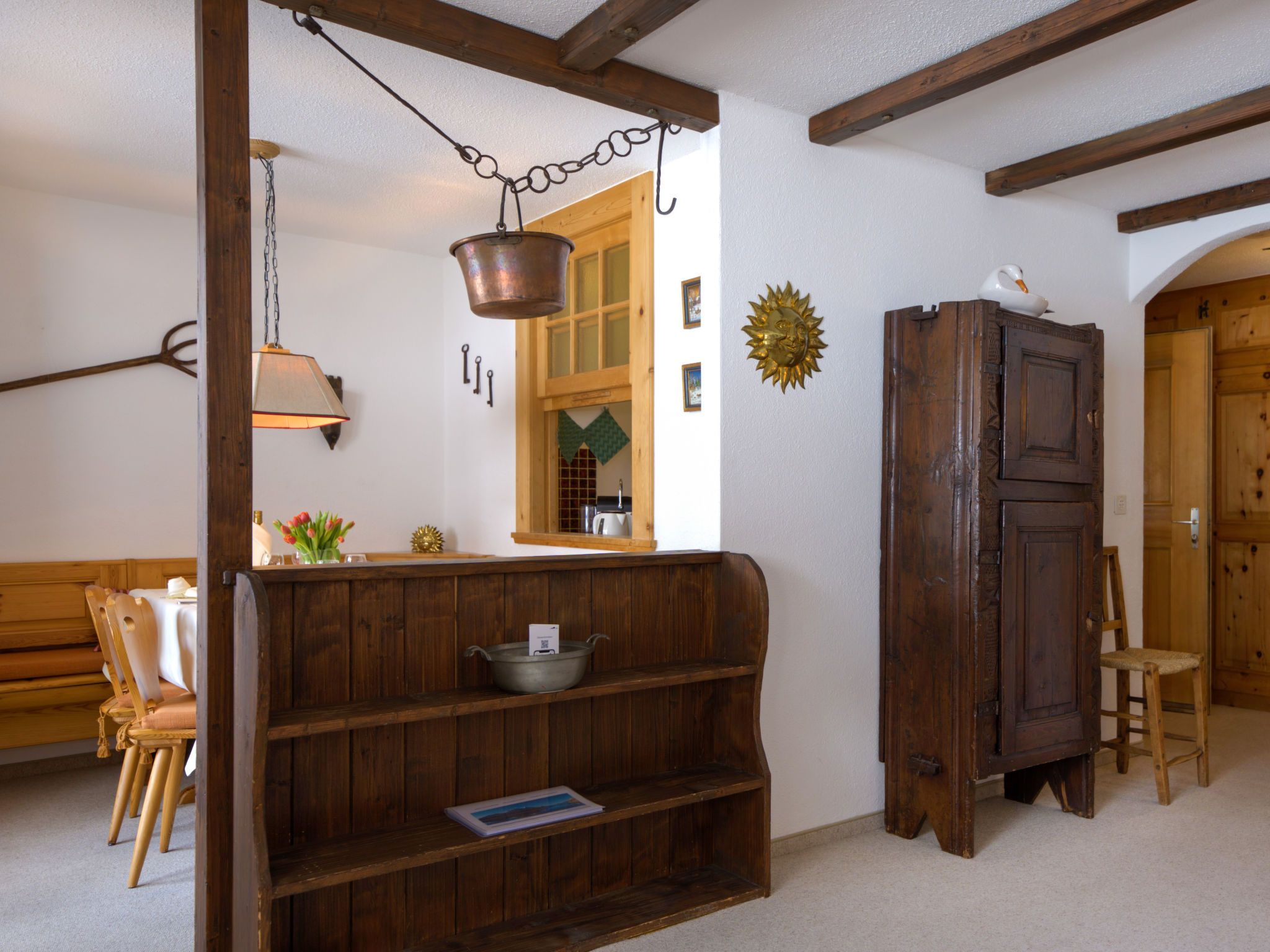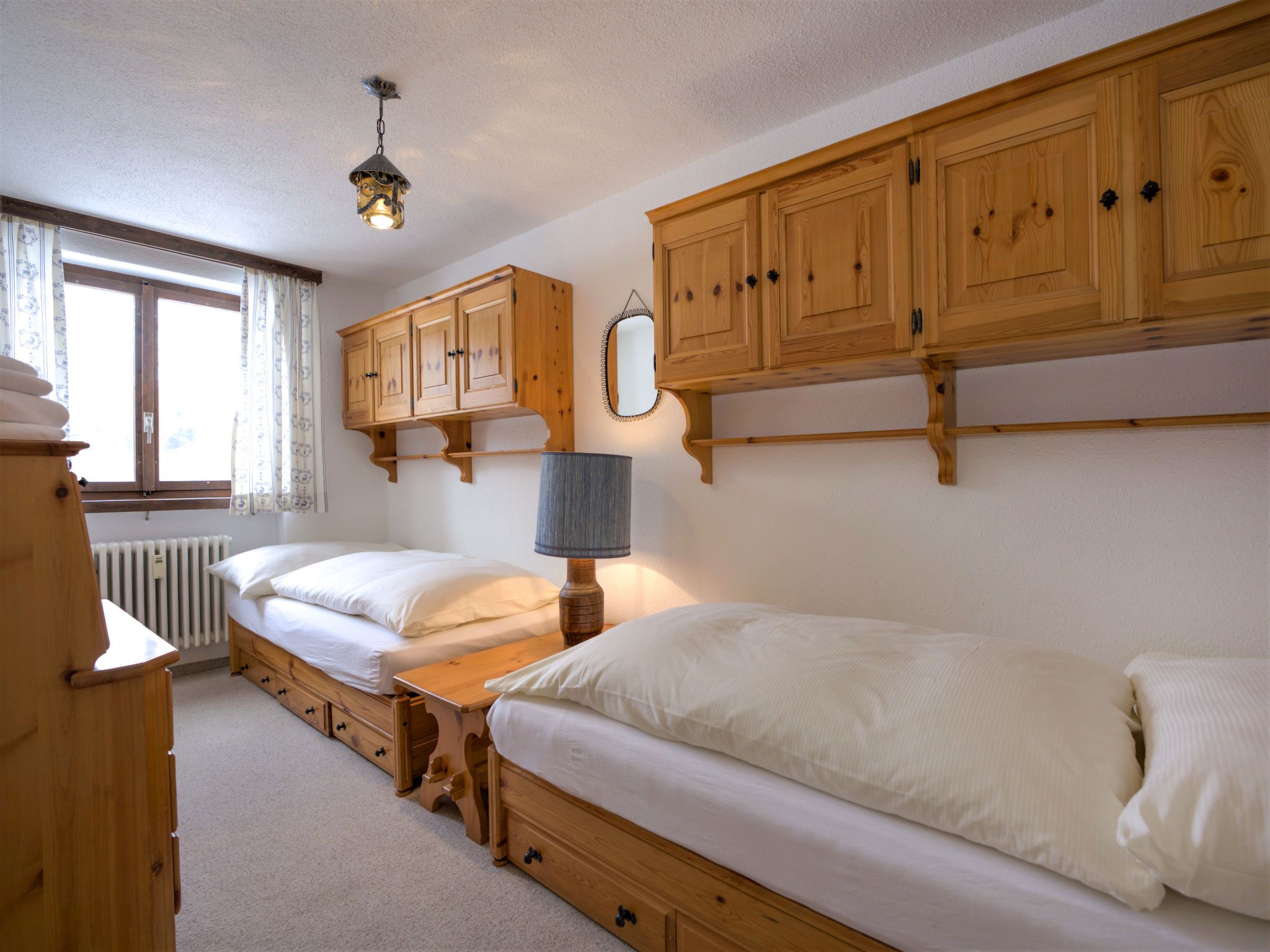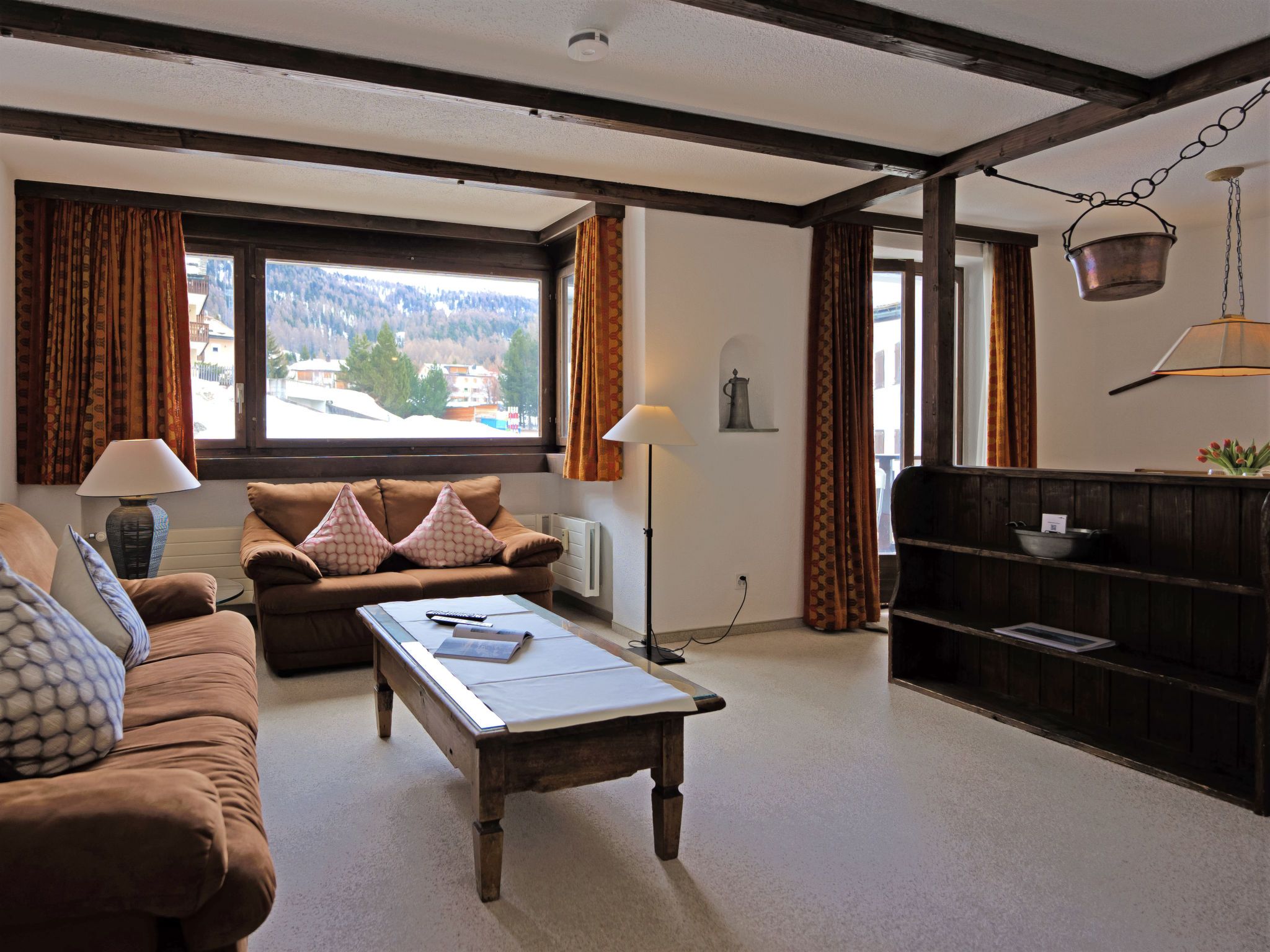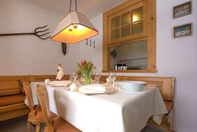 Chesa Linaria, 3-Zimmer-Wohnung 70 m2, im erhöhten Erdgeschoss. Einfach eingerichtet: Wohnzimmer mit Essecke und TV (Flachbildschirm). Ausgang zum Balkon, Richtung Süden. 1 Zimmer mit 1 Doppelbett (2 x 90 cm, Länge 185 cm). 1 kleines Zimmer mit 2 Betten (90 cm, Länge 190 cm). Küche (Backofen, Geschirrspüler, Toaster, Wasserkocher, elektrische Kaffeemaschine, Kapseln für die Kaffeemaschine (Nespresso) extra, Racletteofen, Fondue Set (Chinoise)) mit Durchreiche. Bad/WC, Dusche/Bidet/WC. Heizung. Kleiner Balkon. Terrassenmöbel. Schöne Sicht auf die Berge. Zur Verfügung: Bügeleisen, Haartrockner. Internet (Wireless LAN, gratis). Garage Nr. 9 (small!), Höhe 205 cm, Breite 190 cm. Maximal 1 Haustier/Hund erlaubt. 756.8668.2733.01