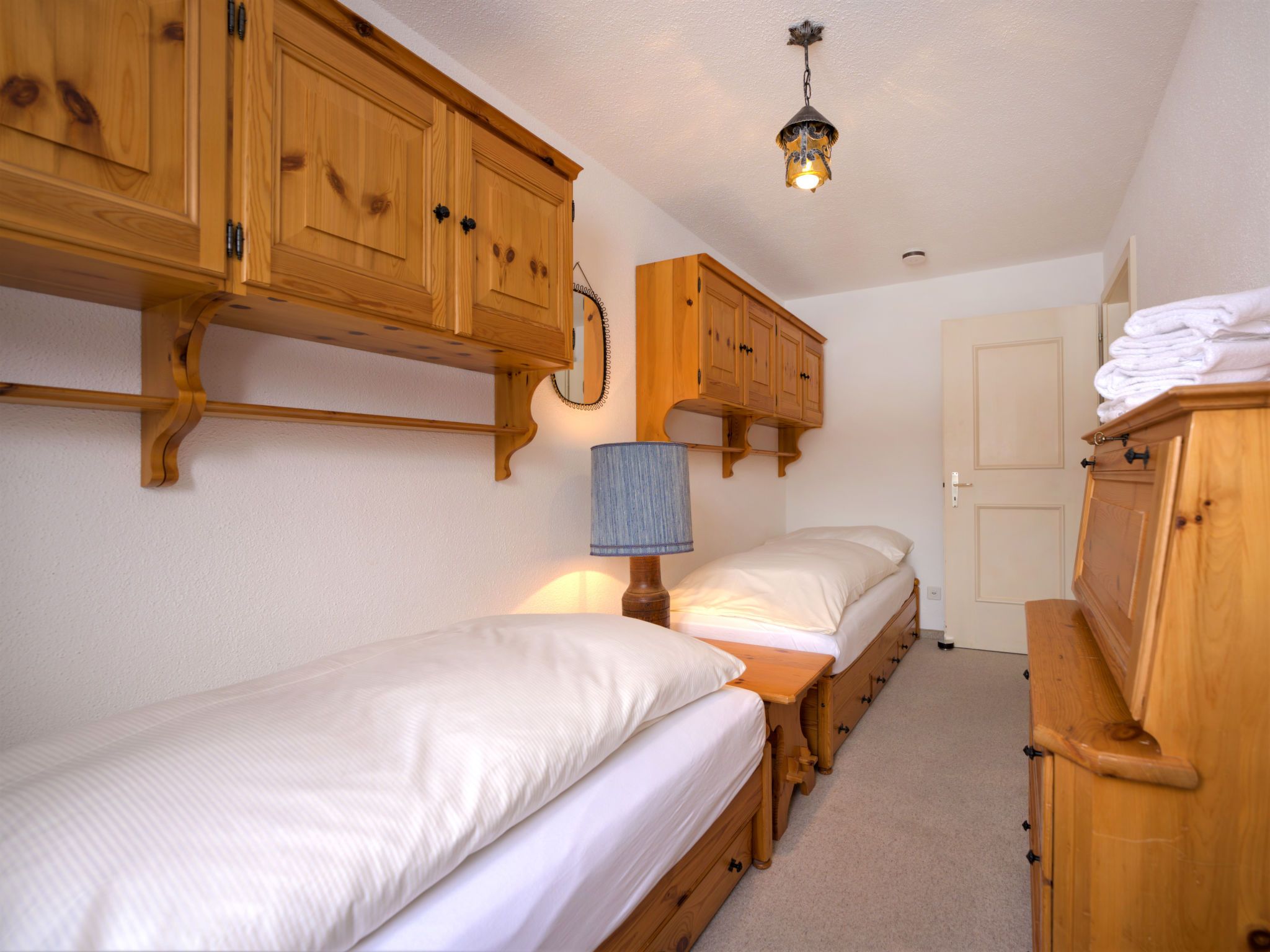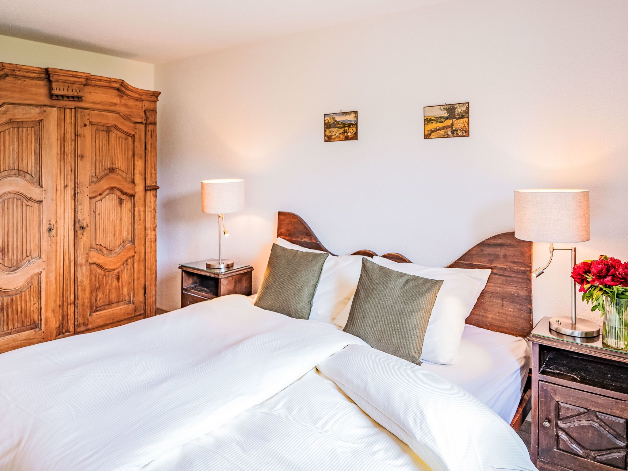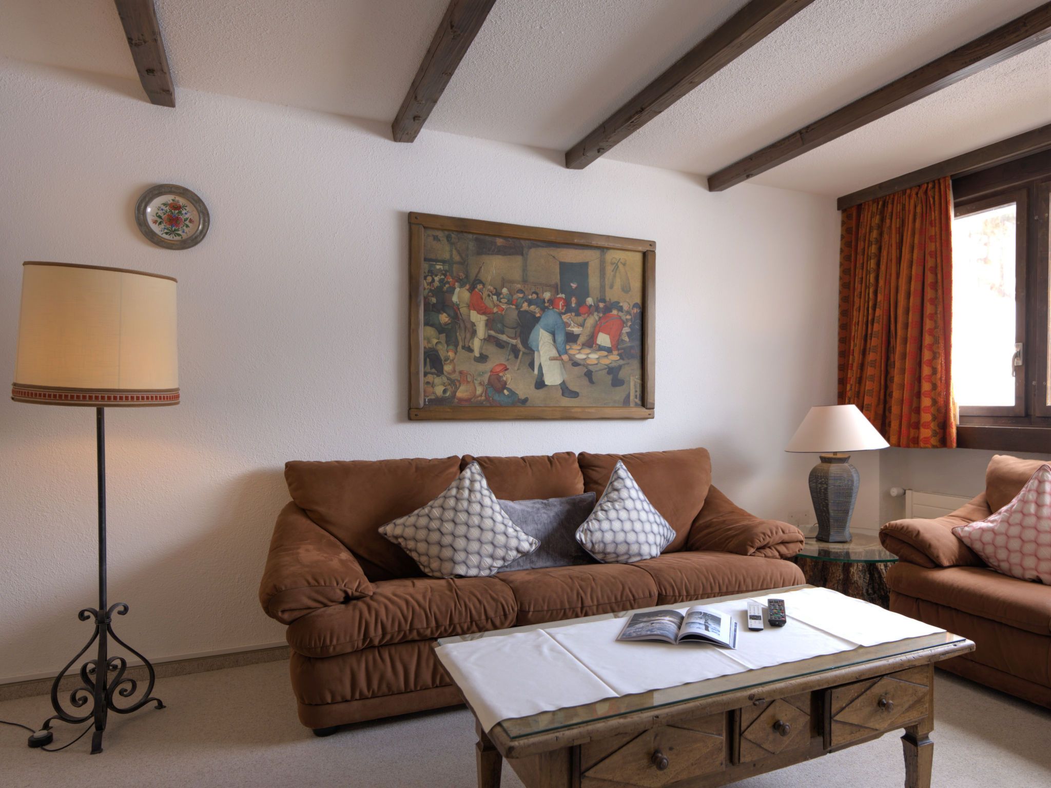 Chesa Linaria, 3-Zimmer-Wohnung 70 m2, im erhöhten Erdgeschoss. Einfach eingerichtet: Wohnzimmer mit Essecke und TV (Flachbildschirm). Ausgang zum Balkon, Richtung Süden. 1 Zimmer mit 1 Doppelbett (2 x 90 cm, Länge 185 cm). 1 kleines Zimmer mit 2 Betten (90 cm, Länge 190 cm). Küche (Backofen, Geschirrspüler, Toaster, Wasserkocher, elektrische Kaffeemaschine, Kapseln für die Kaffeemaschine (Nespresso) extra, Racletteofen, Fondue Set (Chinoise)) mit Durchreiche. Bad/WC, Dusche/Bidet/WC. Heizung. Kleiner Balkon. Terrassenmöbel. Schöne Sicht auf die Berge. Zur Verfügung: Bügeleisen, Haartrockner. Internet (Wireless LAN, gratis). Garage Nr. 9 (small!), Höhe 205 cm, Breite 190 cm. Maximal 1 Haustier/Hund erlaubt. 756.8668.2733.01
