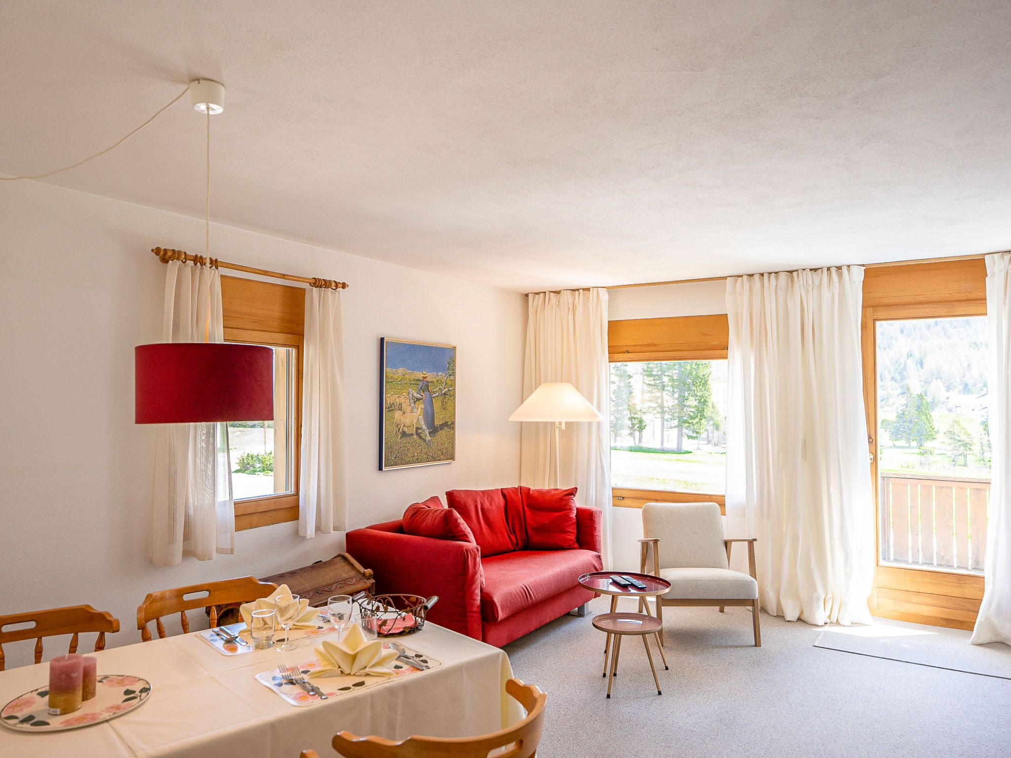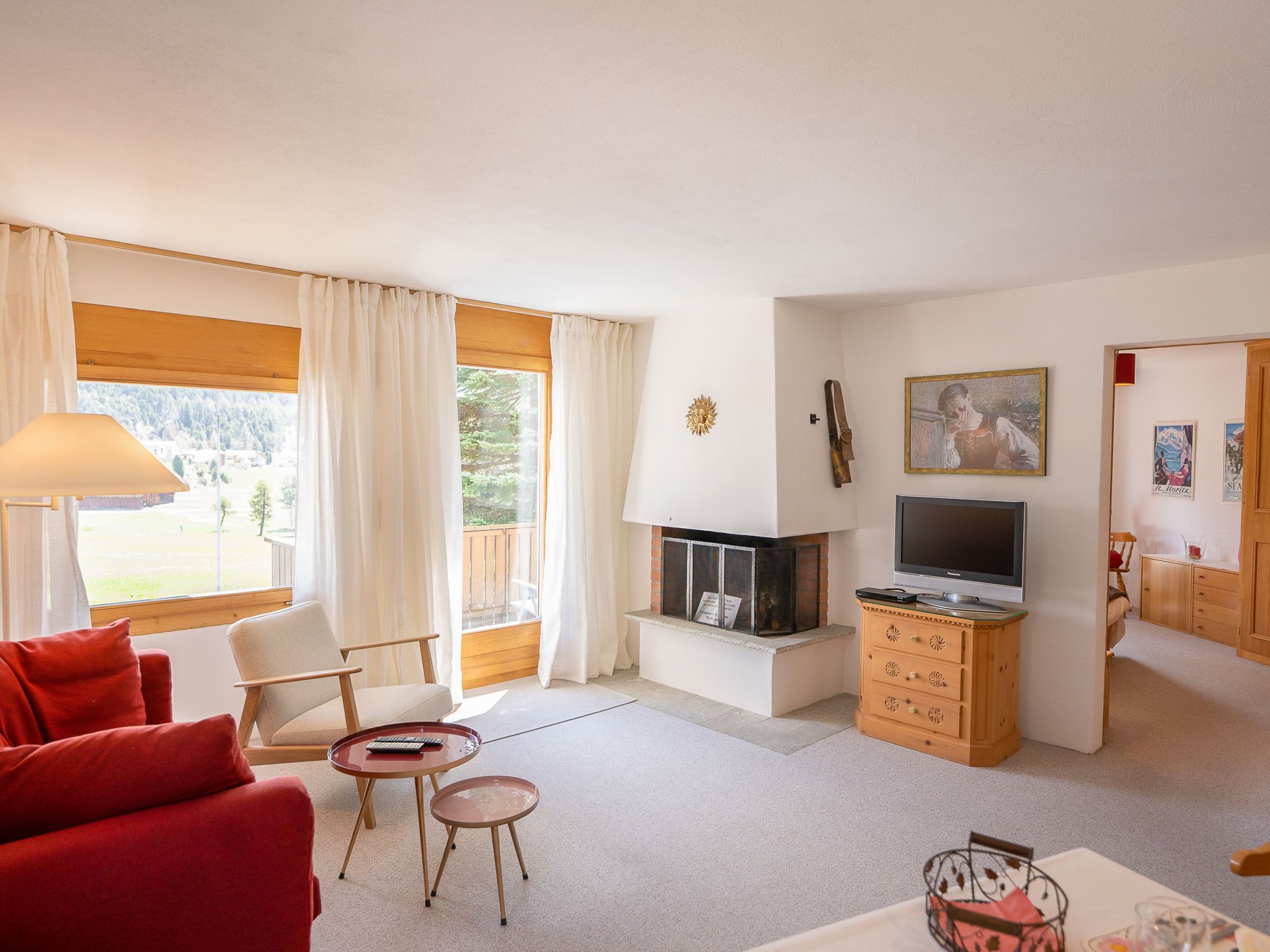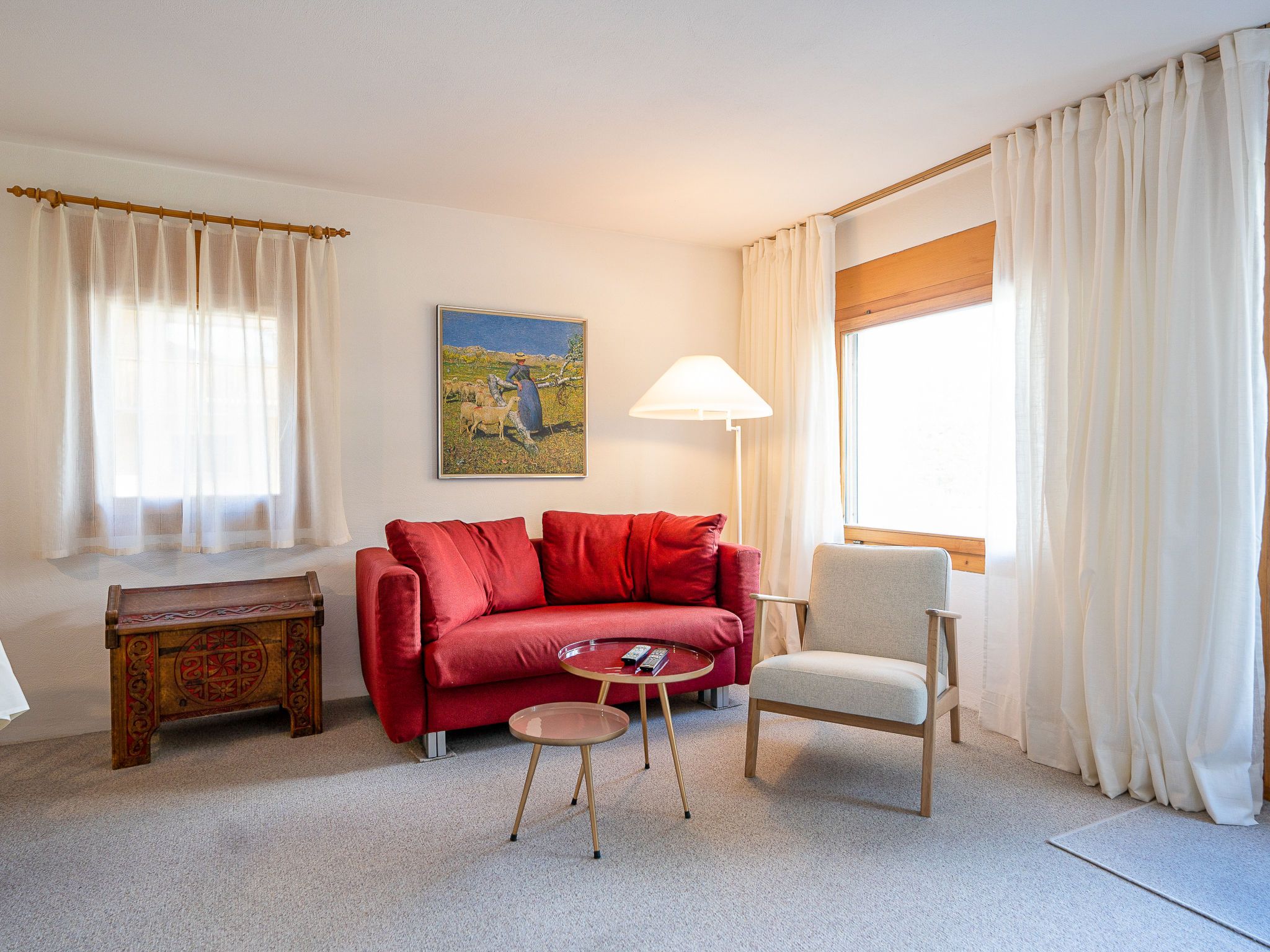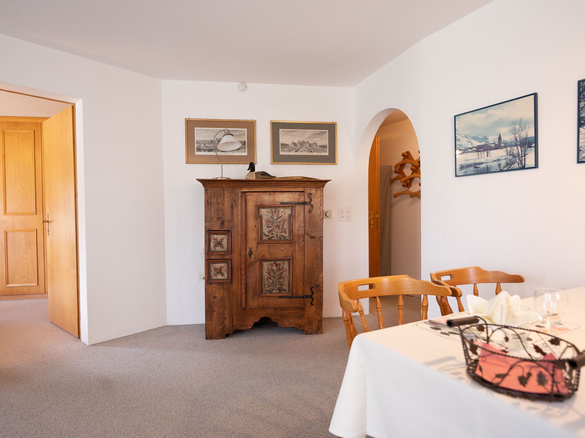 Chesa Pra dSura 217, 2-Zimmer-Wohnung 52 m2 im 1. Stock. Hell, einfach und gemütlich eingerichtet: Wohn-/Esszimmer mit offenem Kamin (nur Deko), TV (Flachbildschirm). Ausgang zum Balkon. 1 Doppelzimmer mit 1 Doppelbett (2 x 90 cm, Länge 200 cm). Kleine Küche (3 Kochplatten, Backofen, Geschirrspüler, Toaster, Wasserkocher, elektrische Kaffeemaschine, Fondue Set (Käse)). Bad/WC. Teppichboden. Balkonmöbel. Schöne Sicht auf die Landschaft und die Ortschaft. Zur Verfügung: Haartrockner. Internet (WLAN, gratis). Garage Nr. 217 (1 Auto), Höhe 200 cm, Breite 210 cm. Bitte beachten: Nichtraucher-Unterkunft.