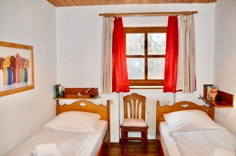 Ein Schlafzimmer mit zwei Einzelbetten, die zu einem Doppelbett zusammengeschoben werden können.