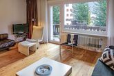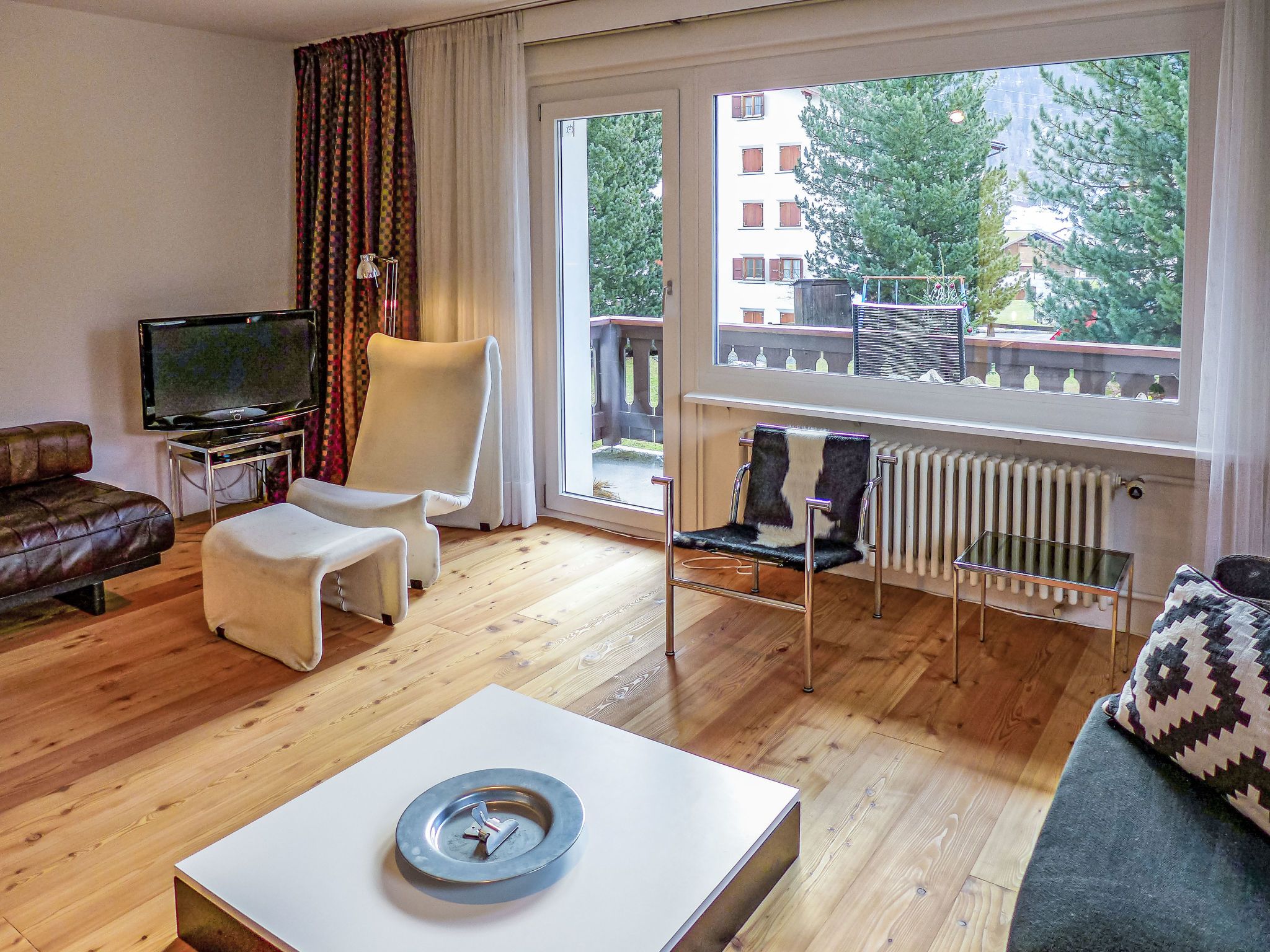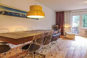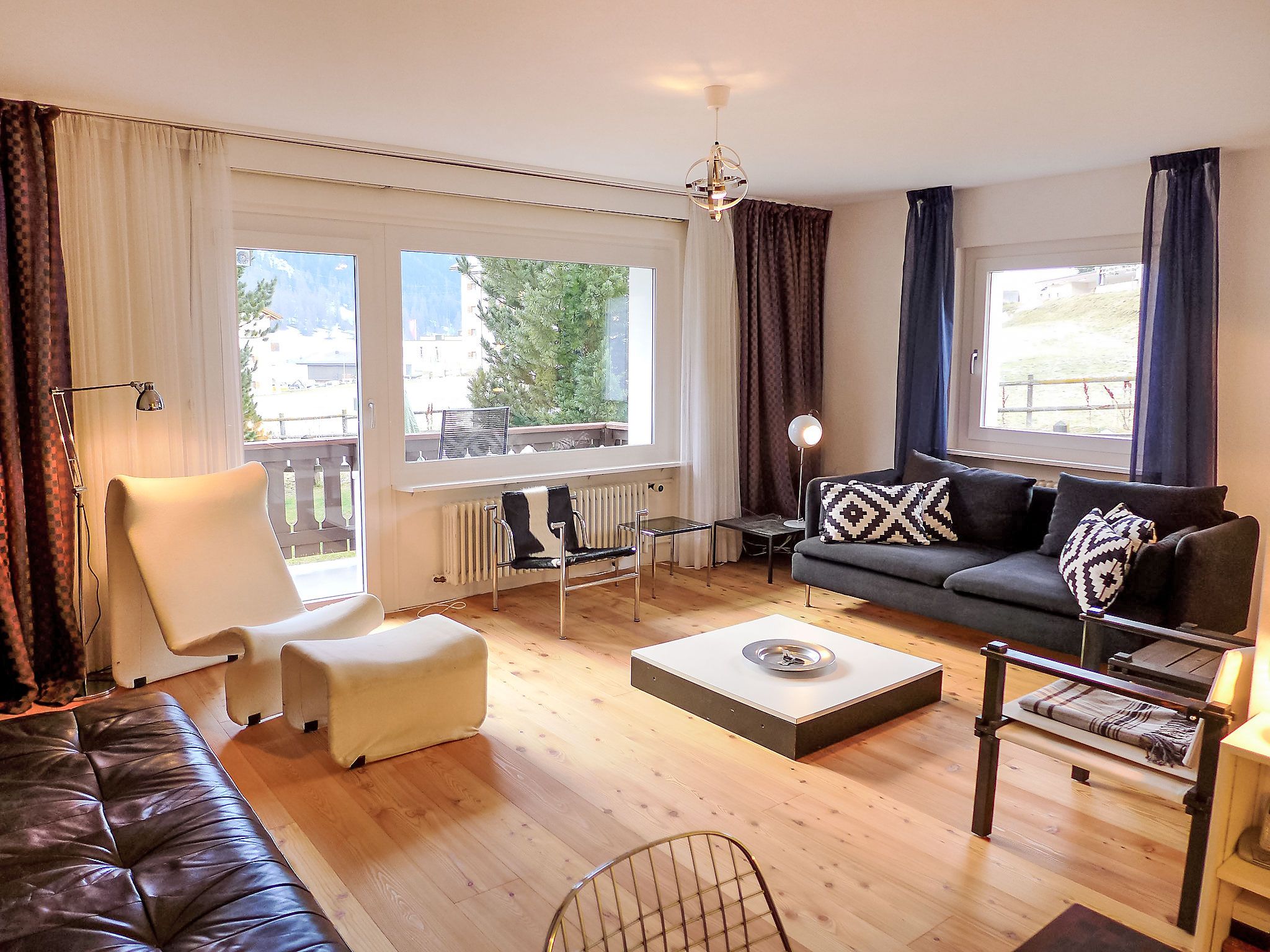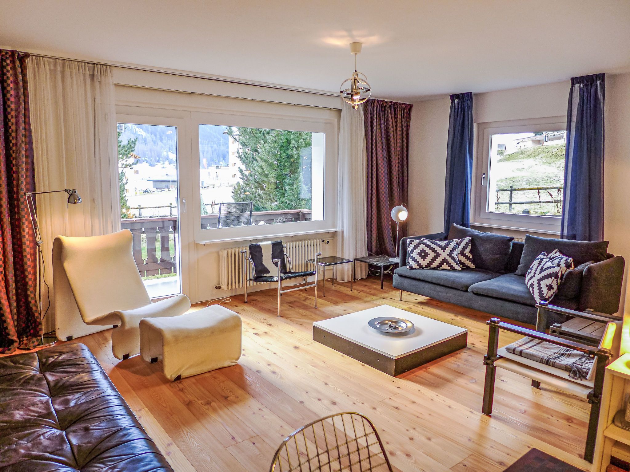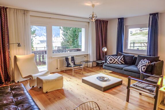 Chesa Vuorcha, 3-Zimmer-Wohnung 100 m2, im erhöhten Erdgeschoss. Geräumig und hell, teilweise renoviert im Jahre 2014, komfortabel und modern eingerichtet: offenes Wohn-/Esszimmer mit TV. Ausgang zum Balkon, Richtung Süden. 1 Zimmer mit 1 Doppelbett (2 x 90 cm, Länge 200 cm). Ausgang zum Balkon. 1 Zimmer mit 1 Doppelbett (2 x 90 cm, Länge 200 cm). Kleine, offene Küche (Backofen, Geschirrspüler, 4 Glaskeramikplatten, Toaster, Wasserkocher, elektrische Kaffeemaschine, Kapseln für die Kaffeemaschine (Nespresso) extra, Fondue Set (Chinoise, Käse)). Bad/WC, sep. WC. Heizung. Holzdielenboden. Schöne Sicht auf die Berge und die Landschaft. Zur Verfügung: Haartrockner. Internet (Wireless LAN, gratis). Parkplatz, Garage Nr. Cramer, Höhe 200 cm, Breite 220 cm. Bitte beachten: geeignet für Familien. Nichtraucher-Unterkunft. Maximal 1 Haustier/Hund erlaubt.