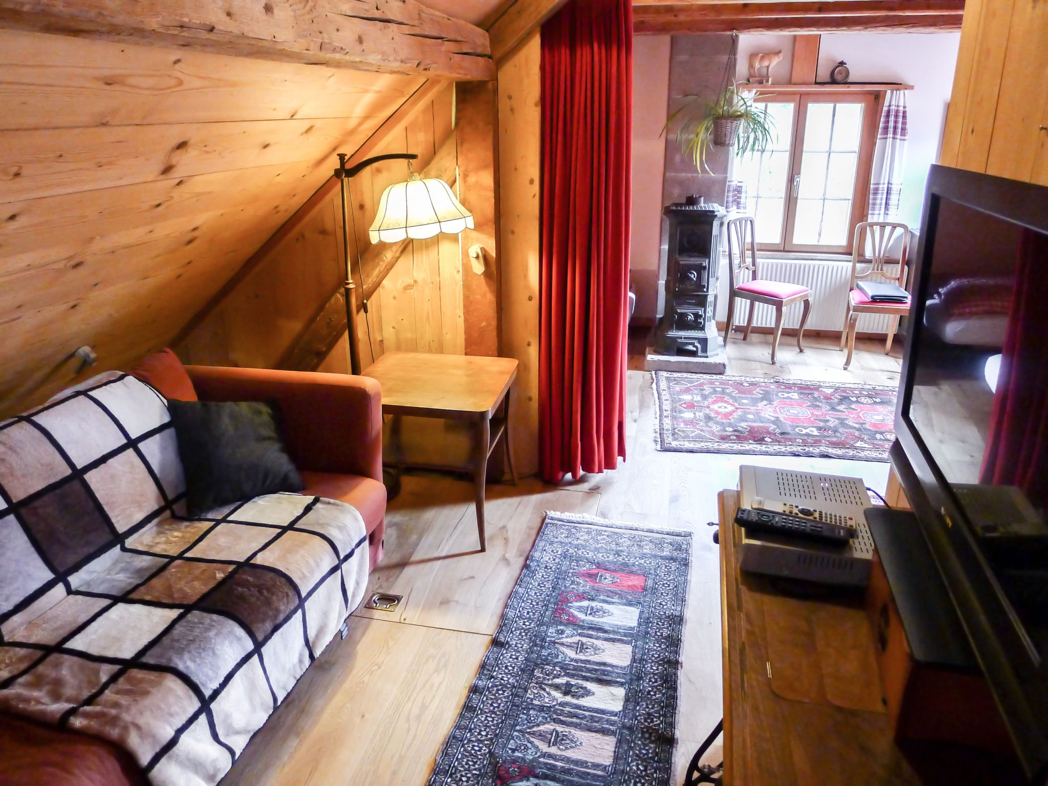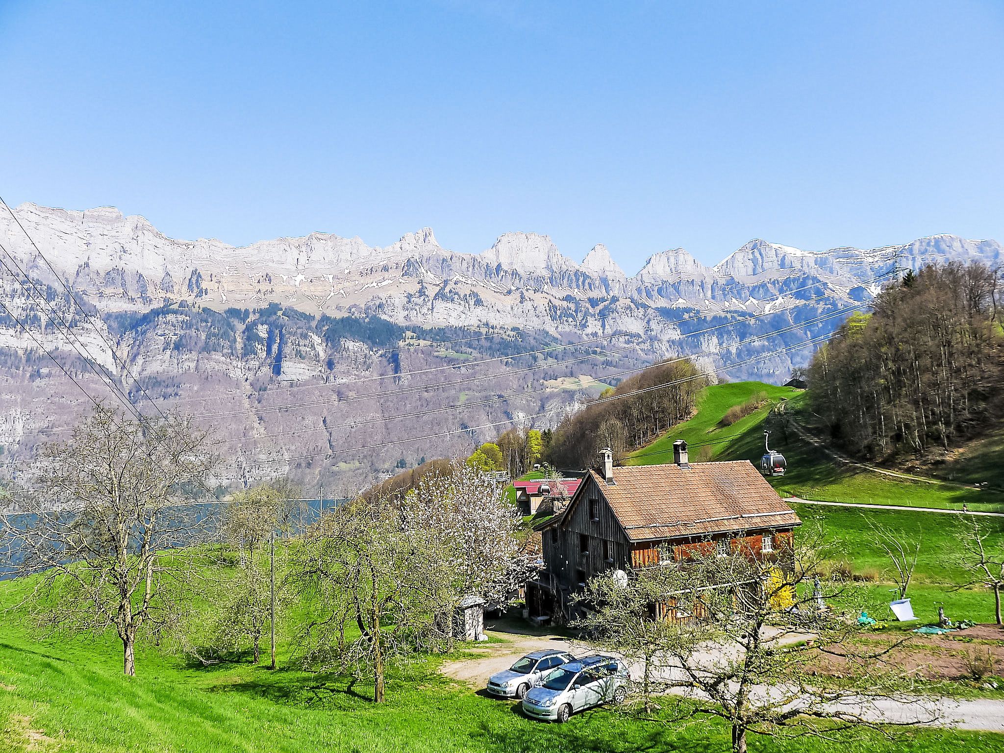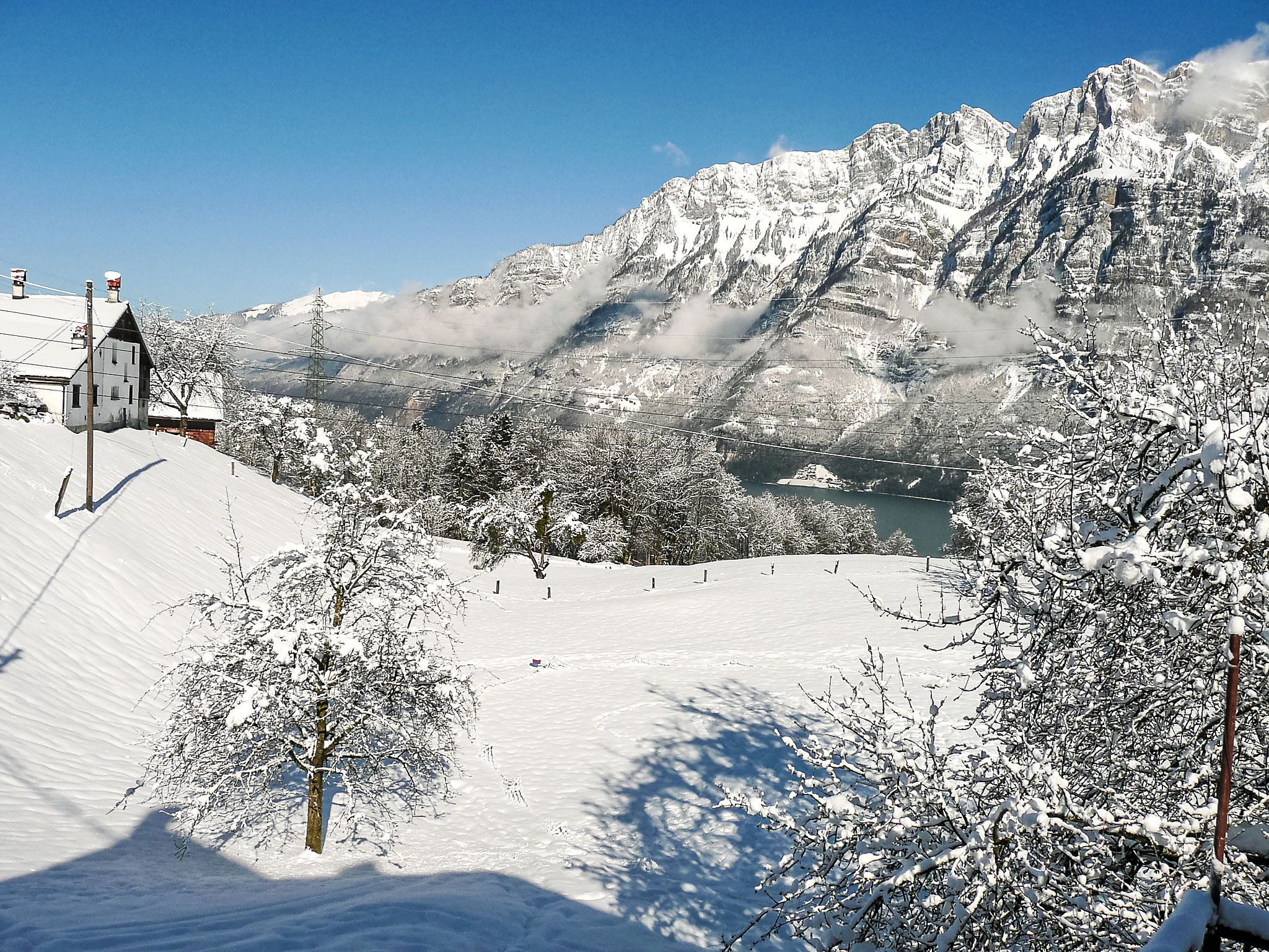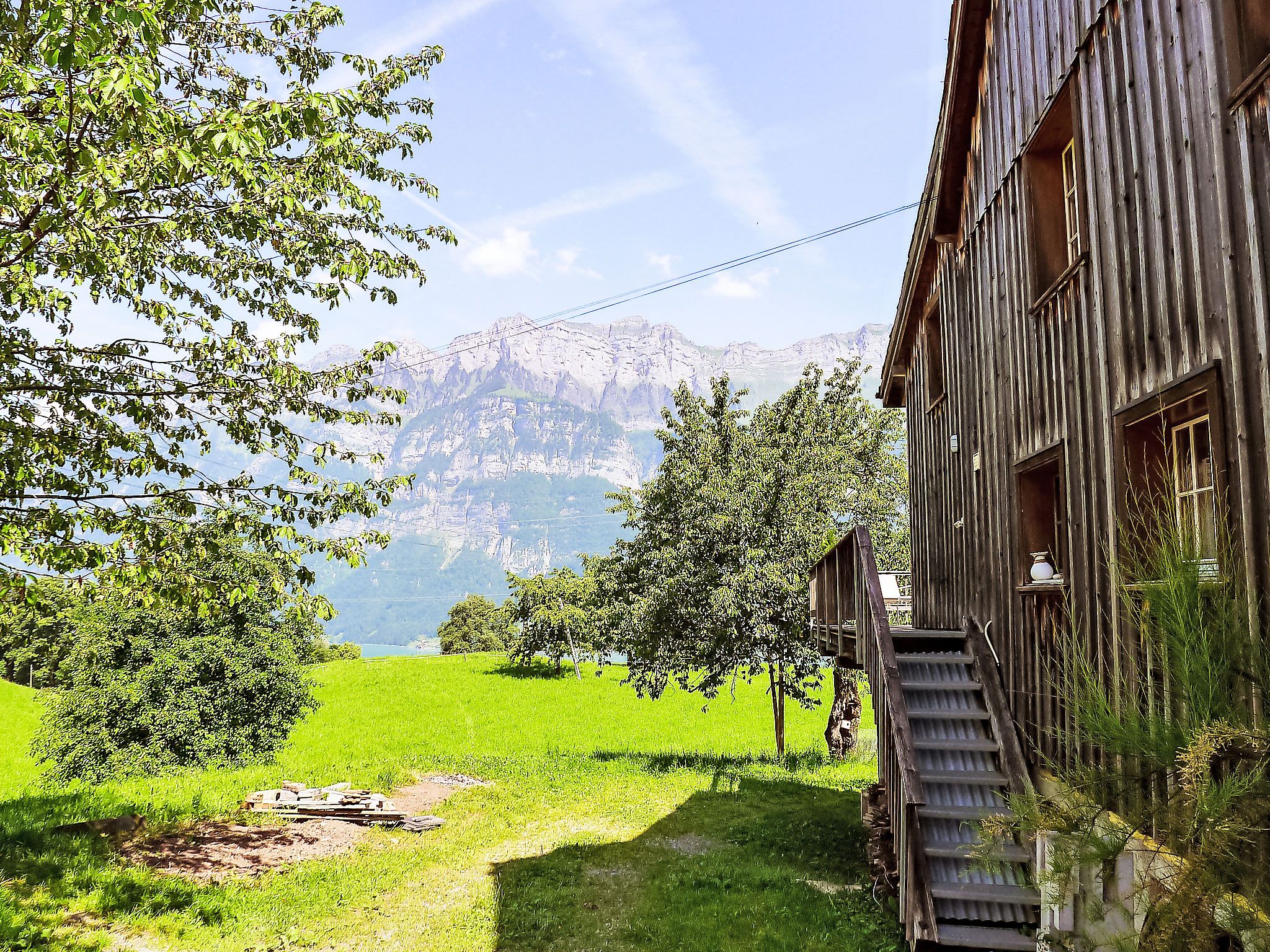 Bünten, 3-Zimmer-Wohnung 55 m2 auf 2 Stockwerken im 1. Stock. Einfach und gemütlich eingerichtet: Wohnküche (Backofen, Geschirrspüler, 4 Glaskeramikplatten, Racletteofen, Fondue Set (Käse)) mit Esstisch. Obergeschoss: (steile Treppe) offenes Wohn-/Schlafzimmer mit Vorhang mit 3 Betten und Sat-TV (Flachbildschirm). 1 Zimmer mit 2 Betten. Dusche/WC. Grosse Terrasse. Terrassenmöbel. Schöne Sicht auf den See, die Berge und die Landschaft. Zur Verfügung: Internet (Wireless LAN, gratis). Parkplatz beim Haus. Bitte beachten: Nichtraucher-Unterkunft. Separater Eingang. Wohnküche über eine Treppe und Schlafzimmer über eine steile Estrichleiter erreichbar. Nicht geeignet für ältere Leute und Kleinkinder. Holzböden.
