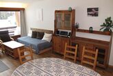 Große, helle, gemütliche, gut ausgestattete 3-Zimmer-Wohnung, 3. Etage (Aufzug) mit ca. 81 m² Wohnfläche: Eingang in Flur mit Garderobe. Wohn-/Schlafraum mit Einzelbett und Ausziehbett (je 0,9 x 2m), offener Kamin (Holz gegen Bezahlung), Eßplatz und Ausgang auf überdachten Südbalkon mit Panoramablick und Mobiliar. Küche mit Einbauherd (3 Platten, Backofen), Geschirrspüler, Mikrowelle, Kühlschrank mit Gerfierfach, Toaster, Kaffeemaschine, Wasserkocher, Fondue-Rechaud und Raclette-Gerät. Großes Zweibetzimmer mit Blick auf Lift und Pisten hinüber in das Sigebiet nach Veysonnaz. Bad. Sep.WC. Interne Verbindungstür zu separatem Studio mit 2x Enzelbett, kleine Kochnische (2 Platten, Mikrowelle, Minibackofen, Kaffeemaschine, Wasserkocher, Toaster) und Dusche/WC.