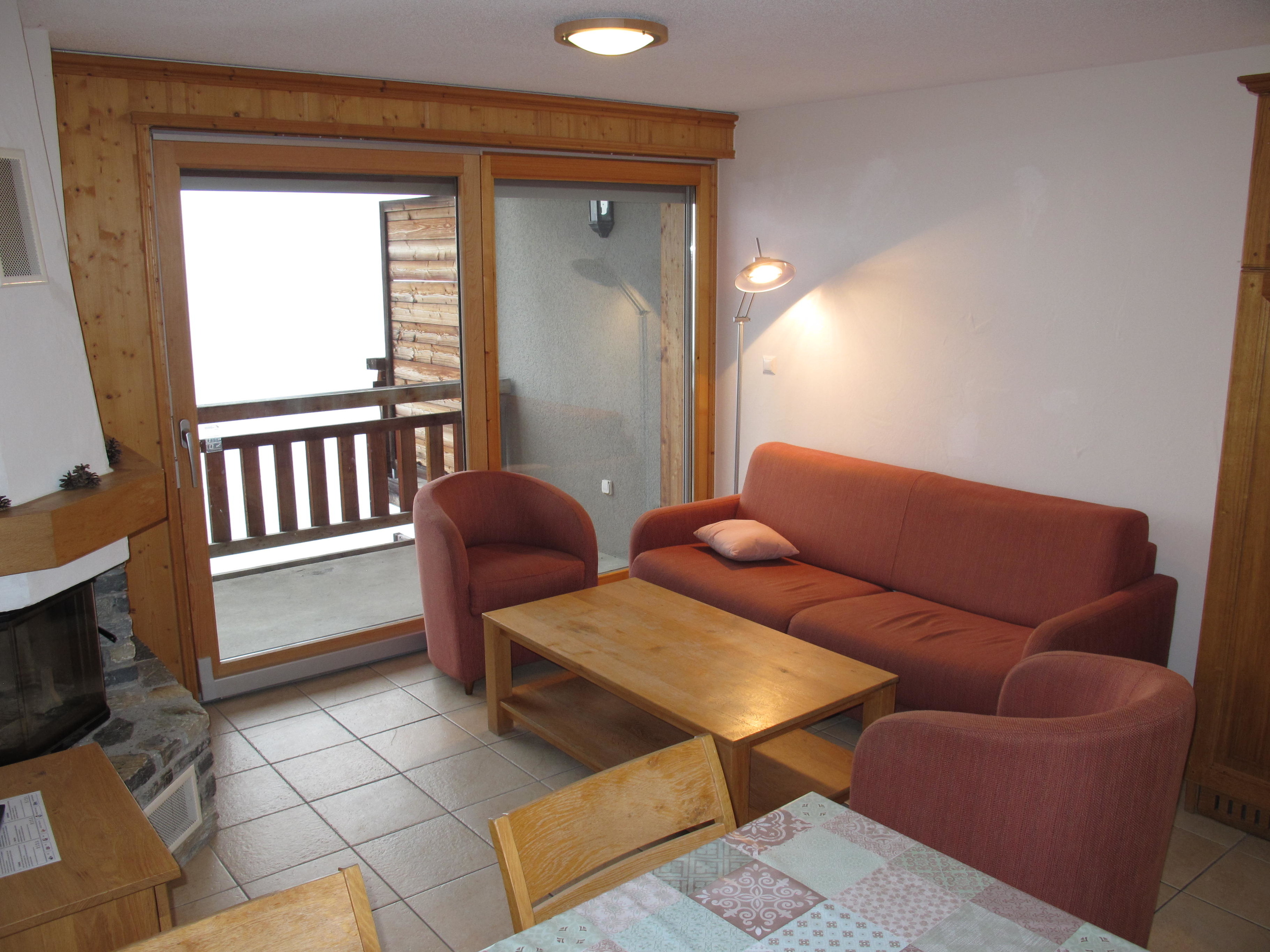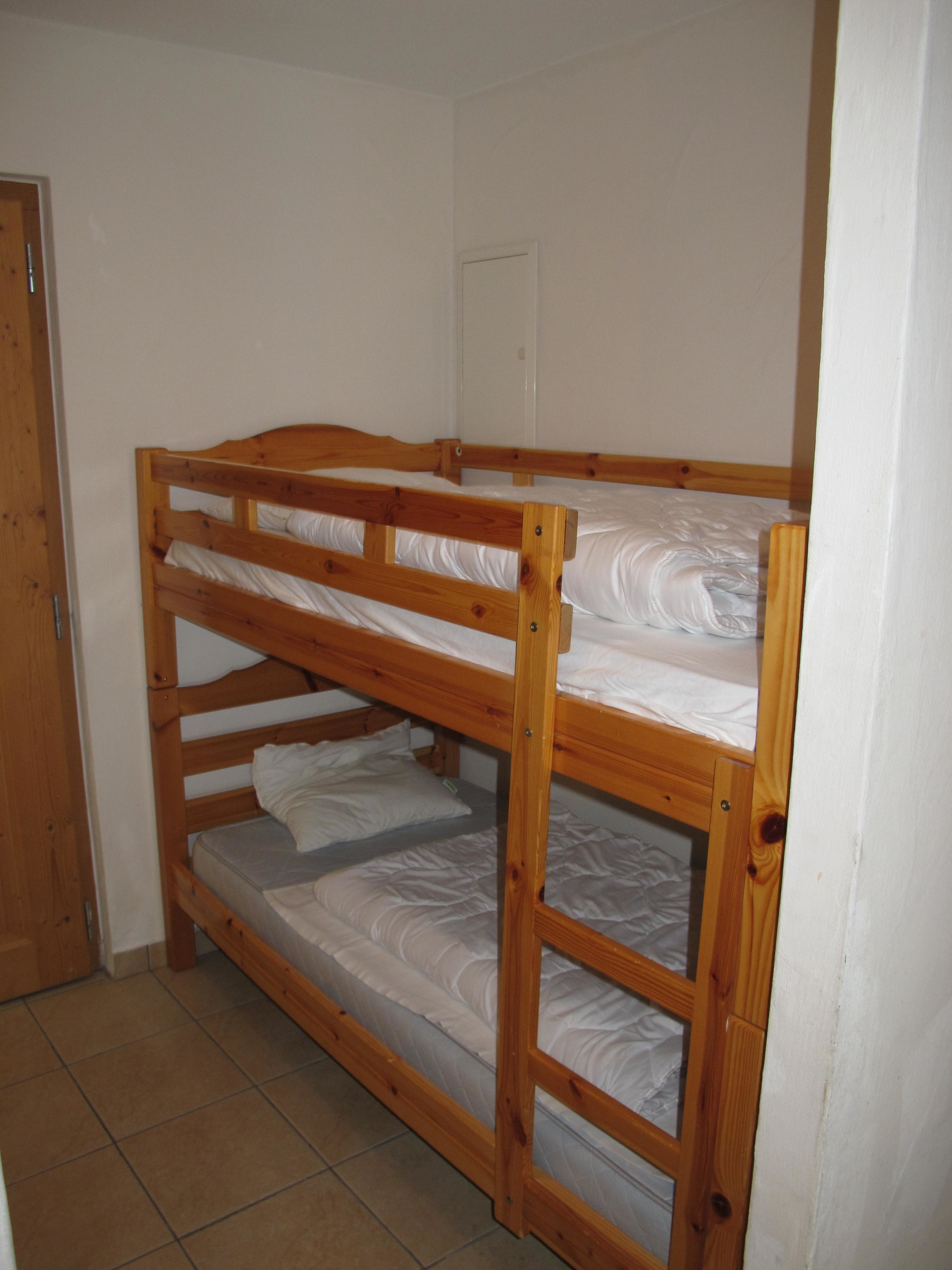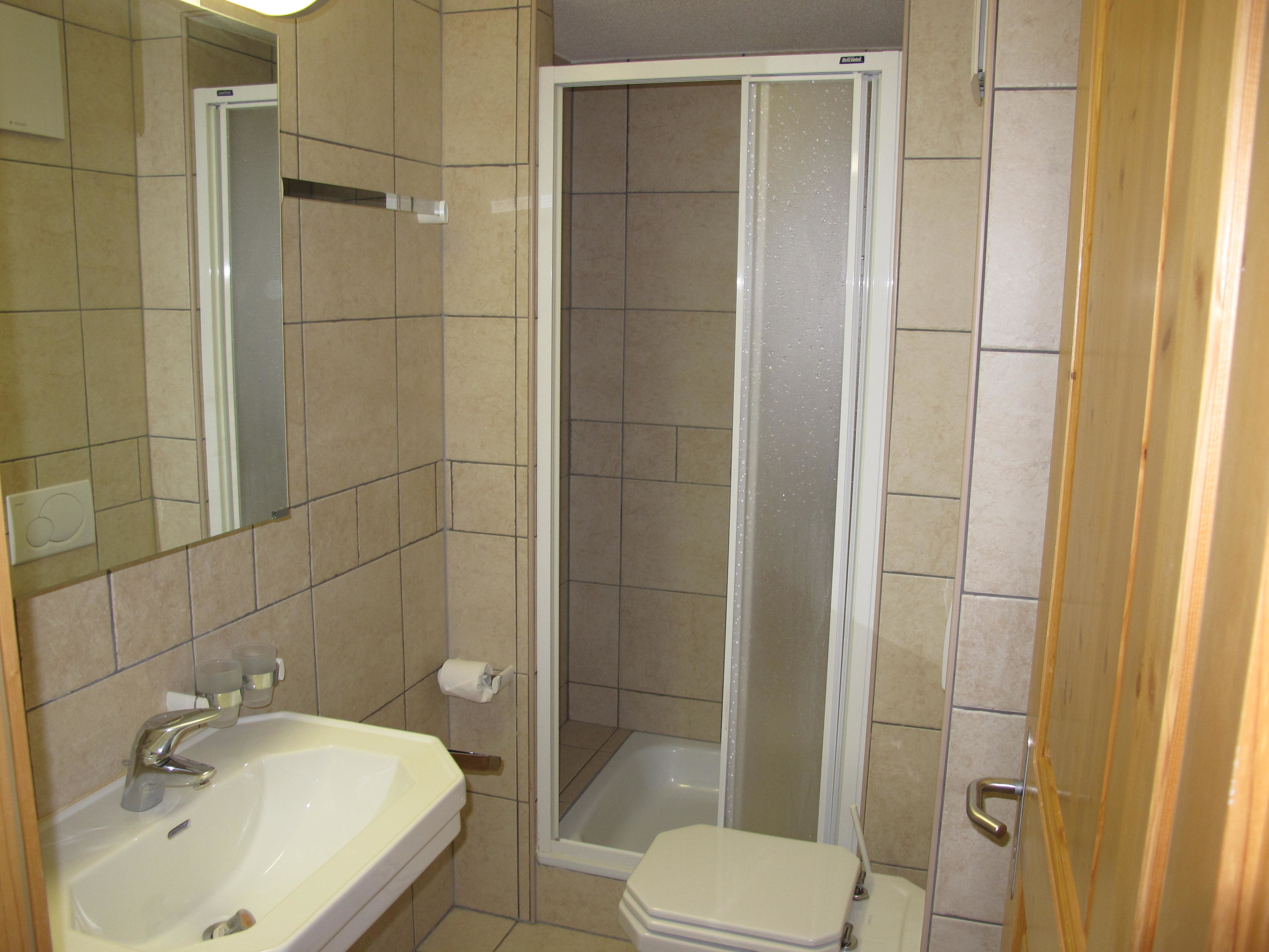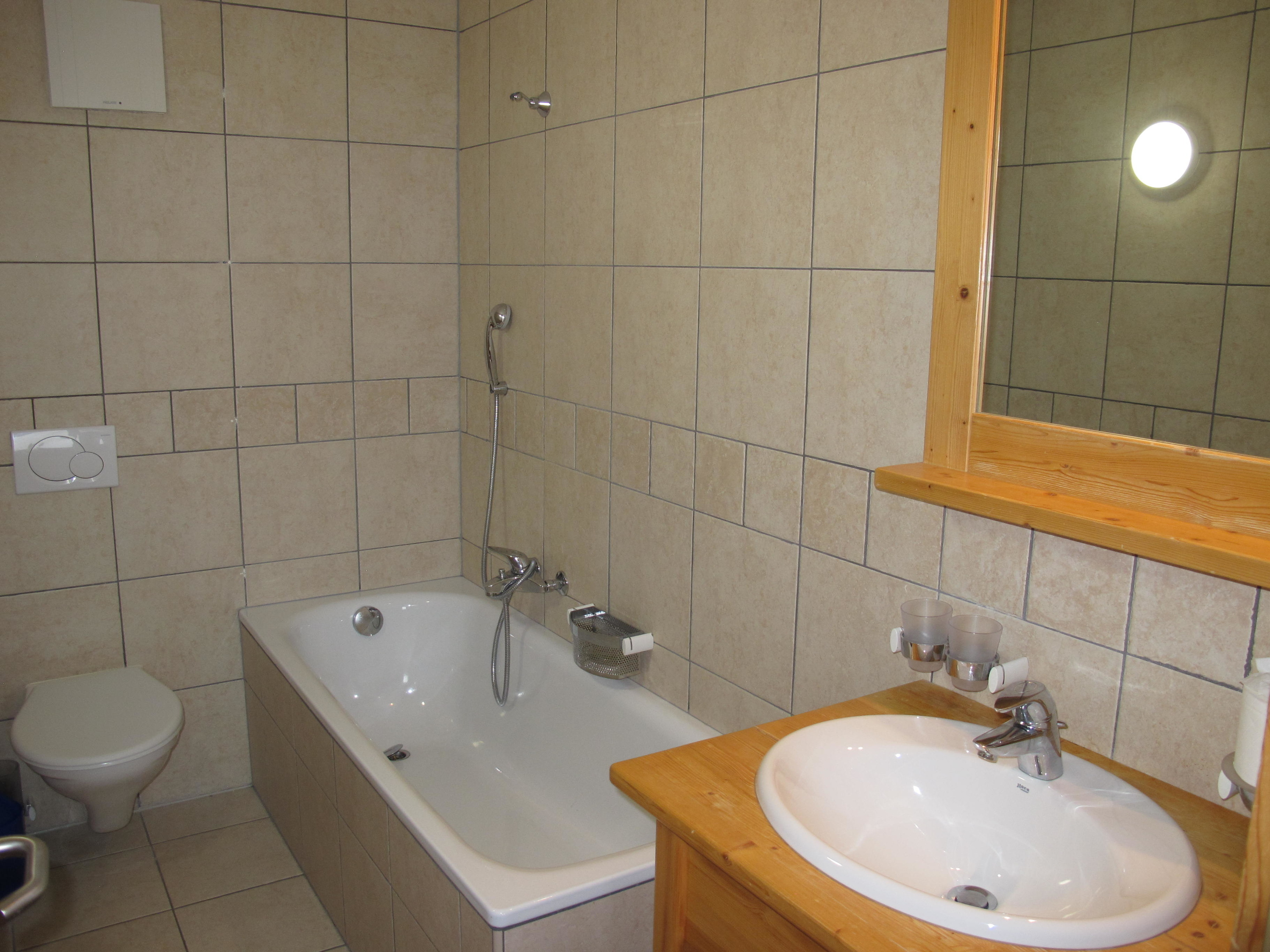 2,5-Zimmer-Wohnung MARMOTTE, 1. Etage, ca. 55 m²: Flur mit Garderobe und Etagenbett; vom Flur offener Übergang zu hellem Wohn-/Schlafraum mit Sitzgruppe, Doppelbettcouch, Kamin, Eßplatz und Balkonausgang. Offene Küche mit Einbauherd (4 Ceranfelder, Backofen), Mikrowelle, Geschirrspüler, Kühlschrank mit großem Gefrierfach, Kaffeemaschine, Wasserkocher, Toaster, Fondue- und Raclette-Gerät. Doppelzimmer mit eigenem Bad/WC mit Doppelwaschecken. Weitere Dusche/WC.