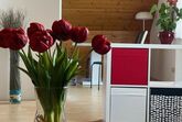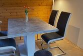 • Gemütlicher Essbereich mit 4 Schwingsesseln, 2 Hockern, Stehlampe.