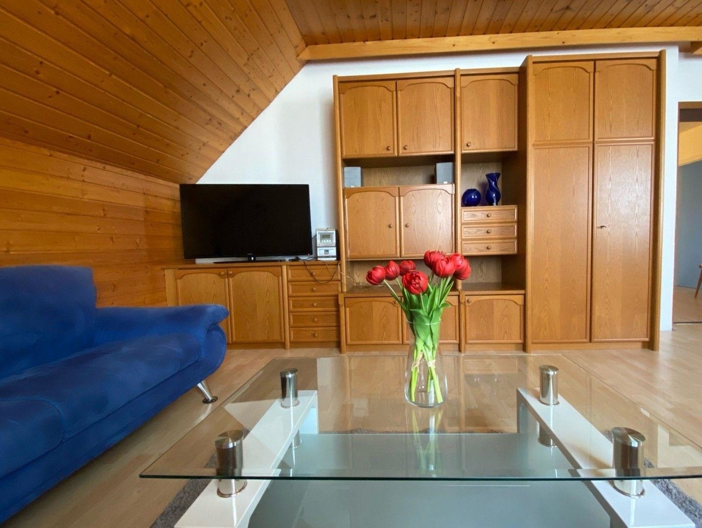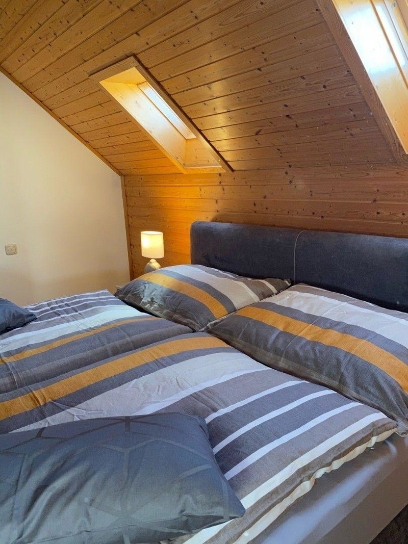 Im 2. Stock (breiter Stiegenaufgang) befindet sich die abgeschlossene Ferienwohnung „Apartment Sauvignon Blanc“. Modernes wurde mit Bestand kombiniert. Die Räume sind hell und sonnig, reizvoll mit Dachschräge und Holz. Wir finden diese Wohnung mit faszinierendem Ausblick auf Park/Dachlandschaft, Musikschule und Stadtpfarrkirche „richtig peppig“. Platz ausreichend vorhanden, Charme ebenso.