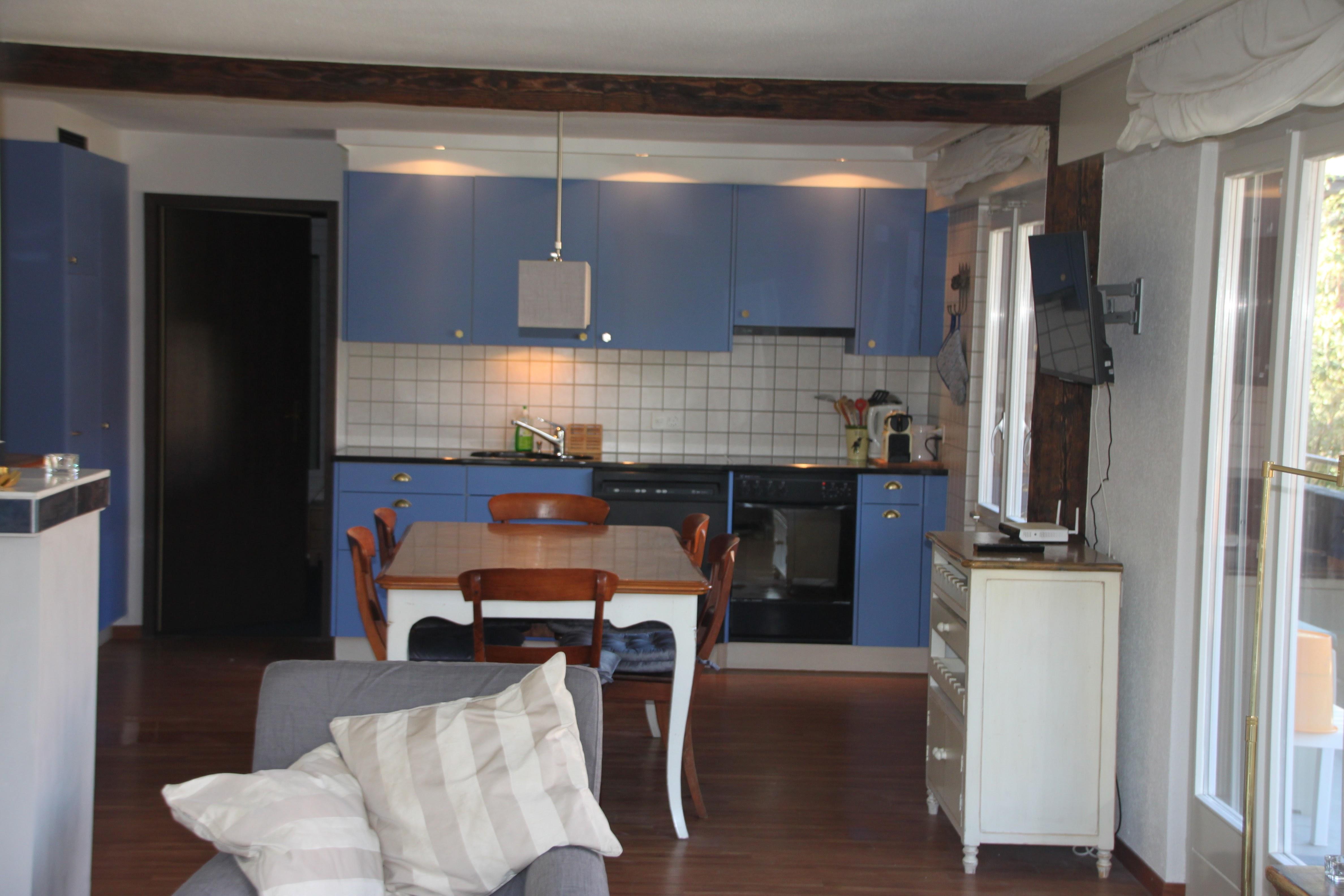 4-Zimmerwohnung (98 m2) im 2. Stock in einem Mehrfamilienhaus mit 8 Wohnungen. 3 Schlafzimmer mit je 2 Einzelbetten. Duvets nordisch, Bettwäsche vorhanden. Wohn-Essküche mit Backofen, Kühlschrank, Geschirrspüler. Wohnzimmer mit Kabel-TV, Radio, WLAN. Bad/WC, Dusche/WC. 2 Balkone mit schöner Aussicht, Parkplatz in Einstellhalle, Mitbenützung Waschmaschine, Skiraum, Zentralheizung. Nichtraucherwohnung. Haustiere nicht erlaubt.