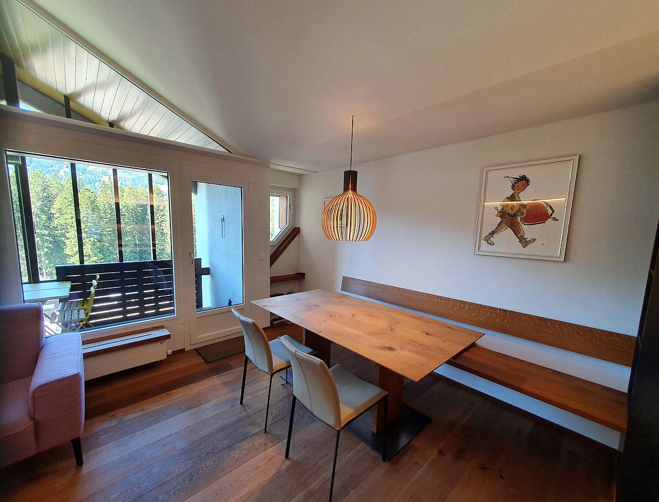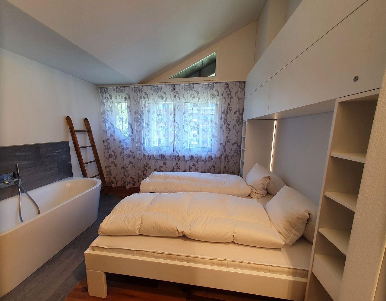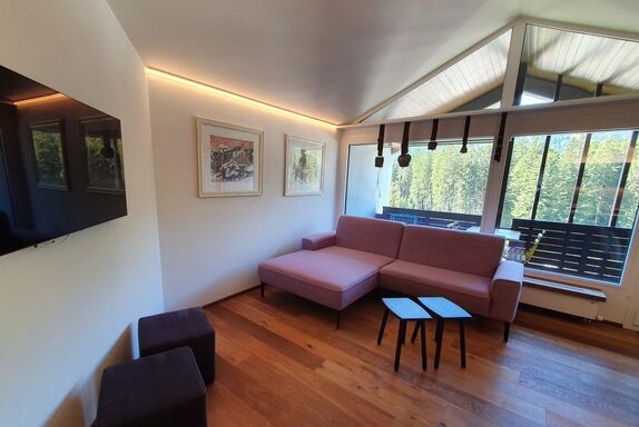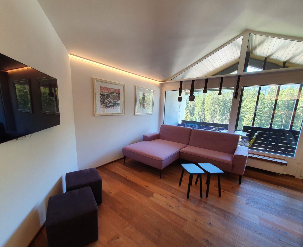 3- Zimmer-Dachwohnung (ca. 67 m²) im Haus Valatscha. Die Wohnung verfügt über ein grosses Wohnzimmer mit integrierter Einbauküche (Geschirrspüler, Backofen, Kühlschrank). Balkon, TV und W-Lan. Ein Schlafzimmer mit Doppelbett und integriertem Badezimmer. Ein Schlafzimmer mit einem Einzelbett im unteren Teil und Doppelbett auf der Galerie. Dusche/WC.
