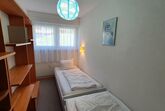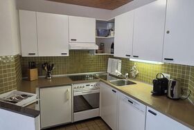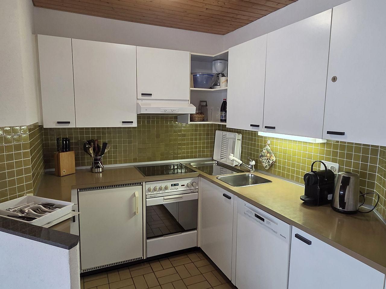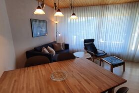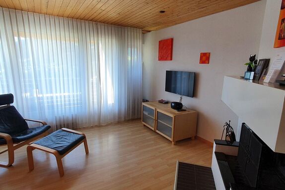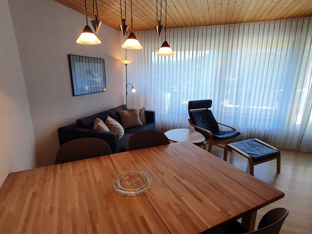 3- Zimmer-Wohnung (ca. 57 m²) im Haus Miez. Die Wohnung verfügt über ein grosses Wohnzimmer mit integrierter Einbauküche (Geschirrspüler, Backofen, Kühlschrank). Offener Kamin, Balkon, TV und W-Lan. Ein Schlafzimmer mit Kajütenbett und ein Schlafzimmer mit Doppelbett. Bad, separates WC.