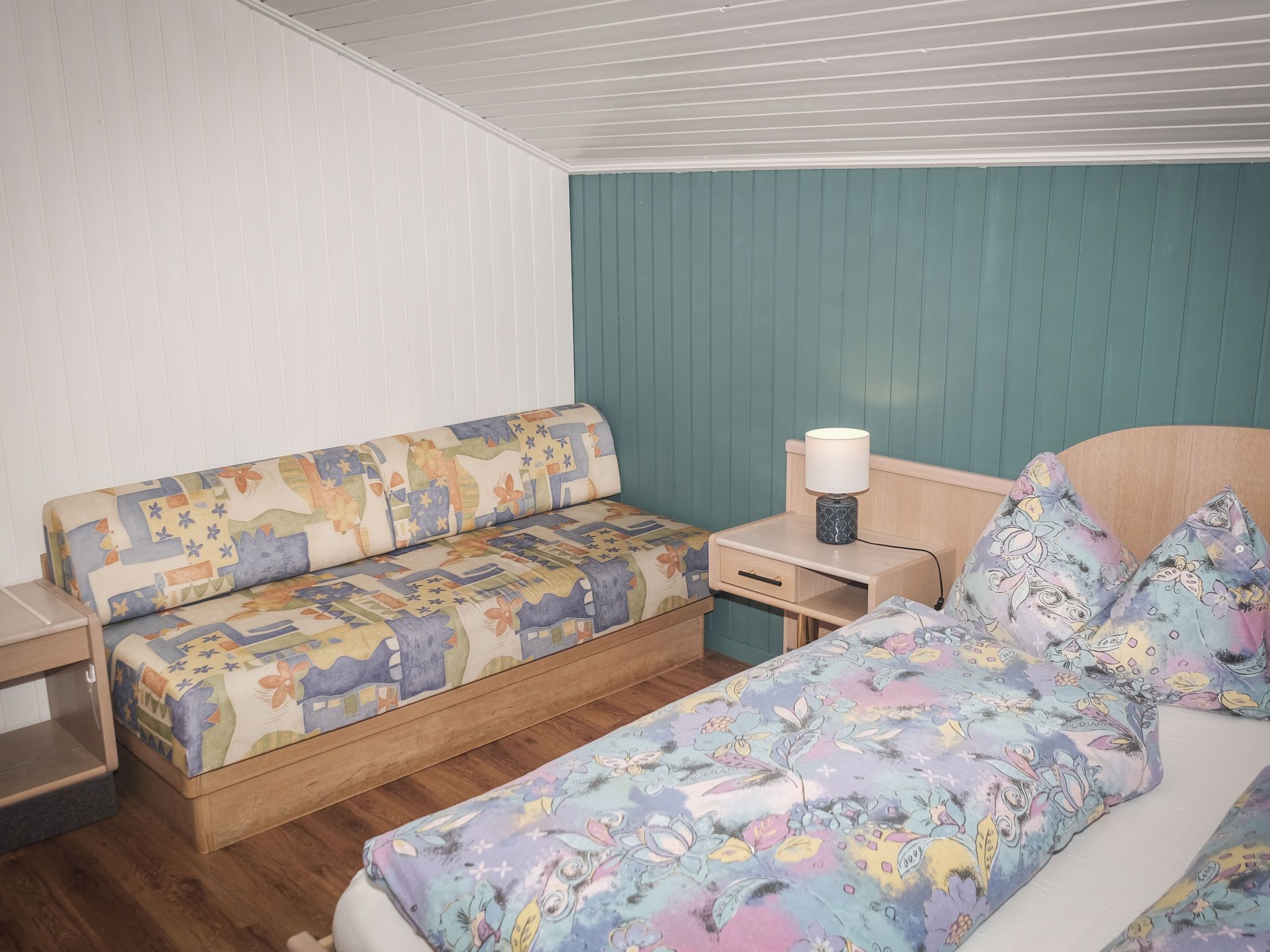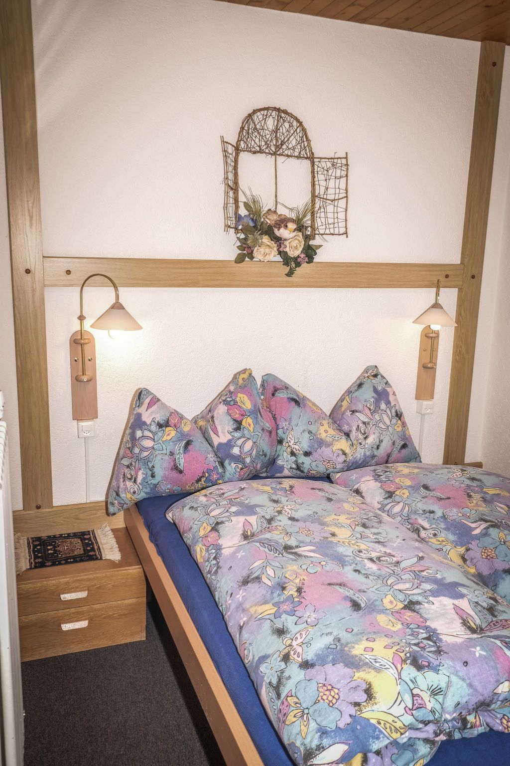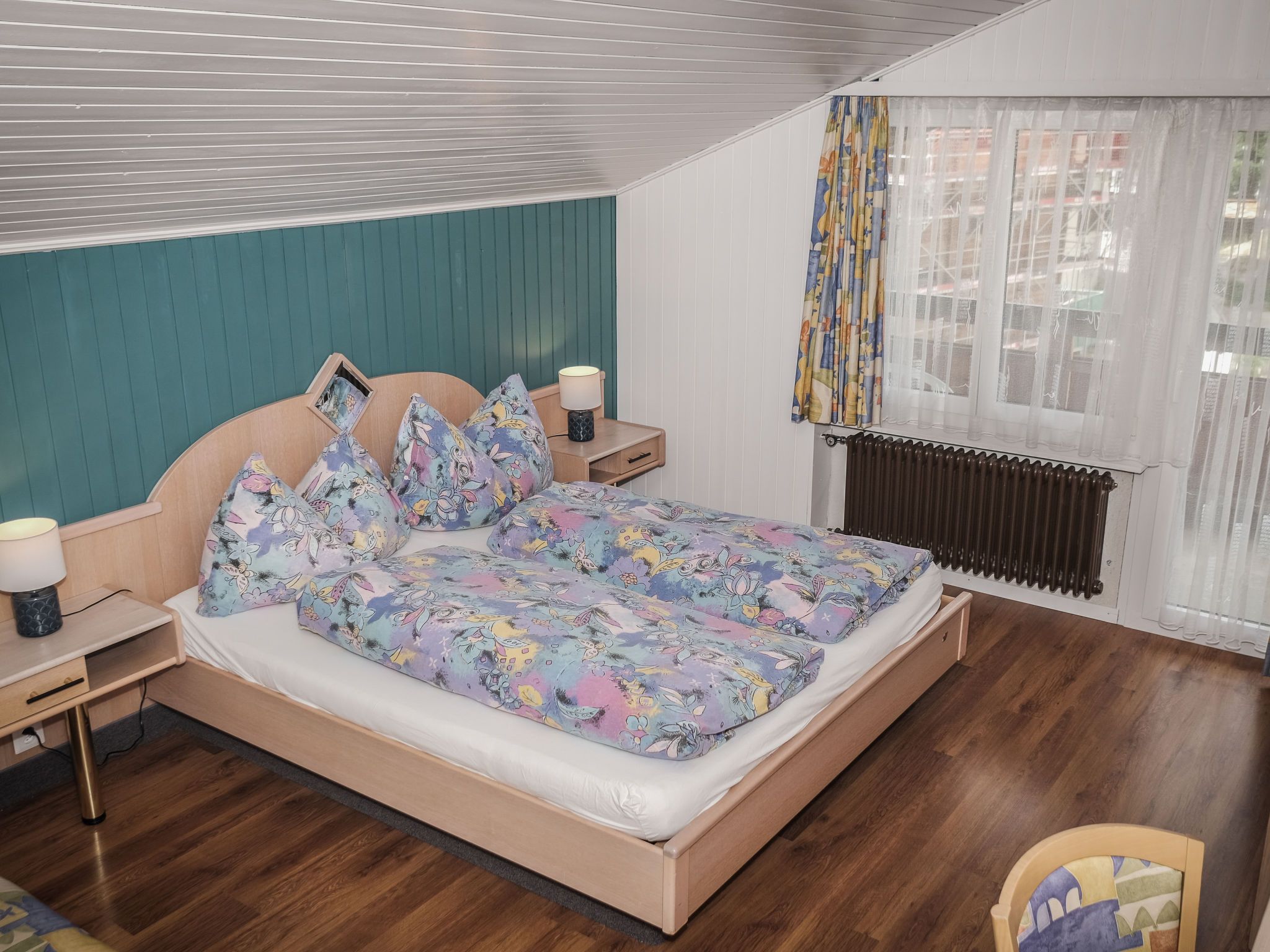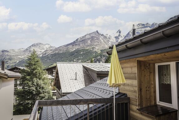 4-Zimmer-Wohnung 120 m2, im Dachgeschoss, Südlage. Gemütlich eingerichtet: abgeschrägt mit 2 Wandschrankbetten und Sat-TV (Flachbildschirm), Radio und DVD. Ausgang zum Balkon. 1 Doppelzimmer. Ausgang zum Balkon. 2 Zimmer, jedes Zimmer mit 2 Betten und Waschbecken. Ausgang zum Balkon. Küche (3 Kochplatten, Backofen, Geschirrspüler, Wasserkocher, Mikrowelle, elektrische Kaffeemaschine, Fondue Set (Käse)) mit Esstisch. Dusche/WC. Ölheizung. Balkon, Südlage. Balkonmöbel, Liegestühle (2). Panoramasicht auf die Berge und die Ortschaft. Zur Verfügung: Kinderhochstuhl. Internet (Wireless LAN, gratis). Bitte beachten: Nichtraucher-Unterkunft.