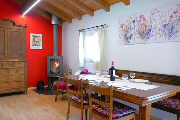 Casa Felice, 5-Zimmer-Haus 70 m2 auf 2 Stockwerken, Südlage. Geräumig, renoviert, komfortabel und gemütlich eingerichtet: offenes Wohn-/Esszimmer mit offenem Kamin, Esstisch, Sat-TV, Radio und Holzofen. Ausgang zur Terrasse. Offene Küche (4 Kochplatten, Backofen, Geschirrspüler, Toaster, Wasserkocher, Mikrowelle, elektrische Kaffeemaschine, Kapseln für die Kaffeemaschine (Chicco d'oro) extra, Racletteofen, Fondue Set (Käse)) mit Bar. Bad, Dusche/WC, sep. WC. E-Heizung, Holzheizung. Obergeschoss: 1 Zimmer mit 1 Doppelbett (1 x 160 cm, Länge 200 cm). Durchgangszimmer mit 2 Betten (90 cm, Länge 200 cm). 1 offenes Zimmer mit 1 Bett (90 cm, Länge 200 cm). Holzdielenboden, Parkettboden. Garten. Terrassenmöbel, Gartengrill, Liegestühle (2), Sitzplatz. Schöne Sicht auf die Berge und die Landschaft. Zur Verfügung: Waschmaschine, Kinderhochstuhl, Babybett bis 2 Jahre (extra), Haartrockner. Internet (WLAN, gratis). Bitte beachten: Nichtraucher-Haus. Maximal 3 Haustiere/Hunde erlaubt. Ihre Haustiere sind herzlich willkommen! NL-