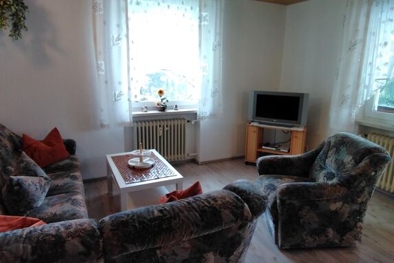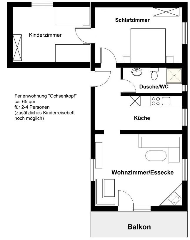 Ferienwohnung Ochsenkopf ca. 65 m² für 2-4 Personen Südbalkon; Wohnzimmer mit Essecke, Sat-TV, DVD-Player und CD-Radio; ein Doppelzimmer, ein Kinderzimmer mit zwei Einzelbetten; komplett ausgestattete Küche mit E-Herd und Backofen; Dusche/WC